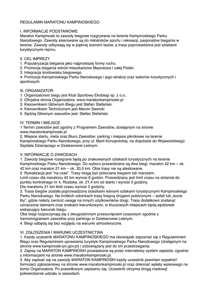 REGULAMIN MARATONU KAMPINOSKIEGO I. INFORMACJE PODSTAWOWE Maraton Kampinoski to zawody biegowe rozgrywane na terenie Kampinoskiego Parku Narodowego. Zawody skierowane są do miłośników sportu i rekreacji, pasjonatów biegania w terenie. Zawody odbywają się w pięknej scenerii lasów, a trasa poprowadzona jest szlakami turystycznymi rejonu. II. CEL IMPREZY 1. Popularyzacja biegania jako najprostszej formy ruchu. 2. Promocja biegania wśród mieszkańców Mazowsza i całej Polski. 3. Integracja środowiska biegowego. 4. Promocja Kampinoskiego Parku Narodowego i jego atrakcji oraz walorów turystycznych i sportowych. III. ORGANIZATOR 1. Organizatorem biegu jest Klub Sportowy Ekobiegi sp. z o.o.. 2. Oficjalna strona Organizatora: www.maratonkampinoski.pl 3. Kierownikiem Głównym Biegu jest Stefan Stefański. 4. Kierownikiem Technicznym jest Marcin Sawicki 5. Sędzią Głównym zawodów jest: Stefan Stefański. IV. TERMIN I MIEJSCE 1 Termin zawodów jest zgodny z Programem Zawodów, dostępnym na stronie www.maratonkampinoski.pl 2. Miejsce startu, meta oraz Biuro Zawodów: parking i miejsce piknikowe na terenie Kampinoskiego Parku Narodowego, przy ul. Marii Konopnickiej, na dojeździe do Wojewódzkiego Szpitala Dziecięcego w Dziekanowie Leśnym. V. INFORMACJE O ZAWODACH 1. Zawody biegowe rozegrane będą po znakowanych szlakach turystycznych na terenie Kampinoskiego Parku Narodowego. Do wyboru przewidziane są dwa biegi: maraton 42 km – ok. 42 km oraz maraton 21 km – ok. 20,5 km. Obie trasy nie są atestowane. 2. Rywalizacja jest "na czas”. Trasy mogą być pokonane biegiem lub marszem. Limit czasu dla maratonu 42 km wynosi 6 godzin. Przewidziany jest limit czasu na dotarcie do punktu kontrolnego nr 4, Roztoka, ok. 21,4 km od startu i wynosi 3 godziny. Dla maratonu 21 km limit czasu wynosi 3 godziny. 3. Trasa biegów została poprowadzona ścieżkami leśnymi szlakami turystycznymi Kampinoskiego Parku Narodowego. Na krótkich odcinkach trasy biegną drogami publicznymi – asfalt lub „kocie łby”, gdzie należy zwrócić uwagę na innych użytkowników drogi. Trasy dodatkowo zostaną! oznaczone taśmami oraz znakami kierunkowymi, w kluczowych miejscach będą sędziowie wskazujący kierunek biegu. Oba biegi rozpoczynają się z dwugodzinnym przesunięciem czasowym zgodnie z harmonogramem zawodów przy parkingu w Dziekanowie Leśnym. 4. Biegi odbędą się bez względu na warunki atmosferyczne. VI. ZGŁOSZENIA I WARUNKI UCZESTNICTWA 1. Każdy uczestnik MARATONU KAMPINOSKIEGO ma obowiązek zapoznać się z Regulaminem Biegu oraz Regulaminem uprawiania turystyki Kampinoskiego Parku Narodowego (dostępnym na stronie www.kampinoski-pn.gov.pl) i zobowiązany jest do ich przestrzegania. 2. Zapisy na MARATON KAMPINOSKI prowadzone są przez internetowy system zapisów, zgodnie z informacjami na stronie www.maratonkampinoski.pl. 3. Aby zapisać się na zawody MARATON KAMPINOSKI każdy uczestnik powinien wypełnić! formularz zgłoszeniowy na stronie www.maratonkampinoski.pl oraz dokonać wpłaty wpisowego na konto Organizatora. Po prawidłowym zapisaniu się, Uczestnik otrzyma drogą mailową! potwierdzenie udziału w zawodach. 4. Limit uczestników MARATONU KAMPINOSKIEGO wynosi 400 miejsc na dystansie 21 km i 100 miejsc na dystansie 42 km. 5. Jeśli pozostaną wolne miejsca jest możliwość zapisania się w dniu zawodów w Biurze Zawodów. 6. W biegach prawo startu mają wyłącznie osoby, które najpóźniej w dniu zawodów ukończą 18 lat i nie mają przeciwwskazań zdrowotnych do uprawiania długodystansowych sportów biegowych. 7. Jakakolwiek zamiana miejsc na listach startowych może się odbyć wyłącznie za zgodą i wiedzą! Organizatora. Samodzielne przekazanie numeru startowego innej osobie, bez powiadomienia o tym fakcie Organizatora, skutkuje dyskwalifikacją zawodnika. 8. Dane osobowe uczestników będą wykorzystane wyłącznie na potrzeby organizacji biegu. VII. KLASYFIKACJE 1. Podczas MARATONU KAMPINOSKIEGO prowadzona będzie klasyfikacja generalna OPEN kobiet i mężczyzn dla obu dystansów. Nie przewiduje się klasyfikacji wiekowych. 2. Organizator zastrzega sobie prawo do wprowadzenia dodatkowych klasyfikacji w zależności od warunków imprezy. 3. Dyskwalifikacja zawodnika w trakcie zawodów nastąpi w przypadku: - łamania regulaminów zawodów oraz przepisów KPN, - zejście z oznaczonej trasy biegu, - zgubienia numeru startowego dostarczonego przez organizatora, - gdy numer startowy nie będzie widoczny dla sędziów w trakcie trwania zawodów. VIII. ŚWIADCZENIA 1. Każdy uczestnik otrzyma numer startowy. 2. Organizator zapewnia wodę mineralną, niegazowaną w plastikowych kubkach na wybranych punktach kontrolnych oraz na mecie na trasach obydwu biegów. Na trasie maratonu 42 km są to: PK 1 - 8,8 km (Cmentarz Palmiry), PK 2 - 11,4 km (szlak czerwony, punkt rozejścia się maratonu i półmaratonu), PK 3 - 16,6 km (Pomnik Niepodległej Rzeczypospolitej Kampinoskiej), PK 4 – 21,4 km (Roztoka), PK 5 – 27,0 km (Pomnik Niepodległej Rzeczypospolitej Kampinoskiej), PK 6 – 34,4 km (połączenie szlaków zielonego i niebieskiego), META – ok. 42 km. Dodatkowo na PK 4 oraz PK 6 przewidziano ciasteczka, rodzynki. Na PK 2 nie przewiduje się! wody. Na trasie maratonu 21 km są to: PK 1 - 8,8 km (Cmentarz Palmiry), PK 2 - 11,4 km (szlak czerwony, punkt rozejścia się maratonu i półmaratonu), PK 3 - 13,0 km (połączenie szlaków zielonego i niebieskiego), META – 20,5 km. Na PK 2 nie przewiduje się wody. Na punkcie PK 3 przewidziano rodzynki i ciasteczka. Punkt PK 6 na trasie maratonu 42 km jest w tym samym miejscu co PK 3 na trasie maratonu 21 km. 3. Na mecie przewidziany jest posiłek regeneracyjny. 4. Każdy kto ukończy maraton otrzyma medal pamiątkowy. 5. Zwycięzcy zawodów otrzymają dyplomy, puchary oraz nagrody od sponsorów. 6. Każdy uczestnik zawodów ubezpiecza się od następstw nieszczęśliwych wypadków na własną rękę. 7. Na mecie będ