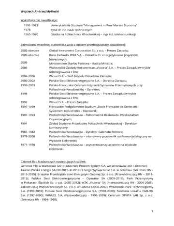 Wojciech Andrzej Myślecki Wykształcenie, kwalifikacje: 1991-1993 Amerykańskie Studium “Management in Free Market Economy” 1978 tytuł dr inż. nauk technicznych 1965-1970 Studia na Politechnice Wrocławskiej – mgr inż. telekomunikacji Zajmowane wcześniej stanowiska wraz z opisem przebiegu pracy zawodowej: 2002-obecnie Global Investment Corporation Sp. z o.o. – Prezes Zarządu; 2009-obecnie Bank Zachodni WBK S.A. – Doradca ds. energetyki oraz projektów 2009 2006 biznesowych; Ministerstwo Skarbu Państwa – Radca Ministra; Wałbrzyskie Zakłady Koksownicze „Victoria” S.A. – Prezes Zarządu (w trybie oddelegowania z RN); 2004-2006 Winuel S.A. – Szef Zespołu Doradców Zarządu; 2000-2002 Polskie Sieci Elektroenergetyczne S.A. – Doradca Zarządu; 1999-2003 Polsko-Francuskie Centrum Inżynierii Systemów Przemysłowych przy Politechnice Wrocławskiej – Dyrektor; 1998 Polskie Sieci Elektroenergetyczne S.A. – Prezes Zarządu (w trybie oddelegowania z RN); 1997 Winuel S.A. - Prezes Zarządu; 1991-1999 Francuskie Podyplomowe Studium „Ecole Francaise de Genie des Systemem Industrieles – Kierownik; 1991-1993 Politechnika Wrocławska – Pełnomocnik Rektora ds. Przekształceń Organizacyjnych; 1991 Zakład Studyjno-Projektowy Politechniki Wrocławskiej – Dyrektor komisaryczny; 1981-1982 Politechnika Wrocławska – Dyrektor Gabinetu Rektora; 1978-2008 Politechnika Wrocławska – mianowany pracownik naukowo-dydaktyczny na Wydziale Elektroniki; 1971-1978 Politechnika Wrocławska – asystent/starszy asystent na Wydziale Elektroniki. Członek Rad Nadzorczych następujących spółek: Generali PTE w Warszawie (2014–obecnie); Procom System S.A. we Wrocławiu (2011-obecnie); Tauron Polska Energia SA (XII.2015–XI.2016); Energa Wytwarzanie S.A. w Gdańsku (Sekretarz RN 2013-2015); Brzeskie Przedsiębiorstwo Energetyki Cieplnej Sp. z o.o. (Przewodniczący RN – 20112015); Polskie Sieci Elektroenergetyczne – Operator SA (2009-2010); Park Przemysłowy w Piekarach Śląskich Sp. z o.o. (2007-2012); WZK „Victoria” SA (Przewodniczący RN - 2006-2008); Zakład Usług Wielobranżowych Sp. z o.o. w Lubinie (2000-2002); Wrocławski Park Technologiczny S.A. (1999-2003); Polskie Sieci Elektroenergetyczne S.A. (1998-2000); Telefonia Lokalna DIALOG S.A. (1997-2000); WINUEL S.A. (Przewodniczący - 1996-1999); Centrum OPHTA LAB Sp. z o.o. (Sekretarz RN - 1994-1998). 1 Ponadto pełnił następujące funkcje doradcze: Członek Rady Programowej Konsorcjum SmartPowerGrid Polska (2010–obecnie); Doradca Zarządu KGHM Polska Miedź S.A. ds. polityki energetycznej (2012); Członek Komisji Budżetu i Finansów Rady Miejskiej Wrocławia (1999-2001); Członek Rady Naukowej Wrocławskiego Centrum Transferu Technologii (1997-2003); Członek Rady Fundacji Rozwoju Politechniki Wrocławskiej (1996-2003); Doradca dyrektora przedsiębiorstwa DOLPASZ we Wrocławiu (1992-1993); Szef Zespołu Doradców Wojewody Wrocławskiego (1992); Współpracownik międzynarodowej firmy konsultingowej AT Kearney (1991-1997); Doradca Zarządu KGHM Polska Miedź S.A. (1991-1993); Doradca ds. polityki gospodarczej Premiera Rządu RP (1991-1992); Członek Zespołu Doradców Ministra Łączności (1976-1990). Marek Pietrzak Wykształcenie, kwalifikacje: 2015-2016 Apsley Business School of London i Wyższa Szkoła Menedżerska w Warszawie – executive master of business administration; 2009-2013 aplikacja radcowska Okręgowa Izba Radców Prawnych w Warszawie – radca prawny; 2001-2006 studia w Wyższej Szkole Handlu i Prawa w Warszawie na Wydziale Prawa – magister prawa; 2000-2004 studia w Prywatnej Wyższej Szkole Businessu i Administracji w Warszawie na Wydziale Ekonomii – magister ekonomii. Zajmowane wcześniej stanowiska wraz z opisem przebiegu pracy zawodowej: 2014 - obecnie Kancelaria Radcy Prawnego – Marek Pietrzak – Właściciel; 2016 – obecnie Polskie Radio Regionalna Rozgłośnia w Warszawie Radio dla Ciebie S.A. – Przewodniczący Rady Nadzorczej; 2015-2016 Bialskie Wodociągi i Kanalizacja „Wod-Kan” Sp. z o.o. – Członek Rady Nadzorczej; 2011-2014 Wodociąg Marecki Sp. z o.o. - Doradca zespołu projektowego ds. prawnych; 2010 Kancelaria Prezydenta Rzeczypospolitej Polskiej - Specjalista w Biurze Prawa i Ustroju; 2007 – 2008 Mazowiecki Urząd Wojewódzki - Referent prawny w Wydziale Prawnym. W swojej praktyce zawodowej koncentruje się na obsłudze prawnej podmiotów gospodarczych. Jego wiodącą specjalizacją jest prawo cywilne oraz gospodarcze, w szczególności prawo spółek, a także prawo pracy. Specjalizuje się także w dochodzeniu odszkodowań i zadośćuczynień w przypadku błędów w sztuce medycznej oraz wypadków komunikacyjnych i w pracy. 2 Agnieszka Winnik-Kalemba Wykształcenie, kwalifikacje: 1999-2003 Aplikacja adwokacka w Okręgowej Radzie Adwokackiej we Wrocławiu; egzamin adwokacki w 2003 r. 1995-1997 Stypendium Rządu Amerykańskiego w Georgetown University in Washington D.C. oraz University of Kentucky The James W. Martin School of Policy and Administration na kierunku Business Law and Public Administration 1990-1995 Studia na Uniwersytecie Wrocławskim, Wydział Prawa i Administracji – mgr prawa Zajmowane wcześniej stanowiska wraz z opisem przebiegu pracy zawodowej: 2003 - obecnie Właściciel Kancelarii Adwokackiej adw. Agnieszka Winnik-Kalemba; 2016 (marzec- PKO BP S.A. – Wiceprzewodnicząca Rady Nadzorczej; czerwiec) 2006-2010 Doradca i stały współpracownik śp. Posłanki Aleksandry Natalli-Świat; 2006-2008 PKO BP S.A. – Członek Rady Nadzorczej; 1998-2000 Dolnośląski Urząd Marszałkowski we Wrocławiu – Szef Biura Obsługi Prawnej; 1997-1998 Asystent Prawny Przewodniczącego Izby Regionów Rady Europy w Strasburgu, Sejmik Samorządowy Województwa Wrocławskiego; 1996-1997 Asystent Prawny Law Offices of Bowles, Keating, Matuszewich & Fiordalisi Chicago-Milan-Rome A Partnership of Professional Corporation, Chicago, USA 1989-1991 Biuro Za