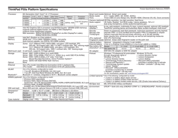Product Specifications Reference (PSREF) ThinkPad P50s Platform Specifications Processor 6th Generation Intel® Core™ i5 / i7 Processor Smart card readerOptional: Smart card reader Media reader 4-in-1 reader (MMC, SD, SDHC, SDXC) Ports Three USB 3.0 (one Always On), MiniDP, HDMI, Ethernet (RJ-45), Dock connector Camera (optional) HD720p resolution, low light sensitive, fixed focus Audio support HD Audio, Realtek® ALC3245 codec / stereo speakers, 1W x 2 / dual array microphone, combo audio/microphone jack Keyboard 6-row, spill-resistant, multimedia Fn keys, numeric keypad, optional LED backlight Graphics Intel HD Graphics 520 in processor and NVIDIA Quadro® M500M (2GB memory); UltraNav™ TrackPoint® pointing device and buttonless Mylar surface touchpad, multi-touch supports external digital monitor via HDMI or Mini DisplayPort; Security Power-on password, hard disk password, supervisor password, security keyhole supports three independent displays; Security chip Discrete TPM 1.2 TCG Certified and Firmware TPM 2.0 integrated in chipset Max resolution: 3840x2160@60Hz (DisplayPort via Mini DisplayPort cable); ThinkEngine Delivers improved thermal and power efficiency, up to 30 day standby, 4096x2160@24Hz (HDMI) faster resume time, enhanced security, as well as anti-tampering measures Chipset Intel SoC (System on Chip) platform Intel vPro Technology vPro (optional) 7 Memory 32GB max / PC3-12800 1600MHz DDR3L, non-parity, Fingerprint reader Optional: Swipe style fingerprint reader on the palm rest dual-channel capable, two DDR3L SO-DIMM sockets Internal battery Optional: Integrated Li-Polymer 3-cell (44Wh) Display Some: 15.6" (396mm) FHD (1920x1080), anti-glare, LED backlight, IPS, External battery Li-Ion or Li-Polymer 3-cell (23Wh) or Li-Ion 6-cell (48Wh or 72Wh) 250 nits, 16:9 aspect ratio, 400:1 or 500:1 contrast ratio, 160° viewing angle Max battery life10 Models 3 + 3-cell 3 + 6-cell 48Wh 3 + 6-cell 72Wh Some: 15.5" (394mm) 3K (2880x1620), anti-glare, LED backlight, IPS, (MobileMark® 2014) Max battery life 12.0 hr 16.3 hr 20.5 hr 350 nits, 16:9 aspect ratio, 1000:1 contrast ratio, 160° viewing angle 65W Slim AC adapter or 65W AC adapter AC adapter Multi-touch (opt) In-cell touch, supports 10-finger gesture Preload Windows 7 Professional 64 preinstalled Windows 10 Pro 64 Storage Some: SSD / SATA 6.0Gb/s (e.g. xxxG SSD) through downgrade rights in • Lenovo Solution Center Some: SSD / PCIe NVMe, PCIe 3.0 x 2, 16Gb/s (e.g. xxxG SSD PCIe NVMe) Windows 10 Pro 64 • Lenovo Companion Some: HDD / SATA 6.0Gb/s, 2.5" wide, 7mm high, • Lenovo Solution Center • Lenovo Setting Shock Mounted Hard Drive, Active Protection System™ • ThinkVantage Product Recovery • Microsoft Office preloaded; Some: SSHD with 8GB NAND flash memory • Rescue and Recovery™ purchase a product key to activate Optical None • ThinkVantage System Update • McAfee® LiveSafe™ (30-day trial) Ethernet Non-vPro model: Intel Ethernet Connection I219-V (Jacksonville) • Adobe® Reader® vPro model: Intel Ethernet Connection I219-LM (Jacksonville) • Microsoft® Office preloaded; 4 One of the following, configurable by model: WLAN purchase a product key to activate • 11ac+BT, Broadcom BCM4356, 2x2, M.2 card • McAfee® LiveSafe™ (30-day trial) • 11ac+BT, Intel Dual Band Wireless-AC 8260, 2x2, M.2 card For ISV certifications, please visit www.lenovo.com/support/ISV Bluetooth™ Bluetooth 4.1 wireless, integrated in Wi-Fi + Bluetooth combo adapter Limited warranty12 One of the following, configurable by model: WWAN (optional) One of the following, configurable by model: • 3-year/1-yr battery depot repair service • Wireless WAN upgradable • 3-year/1-yr battery limited onsite service24 • Wireless WAN, Sierra Wireless EM7455, • 3-year/1-yr battery limited onsite service, OID (Onsite International Delivery) ® Qualcomm 4G LTE-Advanced/DC-HSPA+/HSPA+/HSPA/UMTS/GNSS, M.2 card Mil-Spec test MIL-STD-810G military certification • Wireless WAN, HUAWEI ME906S, HUAWEI 4G LTE/WCDMA/HSPA/GSM/GPRS/EDGE/GNSS, M.2 card (WE only) Environment EPEAT™ Gold (US only); ENERGY STAR® 6.1; GREENGUARD®; RoHS-compliant Micro-SIM card slot, optional Verizon LTE (US) or Lenovo Connect (WE) SIM card SIM card (opt) Dimensions3 WxDxH: 14.98" x 10.17" x 0.88"; 380.6mm x 258.2mm x 22.45mm Weight2 Models No + 6-cell 3-cell + 3-cell 3-cell + 6-cell Processor Number i5-6300U i7-6500U i7-6600U Non-touch Multi-touch Case material # of # of Base Max Turbo Memory Processor Cache Cores Threads Frequency Frequency Types Graphics 2.4 GHz 3 GHz 3MB Intel HD Graphics 2 4 2.5 GHz 3.1 GHz 4MB DDR3L-1600 520 2.6 GHz 3.4 GHz 4MB 5.27 lb / 2.39 kg - Display cover: PPS; 4.97 lb / 2.25 kg 5.00 lb / 2.27 kg 5.44 lb / 2.47 kg 5.42 lb / 2.46 kg Bottom: Glass-Fiber Reinforced Plastic