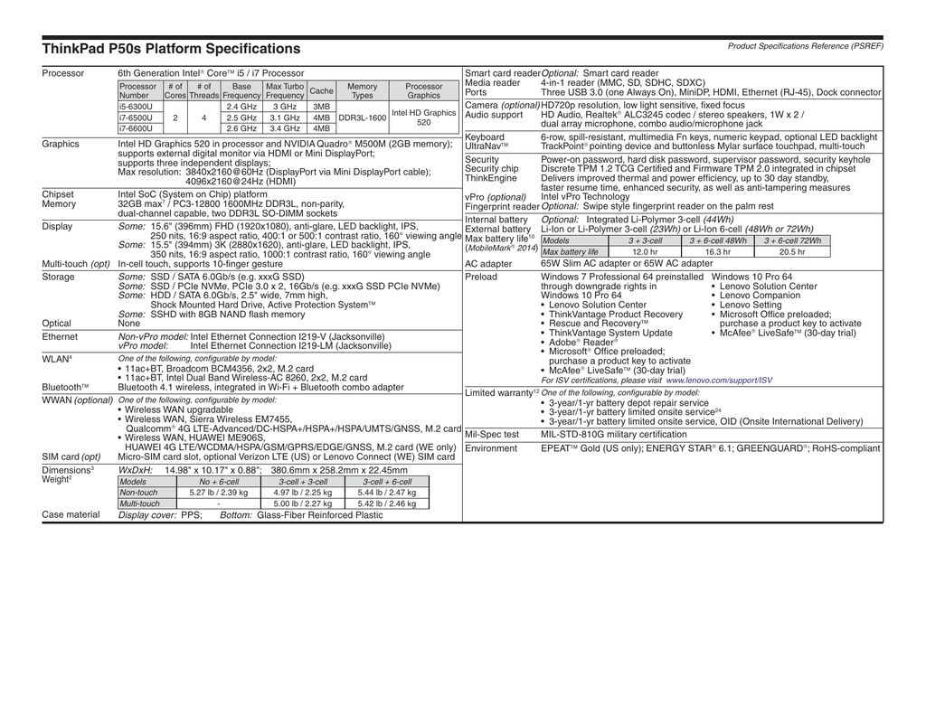 ThinkPad P50s Platform Specifi cations - PSRef`s
