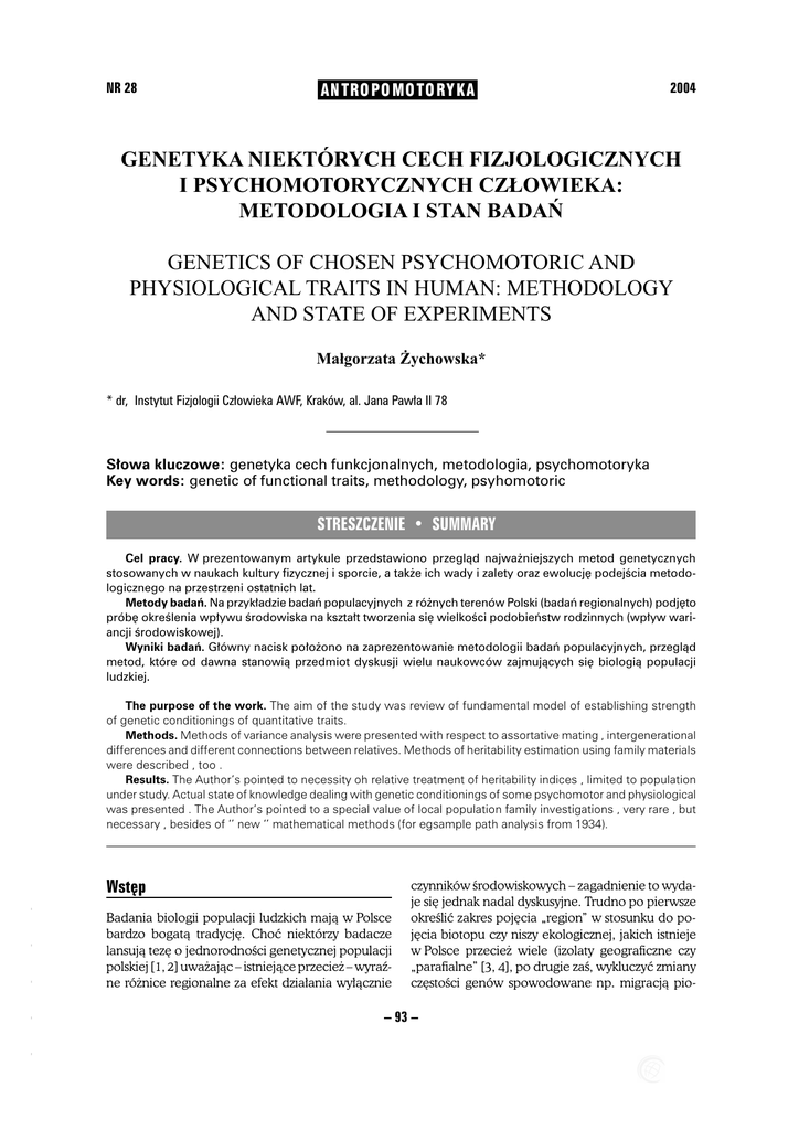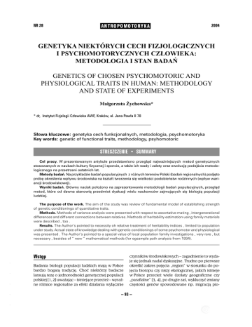 NR 28 Genetyka niektórych cech fizjologicznych i psychomotorycznych człowieka: metodologia i stan badań AN TRO PO MO TO RY KA 2004 GENETYKA NIEKTÓRYCH CECH FIZJOLOGICZNYCH I PSYCHOMOTORYCZNYCH CZŁOWIEKA: METODOLOGIA I STAN BADAŃ GENETICS OF CHOSEN PSYCHOMOTORIC AND PHYSIOLOGICAL TRAITS IN HUMAN: METHODOLOGY AND STATE OF EXPERIMENTS Małgorzata Żychowska* * dr, Instytut Fizjologii Człowieka AWF, Kraków, al. Jana Pawła II 78 Słowa kluczowe: genetyka cech funkcjonalnych, metodologia, psychomotoryka Key words: genetic of functional traits, methodology, psyhomotoric STRESZCZENIE • SUMMARY Cel pracy. W prezentowanym artykule przedstawiono przegląd najważniejszych metod genetycznych stosowanych w naukach kultury fizycznej i sporcie, a także ich wady i zalety oraz ewolucję podejścia metodologicznego na przestrzeni ostatnich lat. Metody badań. Na przykładzie badań populacyjnych z różnych terenów Polski (badań regionalnych) podjęto próbę określenia wpływu środowiska na kształt tworzenia się wielkości podobieństw rodzinnych (wpływ wariancji środowiskowej). Wyniki badań. Główny nacisk położono na zaprezentowanie metodologii badań populacyjnych, przegląd metod, które od dawna stanowią przedmiot dyskusji wielu naukowców zajmujących się biologią populacji ludzkiej. The purpose of the work. The aim of the study was review of fundamental model of establishing strength of genetic conditionings of quantitative traits. Methods. Methods of variance analysis were presented with respect to assortative mating , intergenerational differences and different connections between relatives. Methods of heritability estimation using family materials were described , too . Results. The Author’s pointed to necessity oh relative treatment of heritability indices , limited to population under study. Actual state of knowledge dealing with genetic conditionings of some psychomotor and physiological was presented . The Author’s pointed to a special value of local population family investigations , very rare , but necessary , besides of ‘’ new ‘’ mathematical methods (for egsample path analysis from 1934). - - - - - Wstęp Badania biologii populacji ludzkich mają w Polsce bardzo bogatą tradycję. Choć niektórzy badacze lansują tezę o jednorodności genetycznej populacji polskiej [1, 2] uważając – istniejące przecież – wyraźne różnice regionalne za efekt działania wyłącznie czynników środowiskowych – zagadnienie to wydaje się jednak nadal dyskusyjne. Trudno po pierwsze określić zakres pojęcia „region” w stosunku do pojęcia biotopu czy niszy ekologicznej, jakich istnieje w Polsce przecież wiele (izolaty geograficzne czy „parafialne” [3, 4], po drugie zaś, wykluczyć zmiany częstości genów spowodowane np. migracją pio- – 93 – - - - - - Małgorzata Żychowska nową [5,6]. Jeżeli na przykład z tzw. badań ogólnopolskich [7] wynika, że najlepiej rozwinięta jest młodzież z województwa środkowokarpackiego, a najgorzej z zachodniopomorskiego i małopolskiego, należałoby przyjąć, że albo warunki biospołeczne zmieniły kierunek działania w ostatnim okresie (co jest co najmniej mało prawdopodobne) – albo migracje zmieniły pulę genetyczną, albo też rzetelność zbierania danych była wątpliwa. Nie wdając się w szczegółową analizę tych przypuszczeń należy jednak szczególnie wyraźnie podkreślić ogromne znaczenie tzw. badań regionalnych, pozwalających -naszym zdaniem- na dużo precyzyjniejsze oceny zarówno różnic międzypopulacyjnych, jak też trendów sekularnych czy statusu społecznoekonomicznego (urbanizacji, warunków bytowych, kulturowych itp.) Badań takich przeprowadzono wiele w różnych populacjach naszego kraju i chociaż ich uogólnianie w postaci wydawnictw monograficznych (np. krakowskie, poznańskie, kieleckie itp.) oraz tworzenie na ich podstawie tzw. norm rozwojowych doczekało się dość poważnej krytyki [8, 9], ich wartość jest bezdyskusyjna. Z oczywistych przyczyn (trudności w zebraniu reprezentatywnych liczebności, ograniczaniu większości badań tylko do zakresu specjalizacji badaczy itp.) ograniczyły się powyższe publikacje do pomiaru podstawowych cech somatycznych i (różnie ocenianej) sprawności motorycznej [12, 11, 13, 14, 10, 15, 17, 16, 18, 19]. Wyłącznie sporadyczne są badania o takiej skali, które uwzględniałyby zarówno cechy funkcjonalne (fizjologiczno-bochemiczne i psychomotoryczne) – leżące przecież u podstaw sprawności motorycznej, jak i jej inne predyspozycje [20]: należą tu prace wykonane z inspiracji Prof. N. Wolańskiego i publikowane na łamach „Studies in Human Ecology” w latach 1971-1989 oraz – o znacznie większej skali- badania dzieci i młodzieży oraz osób dorosłych z Krakowa [13]. Jednak nawet w tych badaniach nie analizowano wielu ważnych parametrów hematologicznych – warunkujących w znacznym stopniu wydolność fizyczną. Dla pełnej oceny udziału poszczególnych źródeł zmienności niezbędne są bowiem badania drugiej głównej składowej wariancji fenotypowej, tj. siły genetycznych uwarunkowań rozwoju. W tym jednak zakresie piśmiennictwo jest znacznie skromniejsze, a badania takie były w dodatku ograniczone do cech somatycznych i oparte głównie na metodzie bliźniąt [21]. Niezależnie od wiarygodności wspominanych badań należy stwierdzić, że niezmiernie rzadkie są badania nad fenotypowymi podobieństwami rodzinnymi w skali populacji. Wynika to z oczywistej trudności w zebraniu odpowiednio licznych materiałów, doboru testów (zachowanie niezbędnej trafności przy równoczesnej łatwości wykonania) możliwych do zastosowania równocześnie przez rodziców i dzieci, i koniecznej kompleksowości takich badań (ustalenie relacji międzycechowych jest niezbędnym warunkiem wiarygodności wyników). Dlatego zapewne badań takich było do tej pory niewiele, a wykonano je w większości w Polsc