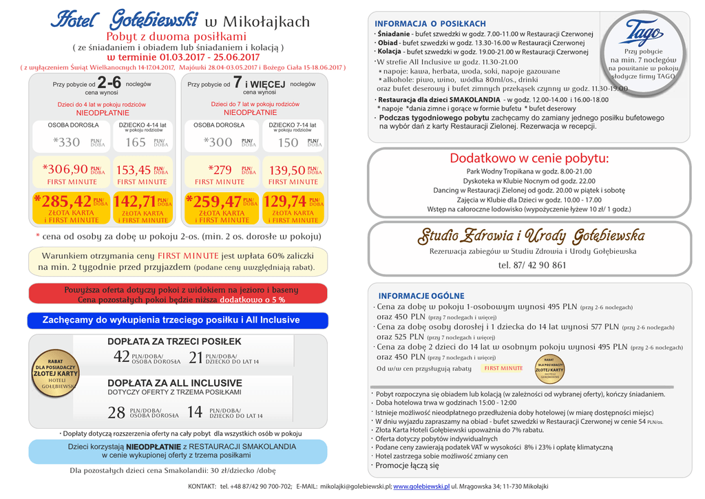w Mikołajkach Pobyt z dwoma posiłkami ( ze śniadaniem i obiadem lub śniadaniem i kolacją ) Przy pobycie w terminie 01.03.2017 - 25.06.2017 na min. 7 noclegów ( z wyłączeniem Świąt Wielkanocnych 14-17.04.2017, Majówki 28.04-03.05.2017 i Bożego Ciała 15-18.06.2017 ) 2-6 noclegów Przy pobycie od cena wynosi Przy pobycie od Dzieci do 7 lat w pokoju rodziców NIEODPŁATNIE NIEODPŁATNIE *330 PLN/ DOBA *306,90 PLN/ DOBA DZIECKO 4-14 lat w pokoju rodziców 165 153,45 FIRST MINUTE *285,42 ZŁOTA KARTA i FIRST MINUTE PLN/ DOBA PLN/ DOBA FIRST MINUTE PLN/ DOBA noclegów cena wynosi Dzieci do 4 lat w pokoju rodziców OSOBA DOROSŁA 7 i WIĘCEJ W strefie All Inclusive w godz. 11.30-21.00 na powitanie w pokoju napoje: kawa, herbata, woda, soki, napoje gazowane słodycze firmy TAGO alkohole: piwo, wino, wódka 80ml/os., drinki oraz bufet deserowy i bufet zimnych przekąsek czynny w godz. 11.30-19.00 142,71 PLN/ DOBA ZŁOTA KARTA i FIRST MINUTE OSOBA DOROSŁA DZIECKO 7-14 lat w pokoju rodziców *300 PLN/ DOBA 150 PLN/ DOBA *279 PLN/ DOBA 139,50 PLN/ DOBA FIRST MINUTE *259,47 ZŁOTA KARTA PLN/ DOBA i FIRST MINUTE Dodatkowo w cenie pobytu: FIRST MINUTE 129,74 Podczas tygodniowego pobytu zachęcamy do zamiany jednego posiłku bufetowego na wybór dań z karty Restauracji Zielonej. Rezerwacja w recepcji. PLN/ DOBA ZŁOTA KARTA i FIRST MINUTE Park Wodny Tropikana w godz. 8.00-21.00 Dyskoteka w Klubie Nocnym od godz. 22.00 Dancing w Restauracji Zielonej od godz. 20.00 w piątek i sobotę Zajęcia w Klubie dla Dzieci w godz. 10.00 - 17.00 Wstęp na całoroczne lodowisko (wypożyczenie łyżew 10 zł/ 1 godz.) * cena od osoby za dobę w pokoju 2-os. (min. 2 os. dorosłe w pokoju) Warunkiem otrzymania ceny FIRST MINUTE jest wpłata 60% zaliczki Rezerwacja zabiegów w Studiu i Urody Gołębiewska OFERTA NAZdrowia POWITANIE tel. 87/ 42 90 861 na min. 2 tygodnie przed przyjazdem (podane ceny uwzględniają rabat). Powyższa oferta dotyczy pokoi z widokiem na jezioro i baseny Cena pozostałych pokoi będzie niższa dodatkowo o 5 % Zachęcamy do wykupienia trzeciego posiłku i All Inclusive DOPŁATA ZA TRZECI POSIŁEK 42 HOTELI GOŁĘBIEWSKI PLN/DOBA/ OSOBA DOROSŁA 21 PLN/DOBA/ DZIECKO DO LAT 14 Cena za dobę w pokoju 1-osobowym wynosi 495 PLN (przy 2-6 noclegach) oraz 450 PLN (przy 7 noclegach i więcej) Cena za dobę osoby dorosłej i 1 dziecka do 14 lat wynosi 577 PLN (przy 2-6 noclegach) oraz 525 PLN (przy 7 noclegach i więcej) Cena za dobę 2 dzieci do 14 lat w osobnym pokoju wynosi 495 PLN (przy 2-6 noclegach) oraz 450 PLN (przy 7 noclegach i więcej) Od w/w cen przysługują rabaty FIRST MINUTE HOTELI GOŁĘBIEWSKI DOPŁATA ZA ALL INCLUSIVE DOTYCZY OFERTY Z TRZEMA POSIŁKAMI 28 PLN/DOBA/ OSOBA DOROSŁA 14 PLN/DOBA/ DZIECKO DO LAT 14 Dzieci korzystają NIEODPŁATNIE z RESTAURACJI SMAKOLANDIA w cenie wykupionej oferty z trzema posiłkami Dla pozostałych dzieci cena Smakolandii: 30 zł/dziecko /dobę Pobyt rozpoczyna się obiadem lub kolacją (w zależności od wybranej oferty), kończy śniadaniem. Doba hotelowa trwa w godzinach 15:00 - 12:00 Istnieje możliwość nieodpłatnego przedłużenia doby hotelowej (w miarę dostępności miejsc) W dniu wyjazdu zapraszamy na obiad - bufet szwedzki w Restauracji Czerwonej w cenie 54 PLN/os. Złota Karta Hoteli Gołębiewski upoważnia do 7% rabatu. Oferta dotyczy pobytów indywidualnych Podane ceny zawierają podatek VAT w wysokości 8% i 23% i opłatę klimatyczną Hotel zastrzega sobie możliwość zmiany cen Promocje łączą się KONTAKT: tel. +48 87/42 90 700-702; E-MAIL: [email protected]; www.golebiewski.pl ul. Mrągowska 34; 11-730 Mikołajki