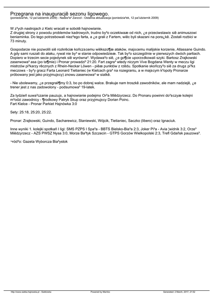 Przegrana na inauguracjê sezonu ligowego. (poniedzia³ek, 12 pa¼dziernik 2009) - Nades³a³ Zarz±d - Ostatnia aktualizacja (poniedzia³ek, 12 pa¼dziernik 2009) W z³ych nastrojach z Kielc wracali w sobotê hajnowianie. Z drugiej strony z powodu problemów kadrowych, trudno by³o oczekiwaæ od nich, ¿e przeciwstawi± siê animuszowi beniaminka. Do tego potrzebowali niez³ego farta, a ¿e grali z Fartem, wiêc byli skazani na pora¿kê. Zostali rozbici w 73 minuty. Gospodarze nie pozwolili siê rozkrêciæ koñcz±cemu wiêkszo¶æ ataków, maj±cemu malijskie korzenie, Allassane Guindo. A gdy sami ruszali do ataku, rywal nie by³ w stanie odpowiedzieæ. Tak by³o szczególnie w pierwszych dwóch partiach. Dopiero w trzecim secie pojedynek siê wyrówna³. Wydawa³o siê, ¿e go¶cie uporz±dkowali szyki. Bartosz Zrajkowski zaserwowa³ asa (po ta¶mie) i Pronar prowadzi³ 21:20. Fart zagra³ wtedy niczym Vive Bogdana Wenty w meczu ligi mistrzów pi³karzy rêcznych z Rhein-Neckar Löwen - piêæ punktów z rzêdu. Spotkanie skoñczy³o siê za drug± pi³k± meczow± - by³y gracz Farta Leonard Tietianiec (w Kielcach gra³ na rozegraniu, a w maj±cym k³opoty Pronarze próbowany jest jako przyjmuj±cy) znowu zaserwowa³ w siatkê. - Nie ubolewamy, ¿e przegrali¶my 0:3, bo po dobrej walce. Brakuje nam troszkê zawodników, ale mam nadziejê, ¿e trener jest z nas zadowolony - podsumowa³ 19-latek. Za tydzieñ suwa³czanie pauzuj±, a hajnowianie podejm± Or³a Miêdzyrzecz. Do Pronaru powinni do³±czyæ kolejni m³odzi zawodnicy - ¶rodkowy Patryk Skup oraz przyjmuj±cy Dorian Poinc. Fart Kielce - Pronar Parkiet Hajnówka 3:0 Sety: 25:18, 25:20, 25:22. Pronar: Zrajkowski, Guindo, Sacharewicz, Staniewski, Wójcik, Tietianiec, Saczko (libero) oraz Ignaciuk. Inne wyniki 1. kolejki spotkañ I ligi: SMS PZPS I Spa³a - BBTS Bielsko-Bia³a 2:3, Joker Pi³a - Avia ¦widnik 3:2, Orze³ Miêdzyrzecz - AZS PWSZ Nysa 3:0, Morze Ba³tyk Szczecin - GTPS Gorzów Wielkopolski 2:3, Trefl Gdañsk pauzowa³. ¬ród³o: Gazeta Wyborcza Bia³ystok http://www.siatka.hajnowka.pl - Siatkówka Powered by Mambo Generated: 2 March, 2017, 21:52