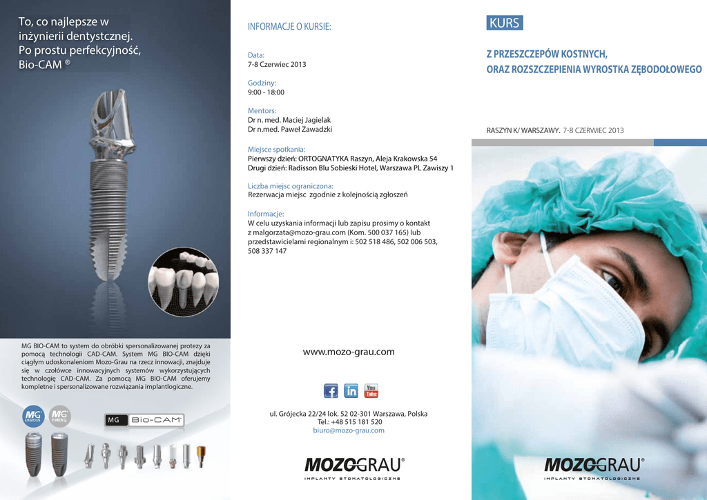 To, co najlepsze w inżynierii dentystcznej. Po prostu perfekcyjność, Bio-CAM ® KURS INFORMACJE O KURSIE: Z PRZESZCZEPÓW KOSTNYCH, ORAZ ROZSZCZEPIENIA WYROSTKA ZĘBODOŁOWEGO Data: 7-8 Czerwiec 2013 Godziny: 9:00 - 18:00 Mentors: Dr n. med. Maciej Jagielak Dr n.med. Paweł Zawadzki RASZYN K/ WARSZAWY. 7-8 CZERWIEC 2013 Miejsce spotkania: Pierwszy dzień: ORTOGNATYKA Raszyn, Aleja Krakowska 54 Drugi dzień: Radisson Blu Sobieski Hotel, Warszawa PL Zawiszy 1 Liczba miejsc ograniczona: Rezerwacja miejsc zgodnie z kolejnością zgłoszeń Informacje: W celu uzyskania informacji lub zapisu prosimy o kontakt z [email protected] (Kom. 500 037 165) lub przedstawicielami regionalnym i: 502 518 486, 502 006 503, 508 337 147 MG BIO-CAM to system do obróbki spersonalizowanej protezy za pomocą technologii CAD-CAM. System MG BIO-CAM dzięki ciągłym udoskonaleniom Mozo-Grau na rzecz innowacji, znajduje się w czołówce innowacyjnych systemów wykorzystujących technologię CAD-CAM. Za pomocą MG BIO-CAM oferujemy kompletne i spersonalizowane rozwiązania implantlogiczne. MG Bi o- C AM www.mozo-grau.com ul. Grójecka 22/24 lok. 52 02-301 Warszawa, Polska Tel.: +48 515 181 520 [email protected] I M P L A N T Y S T O M A T O L O G I C Z N E I M P L A N T Y S T O M A T O L O G I C Z N E Program kursu CZĘŚĆ PRAKTYCZNA Piątek 7 czerwiec 2013 dr n. med. Maciej Jagielak dr n. med. Maciej Jagielak Specjalista II-go stopnia chirurgii szczękowo-twarzowej Prezes Polskiego Towarzystwa Chirurgii Jamy Ustnej i Chirurgii Szczękowo -Twarzowej 9.00 – 18.00 Zabiegi na żywo ( 5 zabiegów): • przeszczepy kostne • rozszczepienie wyrostka zębodołowego wraz z augumentacją w trudnych warunkach • implantacja 13.00 – 13.30 Lunch 20.00 – Kolacja dla uczestników kursu CZĘŚĆ TEORETYCZNA I ĆWICZENIA Sobota 8 czerwiec 2013 dr n. med. Paweł Zawadzki 9.00 – 15.00 Wykłady z zakresu: • przeszczepów kostnych • rozszczepienia wyrostka zębodołowego dr n. med. Paweł Zawadzki 13.00 – 13.30 Lunch Specjalista chirurgii szczękowo-twarzowej 15.00 – 17.00 Ćwiczenia na fantomach I M P L A N T Y S T O M A T O L O G I C Z N E