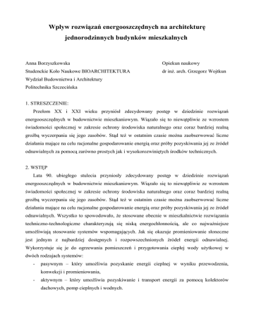 Wpływ rozwiązań energooszczędnych na architekturę jednorodzinnych budynków mieszkalnych Anna Borzyszkowska Opiekun naukowy Studenckie Koło Naukowe BIOARCHITEKTURA dr inż. arch. Grzegorz Wojtkun Wydział Budownictwa i Architektury Politechnika Szczecińska 1. STRESZCZENIE: Przełom XX i XXI wieku przyniósł zdecydowany postęp w dziedzinie rozwiązań energooszczędnych w budownictwie mieszkaniowym. Wiązało się to niewątpliwie ze wzrostem świadomości społecznej w zakresie ochrony środowiska naturalnego oraz coraz bardziej realną groźbą wyczerpania się jego zasobów. Stąd też w ostatnim czasie można zaobserwować liczne działania mające na celu racjonalne gospodarowanie energią oraz próby pozyskiwania jej ze źródeł odnawialnych za pomocą zarówno prostych jak i wysokorozwiniętych środków technicznych. 2. WSTĘP Lata 90. ubiegłego stulecia przyniosły zdecydowany postęp w dziedzinie rozwiązań energooszczędnych w budownictwie mieszkaniowym. Wiązało się to niewątpliwie ze wzrostem świadomości społecznej w zakresie ochrony środowiska naturalnego oraz coraz bardziej realną groźbą wyczerpania się jego zasobów. Stąd też w ostatnim czasie można zaobserwować liczne działania mające na celu racjonalne gospodarowanie energią oraz próby pozyskiwania jej ze źródeł odnawialnych. Wszystko to spowodowało, że stosowane obecnie w mieszkalnictwie rozwiązania techniczno-technologiczne charakteryzują się niską energochłonnością, ale co najważniejsze umożliwiają stosowanie systemów wspomagających. Jak się okazuje promieniowanie słoneczne jest jednym z najbardziej dostępnych i rozpowszechnionych źródeł energii odnawialnej. Wykorzystuje się je do ogrzewania pomieszczeń i przygotowania ciepłej wody użytkowej w dwóch rodzajach systemów: - pasywnym – który umożliwia pozyskanie energii cieplnej w wyniku przewodzenia, konwekcji i promieniowania, - aktywnym – który umożliwia pozyskiwanie i transport energii za pomocą kolektorów dachowych, pomp cieplnych i wodnych. Biorąc pod uwagę fakt, że w naszych warunkach klimatycznych rozwiązania bierne spełniają minimum stawianych im wymagań, a w trakcie eksploatacji budynku nie pociągają za sobą konieczności podejmowania jakiegokolwiek wysiłku ekonomicznego i organizacyjnego, to wydają się szczególnie użyteczne. Stąd też w niniejszej pracy zostały one szerzej potraktowane. 3. SYSTEMY BIERNE W KSZTAŁTOWANIU BUDYNKÓW MIESZKALNYCH W systemach biernych (lub inaczej pasywnych) promieniowanie słoneczne jest wykorzystywane przede wszystkim do bezpośredniego ogrzewania pomieszczeń mieszkalnych. W tym celu dąży się do takiego ukształtowania bryły i usytuowania budynku względem stron świata aby jak największa jego powierzchnia była wystawiona na działanie promieni słonecznych. Efekt ten można jeszcze poprawić stosując różnego rodzaju przewodniki, np. szkło. Ten ostatni sposób polega na przepuszczaniu promieniowania krótkofalowego przez przeszklenia, które jest następnie pochłaniane i kumulowane w przystosowanych do tego celu elementach budynku (stropy, ściany), a następnie emitowane do pomieszczeń w postaci promieniowania termicznego. Stąd też system bierny generuje trzy rodzaje „zysku” energetycznego: - bezpośredni – w którym kluczową rolę odgrywa usytuowane pomieszczeń z dużymi przeszkleniami na stronę południową, - pośredni – w którym wykorzystuje się dodatkowe elementy umieszczone za przeszkleniem odbierające promieniowanie słoneczne, np. ciężkie i lekkie ściany termiczne, baseny itp., - zysk kompilacyjny – poprzez atria, szklarnie, werandy itp. W polskich warunkach klimatycznych sprawność energetyczna systemów pasywnych waha się od 20 do 60,0%. Jednak biorąc pod uwagę, fakt, że ich stosowanie jest związane jedynie z początkowym okresem procesu inwestycyjnego (etap projektu architektonicznego), to takie osiągnięcie można uznać za co najmniej zadowalające. 3.1. Układ funkcjonalno-przestrzenny budynku 3.1.1. Zasada strefowania pomieszczeń mieszkalnych Istotny wpływ na wielkość zysków cieplnych z promieniowania słonecznego ma sposób rozwiązania układu funkcjonalno-przestrzennego budynku. Stąd też pomieszczenia w nim przewidziane powinny być przyporządkowane do jednej z poniższych stref temperaturowych: I. T ≤ 16 C° – pomieszczenia pomocnicze, przedsionki, korytarze, cieplarnie, II. T = 18-20C° – sypialnie, garderoby, pomieszczenia wc, III. T = 20-22C° – pokoje dzienne, pracy, zabaw, kuchnie. Pomieszczenia charakteryzujące się podobnymi parametrami temperaturowymi powinny sąsiadować ze sobą w pionie lub poziomie, aby dodatkowo wyeliminować straty ciepła. 3.1.2.Usytuowanie pomieszczeń względem stron świata Z uwagi na wymagania higieniczno-sanitarne wynikające z Warunków technicznych jakim powinny odpowiadać budynki i ich usytuowanie, a także na konieczność zapewnienia odpowiedniego komfortu zamieszkania (mikroklimat) pomieszczenia w budynku powinny być lokalizowane względem stron świata w następujący sposób: - strona północna (nawietrzna) – strefa buforowa skupiająca pomieszczenia o możliwie najmniejszej ilości otworów oraz te, które nie wymagają ogrzewania, np. garaż, komórka, schowek, warsztat (również kuchnie, sypialnie) itd., - strona południowa (zawietrzna) – strefa przewodząca i akumulacyjna, tzn. skupiająca pomieszczenia z większą ilością okien, np. pomieszczenia pobytu dziennego, cieplarnie itp. Pomieszczenia lokalizowane od strony południowej powinny być jednoprzestrzenne bez wyraźnych podziałów, które mogłyby zakłócić cyrkulację powietrza do części północnej budynku. Stąd też partię wejściową umieszcza się zazwyczaj prostopadle do osi północpołudnie. 3.1.3. Rola przegród ściennych Przegrody budowlane wystawione na działanie promieni słonecznych powinny umożliwiać swobodne przenikanie ciepła 