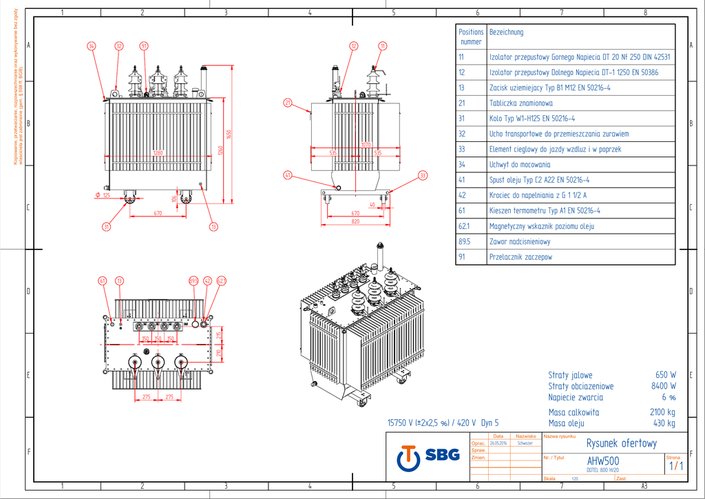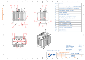 A 2 34 32 3 4 5 12 91 6 11 1650 B 1070 1260 1280 535 535 41 O 125 C 33 40 670 31 61 670 820 13 13 89.5 42 7 8 Positions Bezeichnung nummer 21 106 A 11 Izolator przepustowy Gornego Napiecia DT 20 Nf 250 DIN 42531 12 Izolator przepustowy Dolnego Napiecia DT-1 1250 EN 50386 13 Zacisk uziemiejacy Typ B1 M12 EN 50216-4 21 Tabliczka znamionowa 31 Kolo Typ W1-H125 EN 50216-4 32 Ucho transportowe do przemieszczania zurawiem 33 Element cieglowy do jazdy wzdluz i w poprzek 34 Uchwyt do mocowania 41 Spust oleju Typ C2 A22 EN 50216-4 42 Krociec do napelniania z G 1 1/2 A 61 Kieszen termometru Typ A1 EN 50216-4 62.1 Magnetyczny wskaznik poziomu oleju 89.5 Zawor nadcisnieniowy 91 Przelacznik zaczepow B C 62.1 D 150 150 150 215 D 210 Kopiowanie, przetwarzanie, rozpowszechnianie oraz wykonywanie bez zgody wlasciciela jest zabronione (gem. § 598 ff. BGB). 1 275 275 15750 V (±2x2,5 %) / 420 V Dyn 5 Data Oprac. 26.05.2016 F Nazwisko Nazwa rysunku Schwozer Spraw. Zmien. 1 2 3 4 5 6 650 W 8400 W 6% 2100 kg 430 kg Straty jalowe Straty obciazeniowe Napiecie zwarcia Masa calkowita Masa oleju E Nr. / Tytul Skala 7 Rysunek ofertowy AHW500 1 /1 DOTEL 800 H/20 Strona 1:20 Zast. A3 E F