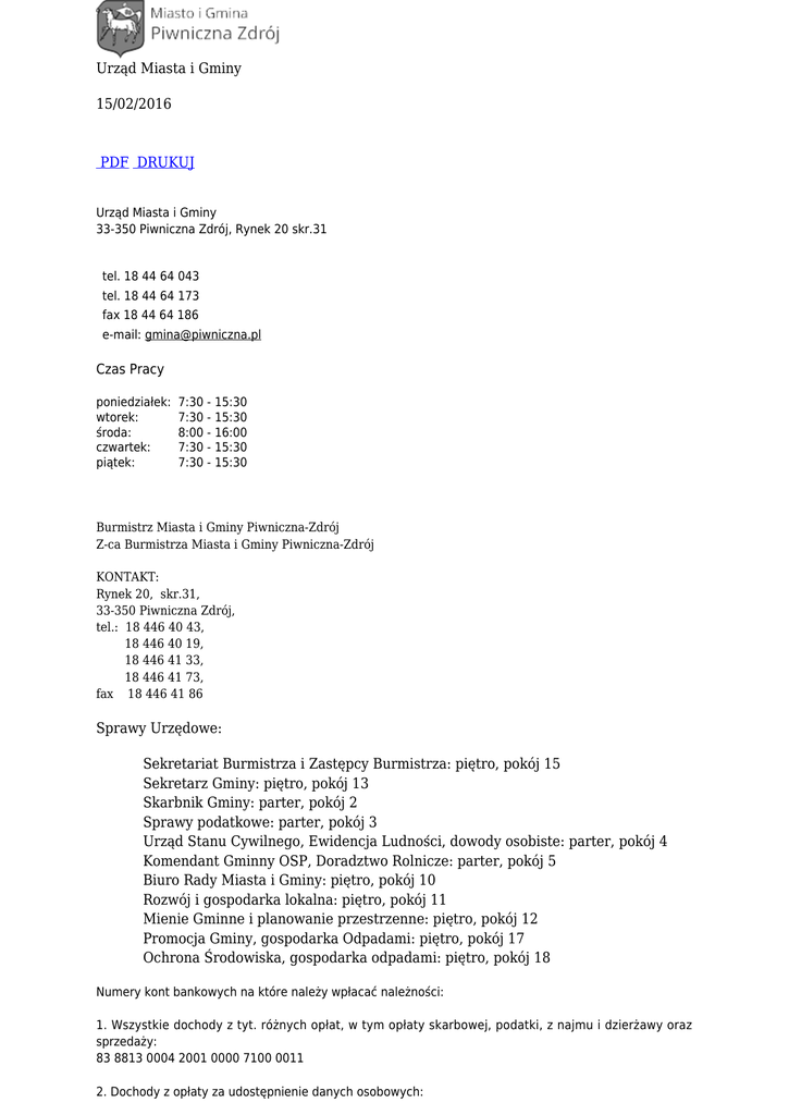 Urząd Miasta i Gminy 15/02/2016 PDF DRUKUJ Urząd Miasta i Gminy 33-350 Piwniczna Zdrój, Rynek 20 skr.31 tel. 18 44 64 043 tel. 18 44 64 173 fax 18 44 64 186 e-mail: [email protected] Czas Pracy poniedziałek: wtorek: środa: czwartek: piątek: 7:30 - 15:30 7:30 - 15:30 8:00 - 16:00 7:30 - 15:30 7:30 - 15:30 Burmistrz Miasta i Gminy Piwniczna-Zdrój Z-ca Burmistrza Miasta i Gminy Piwniczna-Zdrój KONTAKT: Rynek 20, skr.31, 33-350 Piwniczna Zdrój, tel.: 18 446 40 43, 18 446 40 19, 18 446 41 33, 18 446 41 73, fax 18 446 41 86 Sprawy Urzędowe: Sekretariat Burmistrza i Zastępcy Burmistrza: piętro, pokój 15 Sekretarz Gminy: piętro, pokój 13 Skarbnik Gminy: parter, pokój 2 Sprawy podatkowe: parter, pokój 3 Urząd Stanu Cywilnego, Ewidencja Ludności, dowody osobiste: parter, pokój 4 Komendant Gminny OSP, Doradztwo Rolnicze: parter, pokój 5 Biuro Rady Miasta i Gminy: piętro, pokój 10 Rozwój i gospodarka lokalna: piętro, pokój 11 Mienie Gminne i planowanie przestrzenne: piętro, pokój 12 Promocja Gminy, gospodarka Odpadami: piętro, pokój 17 Ochrona Środowiska, gospodarka odpadami: piętro, pokój 18 Numery kont bankowych na które należy wpłacać należności: 1. Wszystkie dochody z tyt. różnych opłat, w tym opłaty skarbowej, podatki, z najmu i dzierżawy oraz sprzedaży: 83 8813 0004 2001 0000 7100 0011 2. Dochody z opłaty za udostępnienie danych osobowych: 24 8813 0004 2001 0000 7100 0006 3. Wpłaty z tytułu zabezpieczenia należnego wykonania umowy oraz wadia: 62 8813 0004 2001 0000 7100 0001