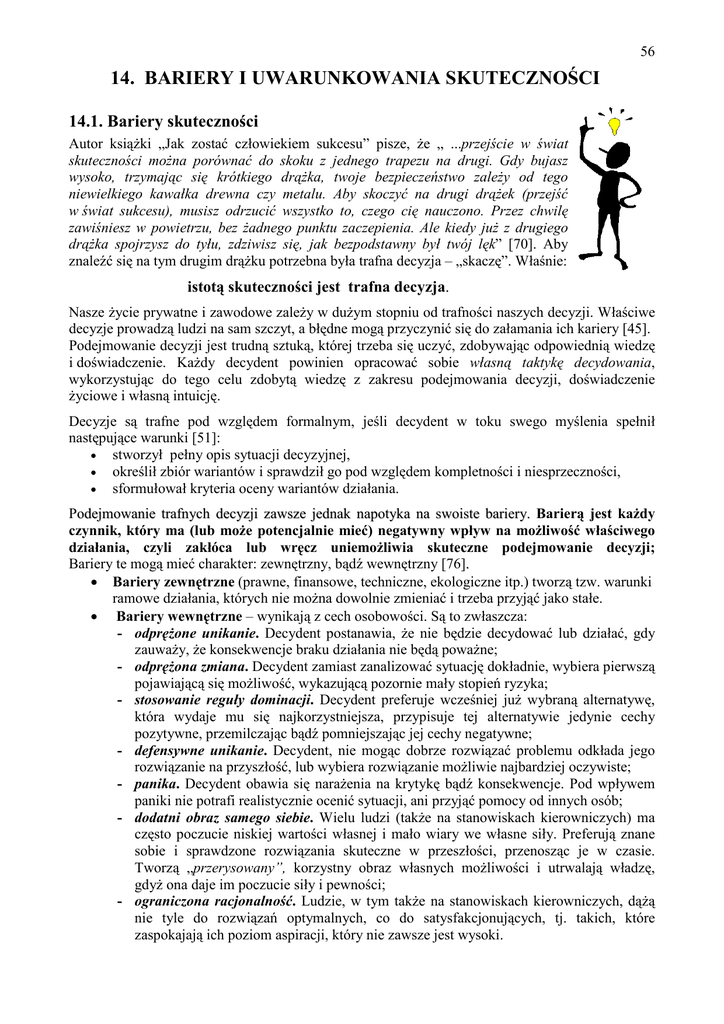 56 14. BARIERY I UWARUNKOWANIA SKUTECZNOŚCI 14.1. Bariery skuteczności Autor ksiąŜki „Jak zostać człowiekiem sukcesu” pisze, Ŝe „ ...przejście w świat skuteczności moŜna porównać do skoku z jednego trapezu na drugi. Gdy bujasz wysoko, trzymając się krótkiego drąŜka, twoje bezpieczeństwo zaleŜy od tego niewielkiego kawałka drewna czy metalu. Aby skoczyć na drugi drąŜek (przejść w świat sukcesu), musisz odrzucić wszystko to, czego cię nauczono. Przez chwilę zawiśniesz w powietrzu, bez Ŝadnego punktu zaczepienia. Ale kiedy juŜ z drugiego drąŜka spojrzysz do tyłu, zdziwisz się, jak bezpodstawny był twój lęk” [70]. Aby znaleźć się na tym drugim drąŜku potrzebna była trafna decyzja – „skaczę”. Właśnie: istotą skuteczności jest trafna decyzja. Nasze Ŝycie prywatne i zawodowe zaleŜy w duŜym stopniu od trafności naszych decyzji. Właściwe decyzje prowadzą ludzi na sam szczyt, a błędne mogą przyczynić się do załamania ich kariery [45]. Podejmowanie decyzji jest trudną sztuką, której trzeba się uczyć, zdobywając odpowiednią wiedzę i doświadczenie. KaŜdy decydent powinien opracować sobie własną taktykę decydowania, wykorzystując do tego celu zdobytą wiedzę z zakresu podejmowania decyzji, doświadczenie Ŝyciowe i własną intuicję. Decyzje są trafne pod względem formalnym, jeśli decydent w toku swego myślenia spełnił następujące warunki [51]: • stworzył pełny opis sytuacji decyzyjnej, • określił zbiór wariantów i sprawdził go pod względem kompletności i niesprzeczności, • sformułował kryteria oceny wariantów działania. Po odejmowanie trafnych decyzji zawsze jednak napotyka na swoiste bariery. Barierą jest kaŜdy czynnik, który ma (lub moŜe potencjalnie mieć) negatywny wpływ na moŜliwość właściwego działania, czyli zakłóca lub wręcz uniemoŜliwia skuteczne podejmowanie decyzji; Bariery te mogą mieć charakter: zewnętrzny, bądź wewnętrzny [76].. • Bariery zewnętrzne (prawne, finansowe, techniczne, ekologiczne itp.) tworzą tzw. warunki ramowe działania, których nie moŜna dowolnie zmieniać i trzeba przyjąć jako stałe. • Bariery wewnętrzne – wynikają z cech osobowości. Są to zwłaszcza: - odpręŜone unikanie. Decydent postanawia, Ŝe nie będzie decydować lub działać, gdy zauwaŜy, Ŝe konsekwencje braku działania nie będą powaŜne; - odpręŜona zmiana. Decydent zamiast zanalizować sytuację dokładnie, wybiera pierwszą pojawiającą się moŜliwość, wykazującą pozornie mały stopień ryzyka; - stosowanie reguły dominacji. Decydent preferuje wcześniej juŜ wybraną alternatywę, która wydaje mu się najkorzystniejsza, przypisuje tej alternatywie jedynie cechy pozytywne, przemilczając bądź pomniejszając jej cechy negatywne; - defensywne unikanie. Decydent, nie mogąc dobrze rozwiązać problemu odkłada jego rozwiązanie na przyszłość, lub wybiera rozwiązanie moŜliwie najbardziej oczywiste; - panika. Decydent obawia się naraŜenia na krytykę bądź konsekwencje. Pod wpływem paniki nie potrafi realistycznie ocenić sytuacji, ani przyjąć pomocy od innych osób; - dodatni obraz samego siebie. Wielu ludzi (takŜe na stanowiskach kierowniczych) ma często poczucie niskiej wartości własnej i mało wiary we własne siły. Preferują znane sobie i sprawdzone rozwiązania skuteczne w przeszłości, przenosząc je w czasie. Tworzą „przerysowany”, korzystny obraz własnych moŜliwości i utrwalają władzę, gdyŜ ona daje im poczucie siły i pewności; - ograniczona racjonalność. Ludzie, w tym takŜe na stanowiskach kierowniczych, dąŜą nie tyle do rozwiązań optymalnych, co do satysfakcjonujących, tj. takich, które zaspokajają ich poziom aspiracji, który nie zawsze jest wysoki. 57 14.2. Personalne uwarunkowania skuteczności Likwidacji barier wewnętrznych moŜna się nauczyć, trzeba tylko umieć odpowiedzieć na pytania: • co się na nie składa? • czego się trzeba nauczyć? • jakiego rodzaju będzie to nauka? • czy będzie to wiedza? • czy będzie to biegłość (moŜliwa do uzyskania poprzez ćwiczenia)? • czy będzie to praktyka (wielokrotne powtarzanie tych samych elementów)? „Przełamałem swoje wewnętrzne bariery i skuteczność teŜ przyszła”[18]. Jak zidentyfikować te bariery, jeśli nigdzie ich nie widać? Jak je likwidować? Większości barier wewnętrznych moŜemy sobie w ogóle nie uświadamiać. Nie uświadamiamy sobie równieŜ ich ogromnej destrukcyjności, bowiem dla wielu ludzi są one dosyć wygodne. To, co widzimy, zawsze jest interpretacją umysłu. Filtrujemy informację za pomocą naszych zmysłów. W rezultacie często patrzymy na róŜne rzeczy właściwie ich nie widząc. Doznajemy jedynie wraŜeń zmysłowych, a nie potrafimy zobaczyć rzeczywistości takiej, jaką ona jest. Trzeba więc się nauczyć innego widzenia (mentalnego), bowiem: „Większość sukcesów i ograniczeń ma swój początek w umyśle człowieka” [15]. Umysłowe widzenie świata, podobnie jak wzrok, moŜe ulec zaburzeniom. Kiedy tak się dzieje, człowiek błądzi lub idzie wolno, bez moŜliwości przyspieszenia. Najczęściej spotykane choroby oczu to krótkowzroczność i dalekowzroczność. Podobnie teŜ jest z widzeniem mentalnym, czyli: • mentalna krótkowzroczność – człowiek tego typu często nie dostrzega moŜliwości, które są odległe. Zwraca uwagę jedynie na problemy bezpośrednie (dnia codziennego). Jest ślepy na wszystko to, co wymaga od niego planowania i myślenia o przyszłości (prakseologiczny defekt dotyczący celu działania), • mentalna dalekowzroczność – człowiek o tym pokroju często nie widzi nadarzających się moŜliwości (okazji), które niesie mu teraźniejszość. A przecieŜ: „...nasze dzisiejsze problemy są skutkiem naszych wczorajszych decyzji, a nasze dzisiejsze decyzje warunkują jutrzejsze sukcesy”. Taki człowiek nie potrafi doch