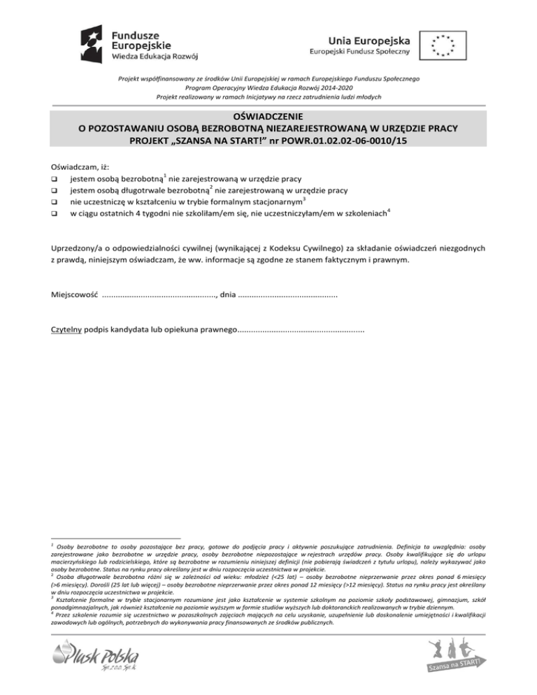 Projekt współfinansowany ze środków Unii Europejskiej w ramach Europejskiego Funduszu Społecznego Program Operacyjny Wiedza Edukacja Rozwój 2014-2020 Projekt realizowany w ramach Inicjatywy na rzecz zatrudnienia ludzi młodych OŚWIADCZENIE O POZOSTAWANIU OSOBĄ BEZROBOTNĄ NIEZAREJESTROWANĄ W URZĘDZIE PRACY PROJEKT „SZANSA NA START!” nr POWR.01.02.02-06-0010/15 Oświadczam, iż: 1 jestem osobą bezrobotną nie zarejestrowaną w urzędzie pracy 2 jestem osobą długotrwale bezrobotną nie zarejestrowaną w urzędzie pracy 3 nie uczestniczę w kształceniu w trybie formalnym stacjonarnym 4 w ciągu ostatnich 4 tygodni nie szkoliłam/em się, nie uczestniczyłam/em w szkoleniach Uprzedzony/a o odpowiedzialności cywilnej (wynikającej z Kodeksu Cywilnego) za składanie oświadczeo niezgodnych z prawdą, niniejszym oświadczam, że ww. informacje są zgodne ze stanem faktycznym i prawnym. Miejscowośd .................................................., dnia ............................................ Czytelny podpis kandydata lub opiekuna prawnego........................................................ 1 Osoby bezrobotne to osoby pozostające bez pracy, gotowe do podjęcia pracy i aktywnie poszukujące zatrudnienia. Definicja ta uwzględnia: osoby zarejestrowane jako bezrobotne w urzędzie pracy, osoby bezrobotne niepozostające w rejestrach urzędów pracy. Osoby kwalifikujące się do urlopu macierzyoskiego lub rodzicielskiego, które są bezrobotne w rozumieniu niniejszej definicji (nie pobierają świadczeo z tytułu urlopu), należy wykazywad jako osoby bezrobotne. Status na rynku pracy określany jest w dniu rozpoczęcia uczestnictwa w projekcie. 2 Osoba długotrwale bezrobotna różni się w zależności od wieku: młodzież (<25 lat) – osoby bezrobotne nieprzerwanie przez okres ponad 6 miesięcy (>6 miesięcy). Dorośli (25 lat lub więcej) – osoby bezrobotne nieprzerwanie przez okres ponad 12 miesięcy (>12 miesięcy). Status na rynku pracy jest określany w dniu rozpoczęcia uczestnictwa w projekcie. 3 Kształcenie formalne w trybie stacjonarnym rozumiane jest jako kształcenie w systemie szkolnym na poziomie szkoły podstawowej, gimnazjum, szkół ponadgimnazjalnych, jak również kształcenie na poziomie wyższym w formie studiów wyższych lub doktoranckich realizowanych w trybie dziennym. 4 Przez szkolenie rozumie się uczestnictwo w pozaszkolnych zajęciach mających na celu uzyskanie, uzupełnienie lub doskonalenie umiejętności i kwalifikacji zawodowych lub ogólnych, potrzebnych do wykonywania pracy finansowanych ze środków publicznych.