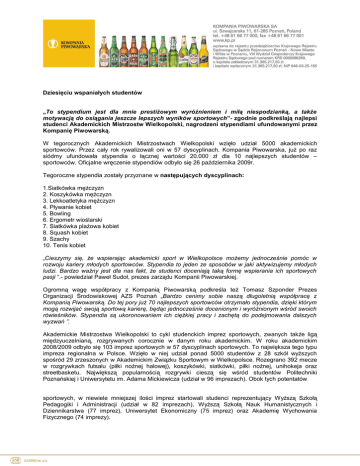Dziesięciu wspaniałych studentów „To stypendium jest dla mnie prestiŜowym wyróŜnieniem i miłą niespodzianką, a takŜe motywacją do osiągania jeszcze lepszych wyników sportowych”- zgodnie podkreślają najlepsi studenci Akademickich Mistrzostw Wielkopolski, nagrodzeni stypendiami ufundowanymi przez Kompanię Piwowarską. W tegorocznych Akademickich Mistrzostwach Wielkopolski wzięło udział 5000 akademickich sportowców. Przez cały rok rywalizowali oni w 57 dyscyplinach. Kompania Piwowarska, juŜ po raz siódmy ufundowała stypendia o łącznej wartości 20.000 zł dla 10 najlepszych studentów – sportowców. Oficjalne wręczenie stypendiów odbyło się 26 października 2009r. Tegoroczne stypendia zostały przyznane w następujących dyscyplinach: 1.Siatkówka męŜczyzn 2. Koszykówka męŜczyzn 3. Lekkoatletyka męŜczyzn 4. Pływanie kobiet 5. Bowling 6. Ergometr wioślarski 7. Siatkówka plaŜowa kobiet 8. Squash kobiet 9. Szachy 10. Tenis kobiet „Cieszymy się, Ŝe wspierając akademicki sport w Wielkopolsce moŜemy jednocześnie pomóc w rozwoju kariery młodych sportowców. Stypendia to jeden ze sposobów w jaki aktywizujemy młodych ludzi. Bardzo waŜny jest dla nas fakt, Ŝe studenci doceniają taką formę wspierania ich sportowych pasji ”.- powiedział Paweł Sudoł, prezes zarządu Kompanii Piwowarskiej. Ogromną wagę współpracy z Kompanią Piwowarską podkreśla teŜ Tomasz Szponder Prezes Organizacji Środowiskowej AZS Poznań „Bardzo cenimy sobie naszą długoletnią współpracę z Kompanią Piwowarską. Do tej pory juŜ 70 najlepszych sportowców otrzymało stypendia, dzięki którym mogą rozwijać swoją sportową karierę, będąc jednocześnie docenionym i wyróŜnionym wśród swoich rówieśników. Stypendia są ukoronowaniem ich cięŜkiej pracy i zachętą do podejmowania dalszych wyzwań ”. Akademickie Mistrzostwa Wielkopolski to cykl studenckich imprez sportowych, zwanych takŜe ligą międzyuczelnianą, rozgrywanych corocznie w danym roku akademickim. W roku akademickim 2008/2009 odbyło się 103 imprez sportowych w 57 dyscyplinach sportowych. To największa tego typu impreza regionalna w Polsce. Wzięło w niej udział ponad 5000 studentów z 28 szkół wyŜszych spośród 29 zrzeszonych w Akademickim Związku Sportowym w Wielkopolsce. Rozegrano 392 mecze w rozgrywkach futsalu (piłki noŜnej halowej), koszykówki, siatkówki, piłki noŜnej, unihokeja oraz streetbasketu. Największą popularnością rozgrywki cieszą się wśród studentów Politechniki Poznańskiej i Uniwersytetu im. Adama Mickiewicza (udział w 96 imprezach). Obok tych potentatów sportowych, w niewiele mniejszej ilości imprez startowali studenci reprezentujący WyŜszą Szkołą Pedagogiki i Administracji (udział w 82 imprezach), WyŜszą Szkołą Nauk Humanistycznych i Dziennikarstwa (77 imprez), Uniwersytet Ekonomiczny (75 imprez) oraz Akademię Wychowania Fizycznego (74 imprezy). W roku akademickim 2008/2009 obok Akademickich Mistrzostw Wielkopolski zorganizowane zostały takŜe Mistrzostwa Studentów I Lat (12 imprez) oraz Puchary Ich Magnificencji Rektorów (11 imprez). Łącznie we wszystkich imprezach wzięło udział ponad 8 tys. studentów. Sportowe rozgrywki międzyuczelniane w Wielkopolsce prowadzi i koordynuje Rada Środowiskowa Klubów Uczelnianych AZS Poznań. Ponadto jej zadaniem jest wspieranie organizacyjnie działalności Klubów Uczelnianych AZS, które istnieją przy wyŜszych uczelniach, funkcjonujących na terenie Poznania i Wielkopolski. Do redaktora: Kompania Piwowarska - Lider branŜy piwowarskiej w Polsce Kompania Piwowarska jest największym przedsiębiorstwem piwowarskim w Polsce. Kilkusetletnie doświadczenia w warzeniu piwa, nowoczesna technologia i rygorystyczne przestrzeganie zasad produkcji na światowym poziomie (World Class Manufacturing) gwarantują najwyŜszą jakość jej produktów. Do portfela marek naleŜy m.in. Tyskie (ulubione piwo Polaków), śubr (druga marka w Polsce pod względem wielkości sprzedaŜy), Lech, Dębowe Mocne, Redd's, Wojak, a takŜe międzynarodowe marki premium: Pilsner Urquell, Miller Genuine Draft oraz Peroni Nastro Azzurro. Kompania Piwowarska powstała w 1999 roku w wyniku połączenia Tyskich Browarów KsiąŜęcych i Lech Browary Wielkopolski. W roku 2003 do Kompanii dołączył Browar Dojlidy w Białymstoku a w roku 2008 – browar w Kielcach. Wielkość sprzedaŜy osiągniętej przez KP w roku finansowym zakończonym 31 marca 2009 wyniosła 15,1 mln hektolitrów piwa. SABMiller – jeden z największych na świecie producentów piwa Kompania Piwowarska jest częścią jednego z największych na świecie producentów piwa - SABMiller plc. Grupa produkuje lub dystrybuuje piwo na sześciu kontynentach, a jej ogólnoświatowy portfel obejmuje międzynarodowe piwa premium, takie jak Grolsch, Miller Genuine Draft, Peroni Nastro Azzurro czy Pilsner Urquell oraz czołowe marki lokalne, takie jak Aquila, Castle, Miller Lite, Snow czy Tyskie. SABMiller jest jedną z największych na świecie (poza USA) firm rozlewających produkty Coca-Coli. W roku finansowym zakończonym 31 marca 2009 SABMiller osiągnął przychody w wysokości 25,3 mld USD oraz wypracował zysk brutto w wysokości 3,4 mld USD. SABMiller plc jest notowany na giełdach papierów wartościowych w Londynie i Johannesburgu. Dodatkowych informacji udziela: Katarzyna Radecka Specjalista ds. Public Relations KOMPANIA PIWOWARSKA SA [email protected] Fax: +48 61 87 87 850 Tel. kom.: +48 601 599 223 Sylwetki sportowców-stypendystów Kompanii Piwowarskiej 1.Siatkówka męŜczyzn Imię i nazwisko: Szymon Śmietana Uczelnia: UAM Rok studiów: V Wydział: Nauk Społecznych Kierunek: Psychologia Dyscyplina sportowa: Siatkówka StaŜ treningowy w latach: 13 lat Osiągnięcia sportowe: Srebrny medal Akademickich MP, Złoty w kategorii Uniwersytetów, Zainteresowania: Filmy, komputery, muzyka, Stypendium jest dla mnie: Ukoronowaniem cięŜkiego