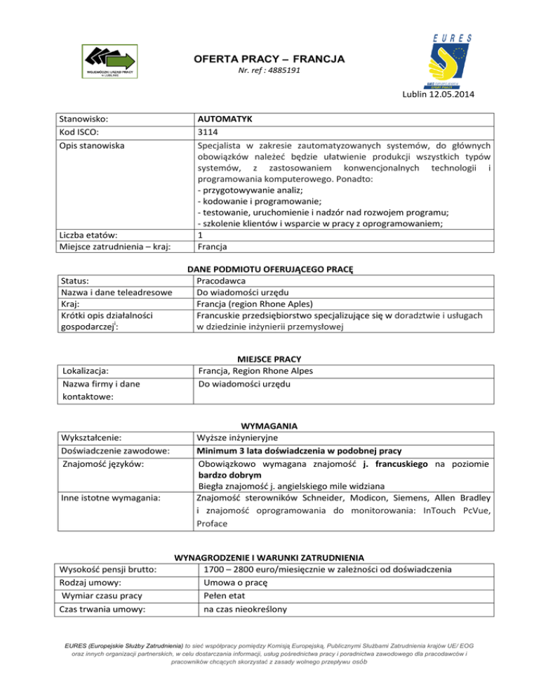 OFERTA PRACY – FRANCJA Nr. ref : 4885191 Lublin 12.05.2014 Stanowisko: Kod ISCO: Opis stanowiska Liczba etatów: Miejsce zatrudnienia – kraj: Status: Nazwa i dane teleadresowe Kraj: Krótki opis działalności gospodarczeji: Lokalizacja: Nazwa firmy i dane kontaktowe: Wykształcenie: Doświadczenie zawodowe: Znajomość języków: Inne istotne wymagania: Wysokość pensji brutto: Rodzaj umowy: Wymiar czasu pracy Czas trwania umowy: AUTOMATYK 3114 Specjalista w zakresie zautomatyzowanych systemów, do głównych obowiązków należeć będzie ułatwienie produkcji wszystkich typów systemów, z zastosowaniem konwencjonalnych technologii i programowania komputerowego. Ponadto: - przygotowywanie analiz; - kodowanie i programowanie; - testowanie, uruchomienie i nadzór nad rozwojem programu; - szkolenie klientów i wsparcie w pracy z oprogramowaniem; 1 Francja DANE PODMIOTU OFERUJĄCEGO PRACĘ Pracodawca Do wiadomości urzędu Francja (region Rhone Aples) Francuskie przedsiębiorstwo specjalizujące się w doradztwie i usługach w dziedzinie inżynierii przemysłowej MIEJSCE PRACY Francja, Region Rhone Alpes Do wiadomości urzędu WYMAGANIA Wyższe inżynieryjne Minimum 3 lata doświadczenia w podobnej pracy Obowiązkowo wymagana znajomość j. francuskiego na poziomie bardzo dobrym Biegła znajomość j. angielskiego mile widziana Znajomość sterowników Schneider, Modicon, Siemens, Allen Bradley i znajomość oprogramowania do monitorowania: InTouch PcVue, Proface WYNAGRODZENIE I WARUNKI ZATRUDNIENIA 1700 – 2800 euro/miesięcznie w zależności od doświadczenia Umowa o pracę Pełen etat na czas nieokreślony EURES (Europejskie Służby Zatrudnienia) to sieć współpracy pomiędzy Komisją Europejską, Publicznymi Służbami Zatrudnienia krajów UE/ EOG oraz innych organizacji partnerskich, w celu dostarczania informacji, usług pośrednictwa pracy i poradnictwa zawodowego dla pracodawców i pracowników chcących skorzystać z zasady wolnego przepływu osób Liczba godzin tygodniowo: Data rozpoczęcia: 35 godz. Jak najszybciej SPOSÓB SKŁADANIA WNIOSKU Wymagane dokumenty CV - z dopiskiem – AUTOMATICIENS - + List motywacyjny Język, w którym muszą być sporządzone przedkładane dokumenty: Do kogo należy wysłać dokumenty: Gdzie należy wysłać dokumenty: Dane teleadresowe doradcy EURES lub przedstawiciela pracodawcy: Język francuski Do doradcy Eures we Włoszech [email protected] Doradca Eures Provincia di Torino Servizio Coordinamento CPI - Eures V.Bologna 153, 10154 - Torino - ITALIA Phone + 39 011 9403717 / 711 Phone + 39 011 8614817 e mail: [email protected] WAŻNOŚĆ Termin przedkładania podań o pracę 30.06.2014r. Uprzejmie informujemy, że pracodawca skontaktuje się wyłącznie z wybranymi kandydatami. UWAGA: 1. Umowa z zagranicznym pracodawcą zostanie zawarta zgodnie z prawem kraju zatrudnienia. Oznacza to, że wszystkie roszczenia odnośnie do warunków, które obejmuje umowa, można kierować wyłącznie do odpowiedniego sądu w kraju zatrudnienia. Publiczne służby zatrudnienia (EURES) nie mogą pośredniczyć ani reprezentować pracownika w sądzie kraju zatrudnienia w przypadku sporu z pracodawcą. 2. Publiczne służby zatrudnienia (EURES) dokładają wszelkich starań, aby zapewnić rzetelność i wiarygodność ofert pracy zgłoszonych w lokalnym urzędzie pracy. Należy wyjaśnić, że oferta pracy została zgłoszona przez stronę trzecią i EURES nie odpowiada za ewentualne rozbieżności między warunkami pracy określonymi w ofercie pracy i warunkami oferowanymi przez potencjalnego pracodawcę. 3. Publiczne służby zatrudnienia (EURES) informują, że będą zbierać, przetwarzać i przekazywać potencjalnym pracodawcom zgodnie z przepisami dotyczącymi ochrony danych osobowych wszystkie dane osobowe dostarczone przez osoby poszukujące pracy. EURES (Europejskie Służby Zatrudnienia) to sieć współpracy pomiędzy Komisją Europejską, Publicznymi Służbami Zatrudnienia krajów UE/ EOG oraz innych organizacji partnerskich, w celu dostarczania informacji, usług pośrednictwa pracy i poradnictwa zawodowego dla pracodawców i pracowników chcących skorzystać z zasady wolnego przepływu osób