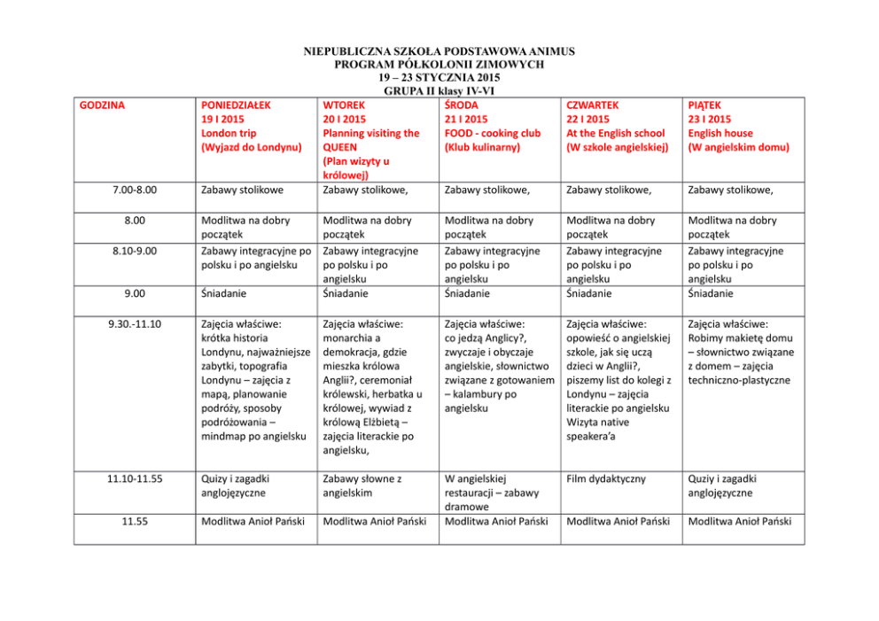 GODZINA 7.00-8.00 8.00 8.10-9.00 9.00 NIEPUBLICZNA SZKOŁA PODSTAWOWA ANIMUS PROGRAM PÓŁKOLONII ZIMOWYCH 19 – 23 STYCZNIA 2015 GRUPA II klasy IV-VI PONIEDZIAŁEK WTOREK ŚRODA CZWARTEK 19 I 2015 20 I 2015 21 I 2015 22 I 2015 London trip Planning visiting the FOOD - cooking club At the English school (Wyjazd do Londynu) QUEEN (Klub kulinarny) (W szkole angielskiej) (Plan wizyty u królowej) Zabawy stolikowe Zabawy stolikowe, Zabawy stolikowe, Zabawy stolikowe, Modlitwa na dobry początek Zabawy integracyjne po polsku i po angielsku Śniadanie PIĄTEK 23 I 2015 English house (W angielskim domu) Zabawy stolikowe, Modlitwa na dobry początek Zabawy integracyjne po polsku i po angielsku Śniadanie Modlitwa na dobry początek Zabawy integracyjne po polsku i po angielsku Śniadanie Modlitwa na dobry początek Zabawy integracyjne po polsku i po angielsku Śniadanie Modlitwa na dobry początek Zabawy integracyjne po polsku i po angielsku Śniadanie 9.30.-11.10 Zajęcia właściwe: krótka historia Londynu, najważniejsze zabytki, topografia Londynu – zajęcia z mapą, planowanie podróży, sposoby podróżowania – mindmap po angielsku Zajęcia właściwe: monarchia a demokracja, gdzie mieszka królowa Anglii?, ceremoniał królewski, herbatka u królowej, wywiad z królową Elżbietą – zajęcia literackie po angielsku, Zajęcia właściwe: co jedzą Anglicy?, zwyczaje i obyczaje angielskie, słownictwo związane z gotowaniem – kalambury po angielsku Zajęcia właściwe: opowieść o angielskiej szkole, jak się uczą dzieci w Anglii?, piszemy list do kolegi z Londynu – zajęcia literackie po angielsku Wizyta native speakera’a Zajęcia właściwe: Robimy makietę domu – słownictwo związane z domem – zajęcia techniczno-plastyczne 11.10-11.55 Quizy i zagadki anglojęzyczne Zabawy słowne z angielskim Film dydaktyczny Quziy i zagadki anglojęzyczne Modlitwa Anioł Pański Modlitwa Anioł Pański W angielskiej restauracji – zabawy dramowe Modlitwa Anioł Pański Modlitwa Anioł Pański Modlitwa Anioł Pański 11.55 12.00 – 12.30 Obiad Obiad Obiad Obiad Obiad 12.30-13.00 Czas z książką Czas z książką Czas z książką Czas z książką Czas z książką 13.00 -14.00 Zabawy ruchowe na podwórku Warsztaty plastyczne Zabawy ruchowe na podwórku Klub gier planszowych Zabawy ruchowe na podwórku Warsztaty kulinarne Zabawy ruchowe na podwórku Klub gier planszowych Podwieczorek Podwieczorek Podwieczorek Zabawy ruchowe na podwórku Warsztaty informatyczne Podwieczorek Zabawy dowolne Zabawy dowolne Zabawy dowolne Zabawy dowolne Zabawy dowolne 14.00 – 15.30 15.30 16.00 – 17.00 Podwieczorek