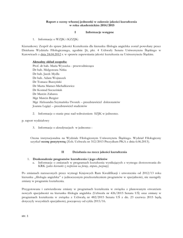 Raport z oceny własnej jednostki w zakresie jakości kształcenia w roku akademickim 2014/2015 I Informacje wstępne 1. Informacje o WZJK i KZZJK: Kierunkowy Zespół do spraw Jakości Kształcenia dla kierunku filologia angielska został powołany przez Dziekana Wydziału Filologicznego, zgodnie §6, pkt. 4 Uchwały Senatu Uniwersytetu Śląskiego w Katowicach z dnia 24.04.2012 r. w sprawie zapewniania jakości kształcenia na Uniwersytecie Śląskim. Aktualny skład zespołu: Prof. dr hab. Maria Wysocka - przewodnicząca Dr hab. Małgorzata Nitka Dr hab. Jacek Mydla Dr hab. Adam Wojtaszek Dr Tomasz Burzyński Dr Marta Mamet-Michalkiewicz Dr Konrad Szcześniak Dr Marcin Zabawa Mgr Marcin Bergier Mgr Aleksandra Szymańska-Tworek – przedstawiciel doktorantów Joanna Legięć – przedstawiciel studentów 2. Informacje o stanie prac nad wdrożeniem SZJK w jednostce. p. raport wydziałowy 3. Informacje o akredytacjach w jednostce : Ocena instytucjonalna na Wydziale Filologicznym Uniwersytetu Śląskiego. Wydział Filologiczny uzyskał ocenę pozytywną (Zob. Uchwała nr 312/2013 Prezydium PKA z dnia 6.06.2013). II Działania na rzecz jakości kształcenia 1. Doskonalenie programów kształcenia i jego efektów a. Informacje o zmianach w programach kształcenia wynikających z wymogu dostosowania do KRK (jakie kierunki z rozbiciem na formy, stopnie, poziomy) Po zmianach narzuconych przez wymogi Krajowych Ram Kwalifikacji i utworzeniu od 2012/13 roku kierunku „filologia angielska” z jednoczesnym przekształceniem programów w specjalności, nie nastąpiły zmiany w programie kształcenia. Przygotowane i zatwierdzone zmiany w programach kształcenia w związku z planowanym otwarciem nowych specjalności na kierunku filologia angielska (Uchwała nr 426/2015 Senatu UŚ) oraz zmiany w programach kształcenia w związku z Uchwałą nr 482/2015 Senatu UŚ z dn. 23 czerwca 2015 będą dotyczyły wszystkich specjalności, począwszy od cyklu 2015/16. str. 1 b. Nowe programy kształcenia i likwidacja dotychczasowych (kierunki, specjalności, zamiar utworzenia/zlikwidowania i stan zaawansowania prac) W 2014/2015 na kierunku otwarto jedną nową specjalność nazwa kierunku: FILOLOGIA ANGIELSKA specjalność nazwa kierunku: FILOLOGIA ANGIELSKA specjalność poziom I ---- poziom II Sporządzono ofertę studiów tłumaczeniowych z językiem japońskim (wraz z ułożeniem planu studiów), jednak grupy nie zostały utworzone ze względu na obecne wymogi Uniwersytetu dotyczące liczebności grup. Przygotowano otwarcie od 2015/16 dwóch nowych specjalności na studiach II stopnia: „Amerykanistyka dla komunikacji międzykulturowej i dyplomacji” oraz „Projektowanie rozrywki interaktywnej (SPRINT-WRITE II)”. c. Zgodność programów z misją i strategią uczelni oraz jednostki (o ile jednostka je posiada – stan zaawansowania prac nad misją/strategią) Nie nastąpiły zmiany od 2012 roku. Poniższy tekst jest zgodny z zapisem w zatwierdzonym programie kształcenia dla kierunku filologia angielska. Misję uczelni można rozumieć jako zespół wartości i kolektywnie wypracowanych norm współdziałania w ramach organizacji, które decydują o tożsamości uczelni oraz jej strategicznych relacjach z otoczeniem bliższym i dalszym. Jednym z aspektów dbałości o jakość kształcenia jest konieczność transferu wartości, norm i celów strategicznych uczelni z systemowego poziomu misji organizacji na poziom jednostkowych programów nauczania. Przygotowana dokumentacja programów kształcenia zgodnych z KRK obejmuje wykazanie ich zgodności z misją i strategią Uniwersytetu Śląskiego. W tym kontekście, do najistotniejszych obszarów zgodności zaliczyć można: str. 2 oferta urozmaiconych programów studiów; dbałość o jakość kształcenia w ramach oferowanych programów studiów na krajowym i międzynarodowym rynku edukacyjnym; przeciwdziałanie regionalizacji uczelni rozumiane jako zwiększenie wysiłków pozyskania kandydatów spoza Śląska oraz spoza Polski; wzbogacanie oferty dydaktycznej o oryginalne i innowacyjne programy studiów; uwzględnianie mobilności krajowej i zagranicznej w programach studiów; uwzględnianie roli języków obcych (szczególnie języka angielskiego) w umiędzynarodowianiu oferty dydaktycznej; rozwijanie nowoczesnych technologii informacyjnych i informatycznych; współpraca z przemysłem i biznesem; umożliwienie zdobycia wysokich kwalifikacji w ramach poszczególnych kierunków studiów, przygotowujących absolwentów do pracy zawodowej i pełnienia ról publicznych; uwzględnianie środowiska społecznego i dynamiki jego przemian (procesy modernizacji systemowej); dążenie do godzenia specjalizacji z wymogiem wszechstronności i interdyscyplinarności, np. w drodze działań zmierzających do powoływanie programów międzywydziałowych i międzyuczelnianych; zapewnienie elastyczności oferty dydaktycznej (tzw. „ścieżek dydaktycznych”), m.in. przez otwarcie się na strategie kształcenia ustawicznego oraz uznawanie kompetencji naukowych nabywanych poza uczelnią; zdolność do indywidualizowania dydaktyki (system „tutorów”) i promowania (nagradzania) studentów szczególnie uzdolnionych; angażowanie wybitnych studentów różnych stopni studiów w badania naukowe prowadzone w obrębie IJA i IKiLA. umożliwianie studentom uczestnictwa w konferencjach naukowych (w przypadku konferencji organizowanych przez IJA i IKiLA). angażowanie studentów we współorganizację konferencji naukowych (np. Oriental Meetings in Sosnowiec czy Far Eastern Meeting in Sosnowiec. d. Sposób uwzględnienia wyników badania losów absolwentów (o ile zostały uwzględnione; opis na czym polegał) Badanie losów absolwentów stanowi podstawę do pracy nad modyfikacją procesu kształcenia kształcenia. Badaniem losów absolwentów na poziomie całego wydziału i uniwersytetu zajmuje się Biuro Karier UŚ. Pierwsi absolwenci kierunku filologia angielska na studiach