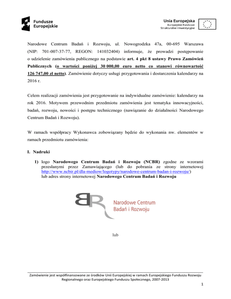 Narodowe Centrum Badań i Rozwoju, ul. Nowogrodzka 47a, 00-695 Warszawa (NIP: 701-007-37-77, REGON: 141032404) informuje, że prowadzi postępowanie o udzielenie zamówienia publicznego na podstawie art. 4 pkt 8 ustawy Prawo Zamówień Publicznych (o wartości poniżej 30 000,00 euro netto co stanowi równowartość 126 747,00 zł netto). Zamówienie dotyczy usługi przygotowania i dostarczenia kalendarzy na 2016 r. Celem realizacji zamówienia jest przygotowanie na indywidualne zamówienie: kalendarzy na rok 2016. Motywem przewodnim przedmiotu zamówienia jest tematyka innowacyjności, badań, rozwoju, nowości i postępu technicznego (nawiązanie do działalności Narodowego Centrum Badań i Rozwoju). W ramach współpracy Wykonawca zobowiązany będzie do wykonania nw. elementów w ramach przedmiotu zamówienia: I. Nadruki 1) logo Narodowego Centrum Badań i Rozwoju (NCBR) zgodne ze wzorami przesłanymi przez Zamawiającego (lub do pobrania ze strony internetowej http://www.ncbir.pl/dla-mediow/logotypy/narodowe-centrum-badan-i-rozwoju/) lub adres strony internetowej Narodowego Centrum Badań i Rozwoju lub ___________________________________________________________________________________________ Zamówienie jest współfinansowane ze środków Unii Europejskiej w ramach Europejskiego Funduszu Rozwoju Regionalnego oraz Europejskiego Funduszu Społecznego, 2007-2013 1 lub NCBR lub NCBR.gov.pl 1) logo Funduszy Europejskich (FE) zgodne ze wzorem zamieszczonym w Zasadach promocji i oznakowania projektów (do pobrania ze strony internetowej http://www.funduszeeuropejskie.gov.pl/strony/o-funduszach/promocja/zasadypromocji-i-oznakowania-projektow/#Zestawienie%20znak%C3%B3w). 1) symbol flagi Unii Europejskiej (UE) zgodny ze wzorem zamieszczonym w Zasadach promocji i oznakowania projektów (do pobrania ze strony internetowej http://www.funduszeeuropejskie.gov.pl/strony/o-funduszach/promocja/zasadypromocji-i-oznakowania-projektow/#Zestawienie%20znak%C3%B3w). Zamawiający dopuszcza użycie logo UE w formie uproszczonej, jeśli nadruk będzie mało czytelny. lub ___________________________________________________________________________________________ Zamówienie jest współfinansowane ze środków Unii Europejskiej w ramach Europejskiego Funduszu Rozwoju Regionalnego oraz Europejskiego Funduszu Społecznego, 2007-2013 2 II. Asortyment 1. Kalendarz książkowy 1.1 Parametry kalendarza książkowego: format okładki: w przedziale: 14-15 cm x 20-21 cm; rodzaj okładki: termoodbarwialna, matowa; kolor okładki: odcienie szarości lub stalowy (Zamawiający określi ostatecznie kolor okładki kalendarza książkowego wybranemu Wykonawcy); kalendarz spinany gumką (szerokość gumki w przedziale od 10 do 15 mm) w kolorze czerwonym – w układzie pionowym; kalendarz zawierający pętlę w kolorze czerwonym na długopis (zamocowana na tylnej wewnętrznej okładce), objętość kalendarza: w przedziale: 350-370 kartek białego papieru (offset) o gramaturze w przedziale: 70-90g/m2 – w tym: kalendarium około 320 stron mapy w przedziale: 5 - 8 stron; część przeznaczona na notatki: w przedziale 20 – 35 stron. Zamawiający zastrzega sobie możliwość zmiany koloru kartek gdy znajdzie to uzasadnienie w przedstawionym przez Wykonawcę projekcie graficznym kalendarza; układ kalendarium (w dwóch kolorach – nawiązanie do strony NCBR.gov.pl lub do logo NCBR): dzień na jednej stronie – indywidualny projekt kalendarium. Na każdej rozkładówce logo NCBR (sygnet) lub pełne logo NCBR lub NCBR.gov.pl. Zamawiający dopuszcza zamieszczenie także innych logotypów w kalendarium kalendarza; na tylnej okładce (wewnętrznej) kieszonka; tasiemka z nadrukiem NCBR.gov.pl (kolor tasiemki dopasowany do przygotowanego kalendarium) - napis powtarzalny na całej tasiemce. Tasiemka w rozmiarze: w przedziale 6 - 8 mm. Nadruk na tasiemce: 4 + 4. ___________________________________________________________________________________________ Zamówienie jest współfinansowane ze środków Unii Europejskiej w ramach Europejskiego Funduszu Rozwoju Regionalnego oraz Europejskiego Funduszu Społecznego, 2007-2013 3 wklejki: 4 wklejki (8 stron) zamieszczone z przodu kalendarza (drukowane 4+4) – papier (kreda) o gramaturze 120 - 150g/m2, wyklejka: na początku oraz na końcu kalendarza. Projekt oraz wykonanie wyklejki zależny od projektu kalendarium. Zamawiający dopuszcza zastosowanie dwóch wersji wyklejek: bez nadruku oraz z nadrukiem (np. czerwona wyklejka z nadrukiem np. NCBR.gov.pl – napis powtarzalny na całej wyklejce); ilość kalendarzy: 1 050 szt.; Okładka przednia: - tłoczenie na sucho nazw (literki o wysokości 4 mm) na całej okładce (nazwy programów i projektów realizowanych w Narodowym Centrum Badań i Rozwoju np. LIDER, STRATEGMED, BIOSTRATEG, CuBR, BRIdge, GO_GLOBAL.PL, TANGO, PBS, IniTech, PO KL, PO IG, PO IiŚ, PO IR, POWER itd.), - grzbiet okładki: tłoczenie na sucho: 2016 oraz nazwa strony: NCBR.gov.pl, - na okładce (w lewym dolnym rogu) zamieszczony napis NCBR (wypukłe litery NCBR – przyklejane osobno, wykonany z kompozytu, kolor srebrny błyszczący, wypukły, wolnostojący, samoprzylepny) w rozmiarze: grubość litery ok. 1-1,2 mm; wysokość literek ok. 7-9 mm; szerokość skrótu NCBR: ok. 2,5 – 2,8 cm; Okładka tylna: QR kod (odniesienie do strony NCBR.gov.pl) – wypukły o rozmiarze 2,5x2,5 cm lub 2,6x2,6 cm (naklejka żywiczna) oraz tłoczenie na sucho dwóch logotypów: FE oraz UE. Estetyczne opakowanie kartonowe na kalendarz z nadrukiem, tj. logo NCBR, NCBR.gov.pl, 2016 (Zamawiający zaznacza, że treść nadruku może ulec zmianie). Pudełko do kalendarza książkowego z obwolutą. Nadruk na pudełku i na obwolucie. Papier minimum 350 g/m2. Nadruk zabezpieczony lakierem lub innym uszlachetnieniem. Rozmiar pudełka oraz obwoluty dopasowany do rozmiaru kalendarza książkowego. ___________________________________________________________________________________________ Zamówie