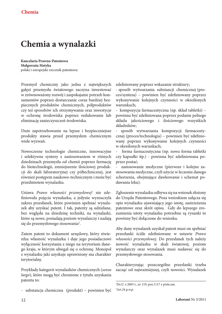 Chemia Chemia a wynalazki Kancelaria Prawno-Patentowa Małgorzata Matyka polski i europejski rzecznik patentowy Przemysł chemiczny jako jedna z największych gałęzi przemysłu światowego zaczyna inwestować w zrównoważony rozwój i zaspokajanie potrzeb konsumentów poprzez dostarczanie coraz bardziej bezpiecznych produktów chemicznych, półproduktów czy też sposobów ich otrzymywania oraz inwestycje w ochronę środowiska poprzez redukowanie lub eliminację zanieczyszczeń środowiska. Duże zapotrzebowanie na lepsze i bezpieczniejsze produkty stawia przed przemysłem chemicznym wiele wyzwań. Nowoczesne technologie chemiczne, innowacyjne i selektywne syntezy z zastosowaniem w różnych dziedzinach przemysłu od chemii poprzez farmację do biotechnologii, zmniejszenie ilościowej produkcji do skali laboratoryjnej czy półtechnicznej, jest również postępem naukowo-technicznym i może być przedmiotem wynalazku. Ustawa Prawo własności przemysłowej1 nie zdefiniowała pojęcia wynalazku, a jedynie wyznaczyła zakres przesłanek, które powinien spełniać wynalazek aby uzyskać patent. I tak, patenty są udzielane, bez względu na dziedzinę techniki, na wynalazki, które są nowe, posiadają poziom wynalazczy i nadają się do przemysłowego stosowania2. Zatem patent to dokument urzędowy, który stwierdza własność wynalazku i daje jego posiadaczowi wyłączność korzystania z niego na terytorium danego kraju, w którym ubiegał się o ochronę. Monopol z wynalazku jaki uzyskuje uprawniony ma charakter terytorialny. Przykłady kategorii wynalazków chemicznych (sensu largo), które mogą być chronione z tytułu uzyskania patentu to: - substancja chemiczna (produkt) – powinien być 12 zdefiniowany poprzez wskazanie struktury; - sposób wytwarzania substancji chemicznej (proces/synteza) – powinien być zdefiniowany poprzez wykonywanie kolejnych czynności w określonych warunkach; - kompozycja farmaceutyczna (np. skład tabletki) – powinna być zdefiniowana poprzez podanie pełnego składu jakościowego i ilościowego wszystkich składników; - sposób wytwarzania kompozycji farmaceutycznej (proces/technologia) – powinien być zdefiniowany poprzez wykonywanie kolejnych czynności w określonych warunkach; - forma farmaceutyczna (np. nowa forma tabletki czy kapsułki itp.) - powinna być zdefiniowana poprzez postać; - zastosowanie medyczne (pierwsze i kolejne zastosowania medyczne, czyli użycie w leczeniu danego schorzenia, obejmujące dawkowanie i schemat podawania leku). Zgłoszenie wynalazku odbywa się na wniosek złożony do Urzędu Patentowego. Poza wnioskiem załącza się opis wynalazku ujawniający jego istotę, zastrzeżenia patentowe oraz skrót opisu. Gdy do lepszego zrozumienia istoty wynalazku potrzebne są rysunki to powinny być dołączone do wniosku. Aby dany wynalazek uzyskał patent musi on spełniać przesłanki ściśle zdefiniowane w ustawie Prawo własności przemysłowej. Do przesłanek tych należy nowość wynalazku w skali światowej, poziom wynalazczy oraz wynalazek musi nadawać się do przemysłowego stosowania. Charakteryzując poszczególne przesłanki trzeba zacząć od najważniejszej, czyli nowości. Wynalazek Dz.U. z 2003 r., nr 119, poz.1117 z późn.zm. 1 Art.24 p.w.p. 2 Laborant Nr 3/2011 Chemia uważa się za nowy, jeśli nie jest on częścią stanu techniki. Przez stan techniki rozumie się wszystko to, co przed datą, według której oznacza się pierwszeństwo do uzyskania patentu, zostało udostępnione do wiadomości powszechnej w formie pisemnego lub ustnego opisu, przez stosowanie, wystawienie lub ujawnienie w inny sposób. Za stanowiące część stanu techniki uważa się również informacje zawarte w zgłoszeniach wynalazków lub wzorów użytkowych, korzystających z wcześniejszego pierwszeństwa, nieudostępnione do wiadomości powszechnej, pod warunkiem ich ogłoszenia w sposób określony w ustawie3. Drugą przesłanką jest poziom wynalazczy, którego synonimem jest nieoczywistość. Wynalazek posiada poziom wynalazczy, jeżeli nie wynika dla znawcy, w sposób oczywisty, ze stanu techniki. Wynalazek nie może wynikać z rutynowej pracy wynalazcy i musi być osiągnięty za pomocą konkretnych środków technicznych4. Trzecią przesłanką jest możliwość przemysłowego zastosowania wynalazku, czyli uzyskany wytwór lub wykorzystany sposób według wynalazku musi być w rozumieniu technicznym odtwarzalny za każdym razem. Ujawnienie istoty wynalazku w opisie poprzez cechy techniczne musi być wystarczające, tak aby osoba trzecia, która jest specjalistą w danej dziedzinie, mogła na podstawie ujawnionych informacji odtworzyć wynalazek bez wkładania w to dodatkowego wysiłku intelektualnego5. Istotne jest, że zastosowanie to powinno być możliwe w jakiejkolwiek działalności przemysłowej, nie wykluczając rolnictwa. Bardzo ważne jest aby wynalazek spełniał wszystkie przesłanki łącznie. Niespełnienie jakiejkolwiek przesłanki wyklucza możliwość udzielenia patentu. Opisy patentowe nie zawsze posiadały zastrzeżenia patentowe. Pierwsze zastrzeżenia wymagane aktem prawnym pojawiły się w Stanach Zjednoczonych w 1836 roku. Ciekawostką jest, że niektóre państwa europejskie w swoich opisach patentowych nie miały zastrzeżeń do 1970 roku. Zastrzeżenia patentowe określają zakres przedmiotowy patentu, poprzez wskazanie jego cech charakterystycznych. Wykładnią zastrzeżeń patentowych może być opis wynalazku i rysunki. www.czasopismolaborant.pl W Polsce ustawodawca dopuszcza możliwość wykładni poprzez opis i rysunki, ale nie wprowadza takiego obowiązku, w przeciwieństwie do Konwencji o patencie europejskim, gdzie opis i rysunki służą do interpretacji zastrzeżeń6. Charakterystyczne jest to, iż każdy opis patentowy zawiera dwie kategorie zastrzeżeń. Są to zastrzeżenia niezależne, które są obligatoryjne dla każdego opisu wynalazku. Zastrzeżenia te definiują wyna