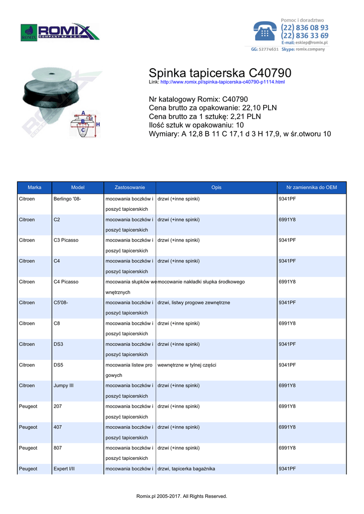 Spinka tapicerska C40790 Link: http://www.romix.pl/spinka-tapicerska-c40790-p1114.html Nr katalogowy Romix: C40790 Cena brutto za opakowanie: 22,10 PLN Cena brutto za 1 sztukę: 2,21 PLN Ilość sztuk w opakowaniu: 10 Wymiary: A 12,8 B 11 C 17,1 d 3 H 17,9, w śr.otworu 10 Marka Citroen Model Berlingo '08- Zastosowanie Opis mocowania boczków i drzwi (+inne spinki) Nr zamiennika do OEM 9341PF poszyć tapicerskich Citroen C2 mocowania boczków i drzwi (+inne spinki) 6991Y8 poszyć tapicerskich Citroen C3 Picasso mocowania boczków i drzwi (+inne spinki) 9341PF poszyć tapicerskich Citroen C4 mocowania boczków i drzwi (+inne spinki) 9341PF poszyć tapicerskich Citroen C4 Picasso mocowania słupków we mocowanie nakładki słupka środkowego 6991Y8 wnętrznych Citroen C5'08- mocowania boczków i drzwi, listwy progowe zewnętrzne 9341PF poszyć tapicerskich Citroen C8 mocowania boczków i drzwi (+inne spinki) 6991Y8 poszyć tapicerskich Citroen DS3 mocowania boczków i drzwi (+inne spinki) 9341PF poszyć tapicerskich Citroen DS5 mocowania listew pro wewnętrzne w tylnej części 9341PF gowych Citroen Jumpy III mocowania boczków i drzwi (+inne spinki) 6991Y8 poszyć tapicerskich Peugeot 207 mocowania boczków i drzwi (+inne spinki) 6991Y8 poszyć tapicerskich Peugeot 407 mocowania boczków i drzwi (+inne spinki) 6991Y8 poszyć tapicerskich Peugeot 807 mocowania boczków i drzwi (+inne spinki) 6991Y8 poszyć tapicerskich Peugeot Expert I/II mocowania boczków i drzwi, tapicerka bagażnika Romix.pl 2005-2017. All Rights Reserved. 9341PF poszyć tapicerskich Peugeot Expert III mocowania boczków i drzwi, tapicerka bagażnika 9341PF poszyć tapicerskich Peugeot Partner '08- mocowania boczków i drzwi i pokrywy bagażnika, boczki w tylnej częśc poszyć tapicerskich Renault Clio III Renault Espace IV Kangoo II Renault Megane II Renault Modus Renault Scenic II Renault Vel Satis 7703077469 a drzwi mocowania słupków we tapicerka pasa tylnego i bagażnika oraz tapicerk wnętrznych 7703077469 a drzwi mocowania słupków we tapicerka pasa tylnego i bagażnika oraz tapicerk wnętrznych 7703077469 a drzwi mocowania słupków we tapicerka pasa tylnego i bagażnika oraz tapicerk wnętrznych 7703077469 a drzwi mocowania słupków we tapicerka pasa tylnego i bagażnika oraz tapicerk wnętrznych 7703077469 a drzwi mocowania słupków we tapicerka pasa tylnego i bagażnika oraz tapicerk wnętrznych 7703077469 a drzwi mocowania słupków we tapicerka pasa tylnego i bagażnika oraz tapicerk wnętrznych Renault i mocowania słupków we tapicerka pasa tylnego i bagażnika oraz tapicerk wnętrznych 9341PF a drzwi Romix.pl 2005-2017. All Rights Reserved. 7703077469