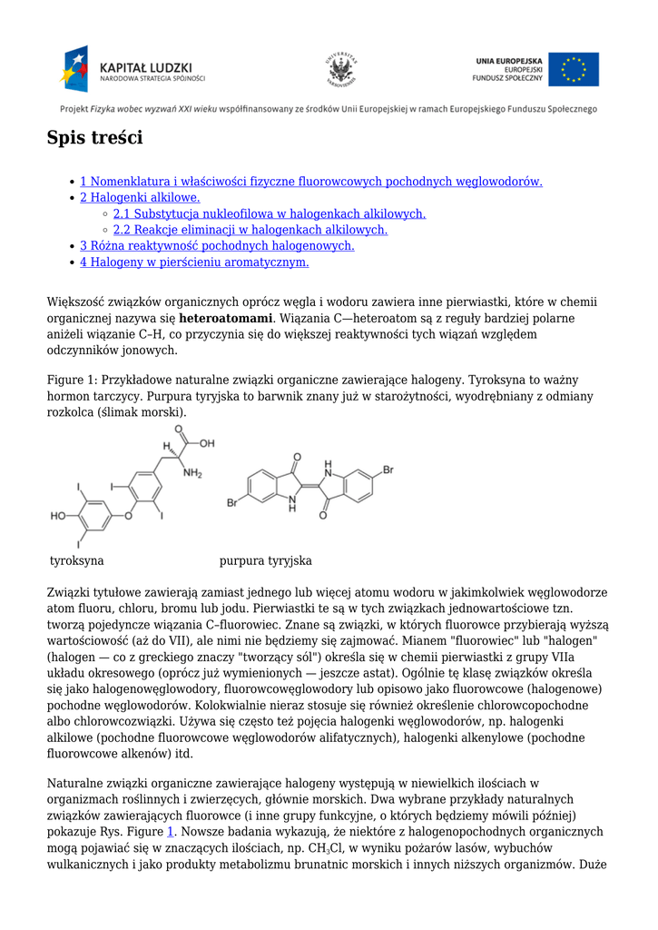 Spis treści 1 Nomenklatura i właściwości fizyczne fluorowcowych pochodnych węglowodorów. 2 Halogenki alkilowe. 2.1 Substytucja nukleofilowa w halogenkach alkilowych. 2.2 Reakcje eliminacji w halogenkach alkilowych. 3 Różna reaktywność pochodnych halogenowych. 4 Halogeny w pierścieniu aromatycznym. Większość związków organicznych oprócz węgla i wodoru zawiera inne pierwiastki, które w chemii organicznej nazywa się heteroatomami. Wiązania C—heteroatom są z reguły bardziej polarne aniżeli wiązanie C–H, co przyczynia się do większej reaktywności tych wiązań względem odczynników jonowych. Figure 1: Przykładowe naturalne związki organiczne zawierające halogeny. Tyroksyna to ważny hormon tarczycy. Purpura tyryjska to barwnik znany już w starożytności, wyodrębniany z odmiany rozkolca (ślimak morski). tyroksyna purpura tyryjska Związki tytułowe zawierają zamiast jednego lub więcej atomu wodoru w jakimkolwiek węglowodorze atom fluoru, chloru, bromu lub jodu. Pierwiastki te są w tych związkach jednowartościowe tzn. tworzą pojedyncze wiązania C–fluorowiec. Znane są związki, w których fluorowce przybierają wyższą wartościowość (aż do VII), ale nimi nie będziemy się zajmować. Mianem "fluorowiec" lub "halogen" (halogen — co z greckiego znaczy "tworzący sól") określa się w chemii pierwiastki z grupy VIIa układu okresowego (oprócz już wymienionych — jeszcze astat). Ogólnie tę klasę związków określa się jako halogenowęglowodory, fluorowcowęglowodory lub opisowo jako fluorowcowe (halogenowe) pochodne węglowodorów. Kolokwialnie nieraz stosuje się również określenie chlorowcopochodne albo chlorowcozwiązki. Używa się często też pojęcia halogenki węglowodorów, np. halogenki alkilowe (pochodne fluorowcowe węglowodorów alifatycznych), halogenki alkenylowe (pochodne fluorowcowe alkenów) itd. Naturalne związki organiczne zawierające halogeny występują w niewielkich ilościach w organizmach roślinnych i zwierzęcych, głównie morskich. Dwa wybrane przykłady naturalnych związków zawierających fluorowce (i inne grupy funkcyjne, o których będziemy mówili później) pokazuje Rys. Figure 1. Nowsze badania wykazują, że niektóre z halogenopochodnych organicznych mogą pojawiać się w znaczących ilościach, np. CH3Cl, w wyniku pożarów lasów, wybuchów wulkanicznych i jako produkty metabolizmu brunatnic morskich i innych niższych organizmów. Duże znaczenie mają one również w przemyśle Figure 2: Przykładowe nazwy fluorowcowych pochodnych węglowodorów. wzór nazwa wzór nazwa CH3Cl chlorometan (chlorek metylu) CH2Cl2 dichlorometan (chlorek metylenu) CHCl3 trichlorometan (chloroform) CCl4 tetrachlorometan (tetrachlorek węgla) CH3CH2CH2CH2I 1-jodobutan (jodek n-butylu) Cl—CH2—CH2—Cl 1,2-dichloroetan (chlorek etylenu) CH3—CHBr2 1,1-dibromoetan (bromek etylidenu) 1-bromo-2,2-dimetylopropan 1-chloro-2-metylopropan (chlorek izobutylu) chloroeten (chlorek winylu) 3-chloropropen (chlorek propenylu) 3-bromopropen (bromek allilu) 1-bromo-3-chlorobenzen (m-bromochlorobenzen) o-chlorotoluen jodek benzylu 1-chloro-1-fenyloetan 1-bromonaftalen ( -bromonaftalen) 1-chloro-8-jodonaftalen chemicznym jako reagenty do otrzymywania innych związków: polimerów (polichlorek winylu — synonimy: winidur, igelit, PCV lub PCW), leków, środków ochrony roślin, czynników chłodzących (freony — obecnie wychodzące z użycia — patrz niżej), środków gaśniczych (gaśnice halogenowe). Stwierdzono jednak, że związki te jakkolwiek wykazują dobre parametry techniczne, stanowią często problem ekologiczny, gdyż jako związki nienaturalne bardzo wolno ulegają biodegradacji i zanieczyszczają atmosferę, wodę i glebę na Ziemi. Mogą w efekcie stanowić zagrożenie dla ludzi i przyrody, jak np. dziura ozonowa spowodowana przedostawaniem się freonów do górnych warstw atmosfery. Nomenklatura i właściwości fizyczne fluorowcowych pochodnych węglowodorów. Systematyczne zasady nazywania związków z atomami fluorowców są takie same jak odpowiednich węglowodorów. Obecność heteroatomów zaznacza się w przedrostku jako fluoro-, chloro-, bromo- lub jodo- z odpowiednim lokantem wskazującym numer kolejny atomu węgla związanego z fluorowcem. W przypadku obecności różnych podstawników wymienia się je alfabetycznie, ale zawsze przed przedrostkami określającymi grupy alkilowe. Na Rys. Figure 2. podano kilka przykładów nazw organicznych związków fluorowców (w nawiasach podano nazwy zwyczajowe, stosowane równie często jak systematyczne). Właściwości fizyczne wybranych związków z tej klasy zebrane są poniżej w Tabeli Figure 3. Na ogół są to związki ciekłe (z wyjątkiem pierwszych członów szeregów homologicznych, które są gazami w temp. pokojowej, oraz związków o bardziej rozbudowanej strukturze, które są ciałami stałymi, np. CHI3), nierozpuszczalne w wodzie. Należy zwrócić uwagę na budowę dipolową halogenopochodnych węglowodorów. Wiąże się to ściśle z obecnością silnie spolaryzowanych wiązań w cząsteczkach tych związków. Figure 3: Właściwości fizyczne niektórych organicznych związków fluorowców. Związek T. wrz., °C T. topn., °C Gęstość, g/cm3 M. dipolowy, D CH3Cl -23,7 -97,6 CH2Cl2 40,1 -96,7 1,34 1,55 CHCl3 61,3 -63,5 1,50 1,15 CCl4 76,0 -22,8 1,63 0 CH3Br 4,6 -93,0 1,73 1,78 CH3I 42,5 -66,1 2,28 1,64 C6H5Cl 132,0 -45,0 1,11 1,56 C6H5Br 156,0 -30,6 1,50 1,53 C6H5l 188,6 -31,4 1,83 1,25 -119,4 1,40 1,79 CH2=CH—CH2Br 71,3 Atom fluorowca odznaczający się dużą elektroujemnością stanowi biegun ujemny dipolu (ściąga na siebie elektrony; w chemii organicznej mówimy, że wywiera ujemny efekt indukcyjny). W wyniku działania tego efektu atom węgla związany z fluorowcem obdarzony jest cząstkowym ładunkiem dodatnim, a efekt ten przenoszony jest na dalsze wiązania (atomy), chociaż ze słabnącą wraz z odległością siłą.
