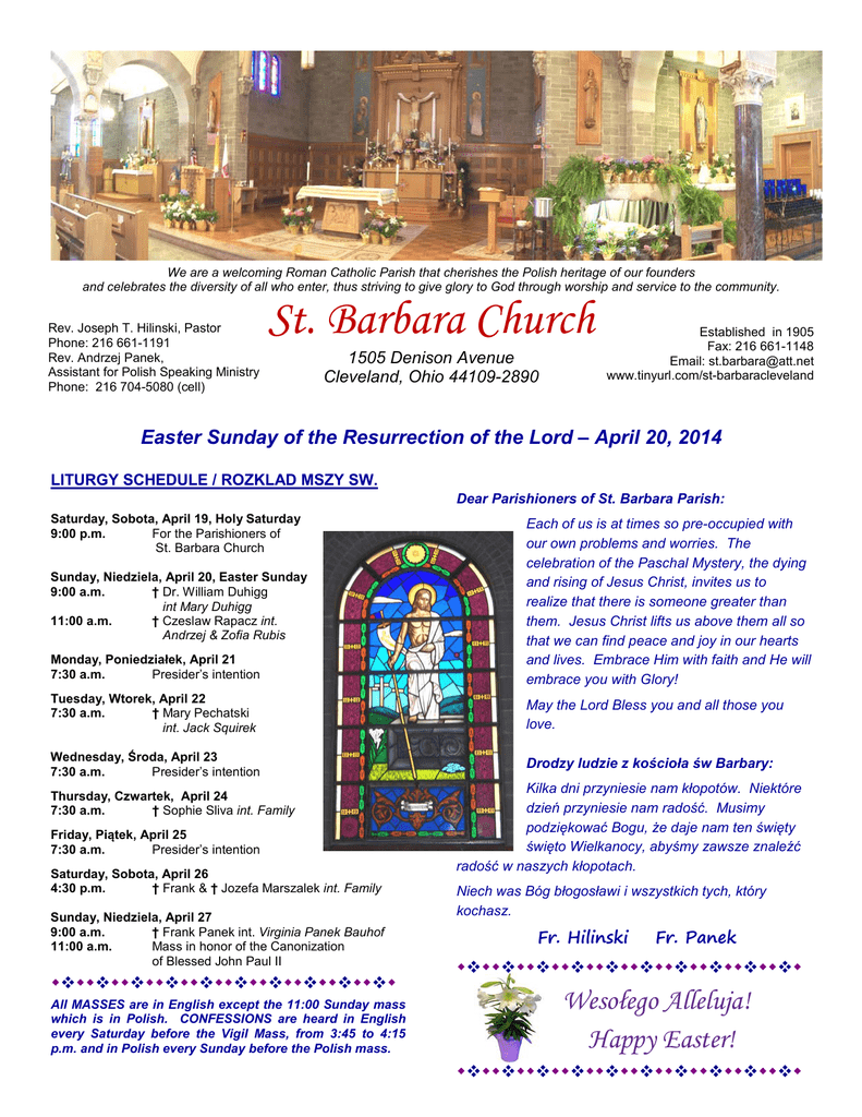 We are a welcoming Roman Catholic Parish that cherishes the Polish heritage of our founders and celebrates the diversity of all who enter, thus striving to give glory to God through worship and service to the community. Rev. Joseph T. Hilinski, Pastor Phone: 216 661-1191 Rev. Andrzej Panek, Assistant for Polish Speaking Ministry Phone: 216 704-5080 (cell) St. Barbara Church 1505 Denison Avenue Cleveland, Ohio 44109-2890 Established in 1905 Fax: 216 661-1148 Email: [email protected] www.tinyurl.com/st-barbaracleveland Easter Sunday of the Resurrection of the Lord – April 20, 2014 LITURGY SCHEDULE / ROZKLAD MSZY SW. Dear Parishioners of St. Barbara Parish: Saturday, Sobota, April 19, Holy Saturday 9:00 p.m. For the Parishioners of St. Barbara Church Monday, Poniedziałek, April 21 7:30 a.m. Presider’s intention Each of us is at times so pre-occupied with our own problems and worries. The celebration of the Paschal Mystery, the dying and rising of Jesus Christ, invites us to realize that there is someone greater than them. Jesus Christ lifts us above them all so that we can find peace and joy in our hearts and lives. Embrace Him with faith and He will embrace you with Glory! Tuesday, Wtorek, April 22 7:30 a.m. † Mary Pechatski int. Jack Squirek May the Lord Bless you and all those you love. Wednesday, Środa, April 23 7:30 a.m. Presider’s intention Drodzy ludzie z kościoła św Barbary: Sunday, Niedziela, April 20, Easter Sunday 9:00 a.m. † Dr. William Duhigg int Mary Duhigg 11:00 a.m. † Czeslaw Rapacz int. Andrzej & Zofia Rubis Thursday, Czwartek, April 24 7:30 a.m. † Sophie Sliva int. Family Friday, Piątek, April 25 7:30 a.m. Presider’s intention Saturday, Sobota, April 26 4:30 p.m. † Frank & † Jozefa Marszalek int. Family Sunday, Niedziela, April 27 9:00 a.m. † Frank Panek int. Virginia Panek Bauhof 11:00 a.m. Mass in honor of the Canonization of Blessed John Paul II All MASSES are in English except the 11:00 Sunday mass which is in Polish. CONFESSIONS are heard in English every Saturday before the Vigil Mass, from 3:45 to 4:15 p.m. and in Polish every Sunday before the Polish mass. Kilka dni przyniesie nam kłopotów. Niektóre dzień przyniesie nam radość. Musimy podziękować Bogu, że daje nam ten święty święto Wielkanocy, abyśmy zawsze znaleźć radość w naszych kłopotach. Niech was Bóg błogosławi i wszystkich tych, który kochasz. Fr. Hilinski Fr. Panek Wesołego Alleluja! Happy Easter! This Week’s Quote from BLESSED JOHN PAUL II Prayer List Please pray for our parishioners who are ill and all who are in need of our prayers: “Do not abandon yourselves to despair. We are the Easter people and hallelujah is our song.” Henry Arslanian, Phyllis Bobko, Donna Cuevas, Donald Friedl, Irene Heruminek, Joseph A. Hilinski, Clara Keck, Dorothy Noga, Kelli Shea, Ted Sliwa, Doris Wojton, Dora Wotowiec, Jeanette Woznicki From: http://www.goodreads.com PARISH HALL RENTAL After much discussion, the Finance Council would like to make use of renting the hall to raise money. Fr. Hilinski has given permission to do so. All rentals are handled through a committee of Shirley Banzet and Tom Adamski. Call 216 333-7386 or 216 941-0739. MEETING FOR THE CANONIZATION CELEBRATION There will be a meeting, Monday, April 21 at 7:00 p.m. in the Church Hall to review and finalize plans for the Celebration and Mass in honor of the Canonization of John Paul II. Everyone who is involved in the various aspects of the events should attend so that we can all share information. PARKING FOR NEXT WEEK’S EVENT Zyczenia Wielkanocne Na te Wielkanoc zyczyc Wam wypada Drodzy Rodacy: Ciepla domowego, milosci blizniego, Placka wybornego, spokoju swietego. Z modlitwa – ks.Andrzej 27 kwietnia uroczyste dziekczynienie za kanonizacje JP II godz.11:00 – program slowno muzyczny i po uroczystosci ciasto + kawa ”Nie bojcie sie zostac swietymi…" - Bl. Jan Pawel II Zycie i dzialalnosc – ciag dalszy Next week with the special celebration for the canonization of Pope John Paul II, we are asking that those who can to park their cars in the parking lot behind Horizon School (just down the street from the church) as well as using the parking lot on West 15th Street behind the church. In that way, more guests th might be able to use the West 16 Street parking area at the side of the rectory. Police have been hired to provide security for the event. 2 maja 1999 – JP II beatyfikuje stygmatyka O Pio W nastepnym tygodniu-27 kwietnia przezywac bedziemy Uroczystosc Kanonizacji Ojca sw.Jana Pawla II. Prosimy parkowac samochody za Szkola Horizon, jest ona przy ulicy blisko Kosciola, rowniez za Kosciolem to jest W.15, wtedy goscie beda miec do dyspozycji parking przy Kosciele W.16. Policja bedzie nam pomagac wlasciwie zaparkowac. 18 stycznia 2000 – JPII odprawia nabozenstwo ekumeniczne, m.in.przeprasza Zydow za przesladowania GREETERS 5 czerwca 1999 – 7 pielgrzymka do Polski 1 października 1999 – papiez oglasza patronami Europy swiete :Katarzyne Sienenska, Brygide Szwedzka, Terese Benedykte od Krzyza Edyte Stein 24 grudnia 1999 – o polnocy JPII otwiera Drzwi Swiete w Bazylice sw. Piotra na poczatek Wielkiego Jubileuszu Roku 2000 30 kwietnia 2000 – kanonizacja siostry Faustyny Kowalskiej 12 maja 2000 – wizyta w Fatimie, beatyfikacja dwojga dzieci wizjonerow: Franciszka i Hiacynty 18 czerwca 2000 – papiez otwiera Miedzynarodowy Kongres Eucharystyczny We will need extra volunteers to serve as greeters to welcome current parishioners, former parishioners and guests to our church. If you can help please let us know. 15 sierpnia 2000 – Swiatowy Dzien Mlodziezy w Rzymie BAKERY 31 października 2000 – JP II oglasza sw.Tomasza More, patronem politykow i rzadzacych We welcome any donations of bakery for the reception. Please bring your bakery to the Parish Hall next weekend. 1 października 2000 – kanonizacja 120 meczennikow z Chin i bl. Jozefiny Bakhita 23 czerwca 2000 – pielgrzymka na 