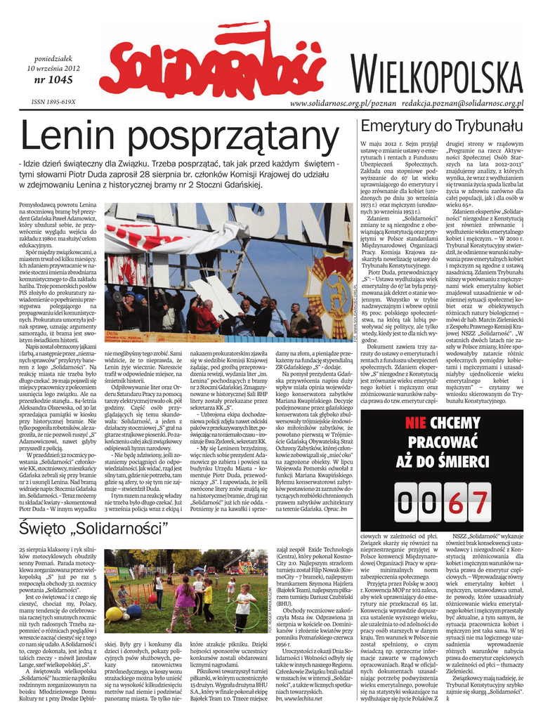 poniedziałek 10 września 2012 Lenin posprzątany nr 1045 ISSN 1895-619X Emerytury do Trybunału www.solidarnosc.org.pl/poznan [email protected] Pomysłodawcą powrotu Lenina na stoczniową bramę był prezydentGdańskaPawełAdamowicz, który ubzdurał sobie, że przywrócenie wyglądu wejścia do zakładuz1980r.masłużyćcelom edukacyjnym. Spór między związkowcami, a miastem trwał od kilku miesięcy. Ich zdaniem przywracanie w nazwie stoczni imienia zbrodniarza komunistycznego to dla zakładu hańba. Troje pomorskich posłów PiS złożyło do prokuratury zawiadomienie opopełnieniuprzestępstwa polegającego na propagowaniuidei komunistycznych. Prokuratura umorzyła jednak sprawę, uznając argumenty samorządu, iż brama jest swoistym świadkiem historii. Napiszostałobrzuconyjajkami ifarbą,anastępnieprzez„nieznanych sprawców” przykryty banerem z logo „Solidarności”. Na reakcję miasta nie trzeba było długo czekać. 29 maja pojawili się miejscypracownicyzpoleceniem usunięcia logo związku. Ale na przeszkodzie stanęła... 84-letnia Aleksandra Olszewska, od 30 lat sprzedająca pamiątki w kiosku przy historycznej bramie. Nie tylkopogoniłarobotników,alezagroziła, że nie pozwoli ruszyć „S” Adamowiczowi, nawet gdyby przyszedł z policją. W przeddzień 32 rocznicy powstania „Solidarności” członkowie KK, stoczniowcy, mieszkańcy Gdańska zebrali się przy bramie nr 2 i usunęli Lenina. Nad bramą widniejenapis:StoczniaGdańska im. Solidarności. - Teraz możemy tu składać kwiaty - skomentował Piotr Duda - W innym wypadku FOT. WWW.SOLIDARNOSC.ORG.PL - Idzie dzień świąteczny dla Związku. Trzeba posprzątać, tak jak przed każdym świętem tymi słowami Piotr Duda zaprosił 28 sierpnia br. członków Komisji Krajowej do udziału w zdejmowaniu Lenina z historycznej bramy nr 2 Stoczni Gdańskiej. niemoglibyśmy tego zrobić. Sami widzicie, że to nieprawda, że Lenin żyje wiecznie. Nareszcie trafił w odpowiednie miejsce, na śmietnik historii. Odpiłowywanie liter oraz Orderu Sztandaru Pracy za pomocą tarczy elektrycznej trwało ok. pół godziny. Część osób przyglądających się temu skandowała: Solidarność, a jeden z działaczy stoczniowej „S” grał na gitarze strajkowe piosenki. Po zakończeniucałejakcjizwiązkowcy odśpiewali hymn narodowy. - Nie będę zdziwiony, jeśli zostaniemy pociągnięci do odpowiedzialności. Jak widać, rząd jest silnytam,gdzieniepotrzeba,tam gdzie są afery, to się tym nie zajmuje – stwierdził Duda. I tym razem na reakcję władzy nie trzeba było długo czekać. Już 3 września policja wraz z ekipą i 25 sierpnia klaksony i ryk silników motocyklowych obudziły senny Poznań. Parada motocyklowazorganizowanaprzezwielkopolską „S” już po raz 5 rozpoczęła obchody 32. rocznicy powstania „Solidarności”. Jest co świętować i z czego się cieszyć, chociaż my, Polacy, mamy tendencję do celebrowania raczej tych smutnych rocznic niż tych radosnych Trzeba zapomnieć o różnicach poglądów i wreszcie zacząć cieszyć się z tego co nam się udało. A Solidarność i to, czego dokonała, jest jedną z takich rzeczy - mówił Jarosław Lange, szef wielkopolskiej „S”. A świętowała wielkopolska „Solidarność”hucznienapikniku rodzinnym zorganizowanym na boisku Młodzieżowego Domu Kultury nr 1 przy Drodze Dębiń- FOT. ROGER MIKOŁAJCZAK Święto „Solidarności” nakazem prokuratorskim zjawiła się w siedzibie Komisji Krajowej żądając, pod groźbą przeprowadzenia rewizji, wydania liter „im. Lenina” pochodzących z bramy nr2StoczniGdańskiej. Zmagazynowane w historycznej Sali BHP litery zostały przekazane przez sekretarza KK „S”. - Uzbrojona ekipa dochodzeniowa policji zdjęła nawet odciski palcówzprzekazywanychliter,poświęcającnatoniemałoczasu–ironizujeEwaZydorek,sekretarzKK. - My się Leninem brzydzimy, więc niech sobie prezydent Adamowicz go zabiera i powiesi na budynku Urzędu Miasta - komentuje Piotr Duda, przewodniczący „S”. I zapowiada, że jeśli zwrócone litery znów znajdą się na historycznej bramie, drugi raz „Solidarność” już ich nie odda. Potniemy je na kawałki i sprze- skiej. Były gry i konkursy dla dzieci i dorosłych, pokazy policyjnych psów służbowych, pokazy ratownictwa przedmedycznego,wkoszywozu strażackiego można było unieść się na wysokość kilkudziesięciu metrów nad ziemie i podziwiać panoramę miasta. To tylko nie- które atrakcje pikniku. Dzięki hojności sponsorów uczestnicy konkursów zostali obdarowani licznymi nagrodami. Piknikowi towarzyszył turniej piłkarski,wktórymuczestniczyło 15drużyn.WygraładrużynaBHU S.A.,którywfinalepokonałekipę Bajołek Team 1:0. Trzece miejsce damy na złom, a pieniądze przekażemynafundacjęstypendialną ZR Gdańskiego „S” - dodaje. Na pomysł prezydenta Gdańska przywrócenia napisu duży wpływ miała opinia wojewódzkiego konserwatora zabytków Mariana Kwapińskiego. Decyzje podejmowane przez gdańskiego konserwatora tak głęboko zbulwersowały trójmiejskie środowisko miłośników zabytków, że powołano pierwszą w Trójmieście Gdańską Obywatelską Straż Ochrony Zabytków, której członkowie zobowiązali się „mieć oko” na zagrożone obiekty. W lipcu Wojewoda Pomorski odwołał z funkcji Mariana Kwapińskiego. Byłemu konserwatorowi zabytków postawiono 21 zarzutów dotyczących rozbiórki chronionych prawem zabytków architektury na terenie Gdańska. Oprac. bn zajął zespół Exide Technologis (Centra), który pokonał KosmoCity 2:0. Najlepszym strzelcem turnieju został Filip Nowak (KosmoCity - 7 bramek), najlepszym bramkarzem Szymona Hajzlera (BajołekTeam),najlepszympiłkarzem turnieju Dariusz Czubiński (BHU). Obchody rocznicowe zakończyła Msza św. Odprawiona 31 sierpnia w kościele oo. Dominikanów i złożenie kwiatów przy pomniku Poznańskiego czerwca 1956 r. Uroczystości z okazji Dnia Solidarności i Wolności odbyły si
