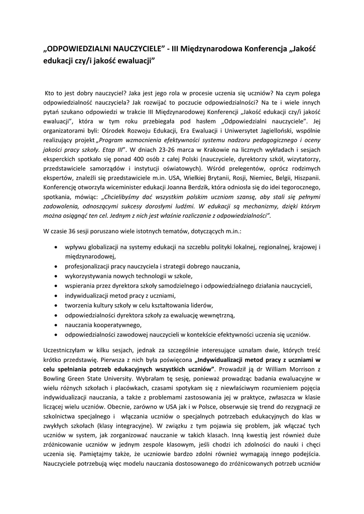 „ODPOWIEDZIALNI NAUCZYCIELE” - III Międzynarodowa Konferencja „Jakość edukacji czy/i jakość ewaluacji” Kto to jest dobry nauczyciel? Jaka jest jego rola w procesie uczenia się uczniów? Na czym polega odpowiedzialność nauczyciela? Jak rozwijać to poczucie odpowiedzialności? Na te i wiele innych pytań szukano odpowiedzi w trakcie III Międzynarodowej Konferencji „Jakość edukacji czy/i jakość ewaluacji”, która w tym roku przebiegała pod hasłem „Odpowiedzialni nauczyciele”. Jej organizatorami byli: Ośrodek Rozwoju Edukacji, Era Ewaluacji i Uniwersytet Jagielloński, wspólnie realizujący projekt „Program wzmocnienia efektywności systemu nadzoru pedagogicznego i oceny jakości pracy szkoły. Etap III”. W dniach 23-26 marca w Krakowie na licznych wykładach i sesjach eksperckich spotkało się ponad 400 osób z całej Polski (nauczyciele, dyrektorzy szkół, wizytatorzy, przedstawiciele samorządów i instytucji oświatowych). Wśród prelegentów, oprócz rodzimych ekspertów, znaleźli się przedstawiciele m.in. USA, Wielkiej Brytanii, Rosji, Niemiec, Belgii, Hiszpanii. Konferencję otworzyła wiceminister edukacji Joanna Berdzik, która odniosła się do idei tegorocznego, spotkania, mówiąc: „Chcielibyśmy dać wszystkim polskim uczniom szansę, aby stali się pełnymi zadowolenia, odnoszącymi sukcesy dorosłymi ludźmi. W edukacji są mechanizmy, dzięki którym można osiągnąć ten cel. Jednym z nich jest właśnie rozliczanie z odpowiedzialności”. W czasie 36 sesji poruszano wiele istotnych tematów, dotyczących m.in.: wpływu globalizacji na systemy edukacji na szczeblu polityki lokalnej, regionalnej, krajowej i międzynarodowej, profesjonalizacji pracy nauczyciela i strategii dobrego nauczania, wykorzystywania nowych technologii w szkole, wspierania przez dyrektora szkoły samodzielnego i odpowiedzialnego działania nauczycieli, indywidualizacji metod pracy z uczniami, tworzenia kultury szkoły w celu kształtowania liderów, odpowiedzialności dyrektora szkoły za ewaluację wewnętrzną, nauczania kooperatywnego, odpowiedzialności zawodowej nauczycieli w kontekście efektywności uczenia się uczniów. Uczestniczyłam w kilku sesjach, jednak za szczególnie interesujące uznałam dwie, których treść krótko przedstawię. Pierwsza z nich była poświęcona „Indywidualizacji metod pracy z uczniami w celu spełniania potrzeb edukacyjnych wszystkich uczniów”. Prowadził ją dr William Morrison z Bowling Green State University. Wybrałam tę sesję, ponieważ prowadząc badania ewaluacyjne w wielu różnych szkołach i placówkach, czasami spotykam się z niewłaściwym rozumieniem pojęcia indywidualizacji nauczania, a także z problemami zastosowania jej w praktyce, zwłaszcza w klasie liczącej wielu uczniów. Obecnie, zarówno w USA jak i w Polsce, obserwuje się trend do rezygnacji ze szkolnictwa specjalnego i włączania uczniów o specjalnych potrzebach edukacyjnych do klas w zwykłych szkołach (klasy integracyjne). W związku z tym pojawia się problem, jak włączać tych uczniów w system, jak zorganizować nauczanie w takich klasach. Inną kwestią jest również duże zróżnicowanie uczniów w jednym zespole klasowym, jeśli chodzi ich zdolności do nauki i chęci uczenia się. Pamiętajmy także, że uczniowie bardzo zdolni również wymagają innego podejścia. Nauczyciele potrzebują więc modelu nauczania dostosowanego do zróżnicowanych potrzeb uczniów w XXI wieku. Jednym z nich jest indywidualizacja metod pracy. Dr Morrison przytoczył definicję indywidualizacji za T. Hall: to podejście do nauczania i uczenia się z uwzględnieniem różnych możliwości uczniów w ramach tej samej klasy. Celem jest maksymalizacja rozwoju i indywidualnych osiągnięć każdego z nich, z uwzględnieniem jego możliwości, bez oczekiwania, że to uczeń ma dostosować się do programu nauczania. Indywidualizacja nie polega na tym, że będziemy uczyć wszystkich w jednakowy sposób lub będziemy „uśredniać” nauczanie do poziomu reprezentowanego przez większość dzieci. Indywidualizacja metod nauczania opiera się na założeniu, że skoro zainteresowania, style uczenia się, możliwości i wcześniejsze doświadczenia poszczególnych uczniów mają wypływ na ich wyniki w nauce, to należy stosować odpowiednio zróżnicowane strategie nauczania, materiały edukacyjne i tempo nauki. Punktem wyjścia do zastosowania indywidualizacji metod nauczania jest rozpoznanie: • • • gotowości ucznia (kompetencje ucznia lub możliwości przyswajania nowego materiału), jego zainteresowań (wynikających z wewnętrznej motywacji) profilu uczenia się (indywidualnych preferencji i stylu uczenia się) W oparciu o znajomość tych danych możemy różnicować co najmniej trzy elementy lekcji: • • • treść - wiedza, jaką uczeń ma zdobyć lub sposób, w jaki ma uzyskać wymagane informacje, proces - zadania, które wykonuje uczeń, aby zrozumieć przekazywaną treść, wyniki - powtarzanie, stosowanie i poszerzanie wiedzy zdobytej na lekcji. Na czym polega różnicowanie w tych trzech elementach lekcji, a co nim nie jest? Dr Morrison podał przykłady działań, które nie są indywidualizacją nauczania. Różnicowanie nie polega na: • • • • • • Zadawaniu zdolniejszym uczniom większej ilości pracy na tym samym poziomie. Wymaganiu od uczniów, którzy przyswoili dany materiał, aby uczyli tych, którzy mają z tym problemy. Dawaniu wszystkim uczniom tych samych zadań przez większość czasu. Tworzeniu „grup samopomocy”, które nie budują indywidualnej odpowiedzialności uczniów lub nie koncentrują się na treściach nowych dla wszystkich uczniów. Skupianiu się na słabych stronach uczniów i ignorowaniu ich mocnych stron. Indywidualizacji pracy wyłącznie na podstawie różnic w odpowiedziach uczniów na te same polecenia. Różnicowanie polega na: • • • • • Zadawaniu różnych pole