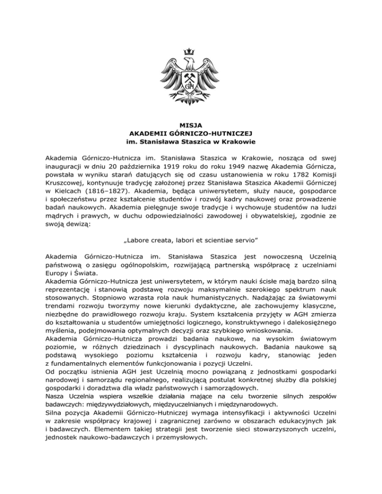 MISJA AKADEMII GÓRNICZO-HUTNICZEJ im. Stanisława Staszica w Krakowie Akademia Górniczo-Hutnicza im. Stanisława Staszica w Krakowie, nosząca od swej inauguracji w dniu 20 października 1919 roku do roku 1949 nazwę Akademia Górnicza, powstała w wyniku starań datujących się od czasu ustanowienia w roku 1782 Komisji Kruszcowej, kontynuuje tradycję założonej przez Stanisława Staszica Akademii Górniczej w Kielcach (1816–1827). Akademia, będąca uniwersytetem, służy nauce, gospodarce i społeczeństwu przez kształcenie studentów i rozwój kadry naukowej oraz prowadzenie badań naukowych. Akademia pielęgnuje swoje tradycje i wychowuje studentów na ludzi mądrych i prawych, w duchu odpowiedzialności zawodowej i obywatelskiej, zgodnie ze swoją dewizą: „Labore creata, labori et scientiae servio” Akademia Górniczo-Hutnicza im. Stanisława Staszica jest nowoczesną Uczelnią państwową o zasięgu ogólnopolskim, rozwijającą partnerską współpracę z uczelniami Europy i Świata. Akademia Górniczo-Hutnicza jest uniwersytetem, w którym nauki ścisłe mają bardzo silną reprezentację i stanowią podstawę rozwoju maksymalnie szerokiego spektrum nauk stosowanych. Stopniowo wzrasta rola nauk humanistycznych. Nadążając za światowymi trendami rozwoju tworzymy nowe kierunki dydaktyczne, ale zachowujemy klasyczne, niezbędne do prawidłowego rozwoju kraju. System kształcenia przyjęty w AGH zmierza do kształtowania u studentów umiejętności logicznego, konstruktywnego i dalekosiężnego myślenia, podejmowania optymalnych decyzji oraz szybkiego wnioskowania. Akademia Górniczo-Hutnicza prowadzi badania naukowe, na wysokim światowym poziomie, w różnych dziedzinach i dyscyplinach naukowych. Badania naukowe są podstawą wysokiego poziomu kształcenia i rozwoju kadry, stanowiąc jeden z fundamentalnych elementów funkcjonowania i pozycji Uczelni. Od początku istnienia AGH jest Uczelnią mocno powiązaną z jednostkami gospodarki narodowej i samorządu regionalnego, realizującą postulat konkretnej służby dla polskiej gospodarki i doradztwa dla władz państwowych i samorządowych. Nasza Uczelnia wspiera wszelkie działania mające na celu tworzenie silnych zespołów badawczych: międzywydziałowych, międzyuczelnianych i międzynarodowych. Silna pozycja Akademii Górniczo-Hutniczej wymaga intensyfikacji i aktywności Uczelni w zakresie współpracy krajowej i zagranicznej zarówno w obszarach edukacyjnych jak i badawczych. Elementem takiej strategii jest tworzenie sieci stowarzyszonych uczelni, jednostek naukowo-badawczych i przemysłowych. Uczelnia winna stać się swoistym konsorcjum akademicko-gospodarczym rozwijającym własną aktywność gospodarczą poprzez tworzenie warunków do transferu technologii i inkubacji przedsiębiorczości. Akademia Górniczo-Hutnicza została powołana do kształcenia i wychowywania studentów, kształcenia i rozwoju kadry naukowej oraz prowadzenia badań naukowych i prac rozwojowych zgodnie z zasadami wolności nauczania i wolności nauki, w duchu poszanowania jednostki i służby dla dobra kraju i ludzkości. KRAKÓW 2009 Dokument przyjęty przez Senat Akademii Górniczo-Hutniczej im. Stanisława Staszica w Krakowie na posiedzeniu w dniu 4 marca 2009 r. (uchwała Senatu AGH nr 37/2009).