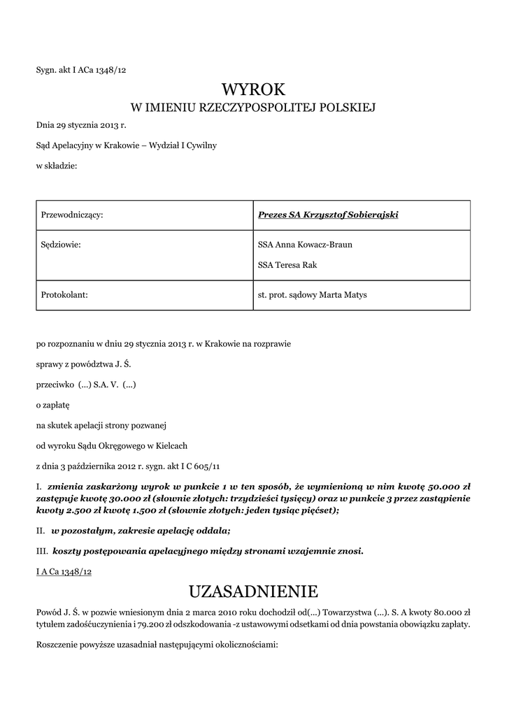 Sygn. akt I ACa 1348/12 WYROK W IMIENIU RZECZYPOSPOLITEJ POLSKIEJ Dnia 29 stycznia 2013 r. Sąd Apelacyjny w Krakowie – Wydział I Cywilny w składzie: Przewodniczący: Prezes SA Krzysztof Sobierajski Sędziowie: SSA Anna Kowacz-Braun SSA Teresa Rak Protokolant: st. prot. sądowy Marta Matys po rozpoznaniu w dniu 29 stycznia 2013 r. w Krakowie na rozprawie sprawy z powództwa J. Ś. przeciwko (...) S.A. V. (...) o zapłatę na skutek apelacji strony pozwanej od wyroku Sądu Okręgowego w Kielcach z dnia 3 października 2012 r. sygn. akt I C 605/11 I. zmienia zaskarżony wyrok w punkcie 1 w ten sposób, że wymienioną w nim kwotę 50.000 zł zastępuje kwotę 30.000 zł (słownie złotych: trzydzieści tysięcy) oraz w punkcie 3 przez zastąpienie kwoty 2.500 zł kwotę 1.500 zł (słownie złotych: jeden tysiąc pięćset); II. w pozostałym, zakresie apelację oddala; III. koszty postępowania apelacyjnego między stronami wzajemnie znosi. I A Ca 1348/12 UZASADNIENIE Powód J. Ś. w pozwie wniesionym dnia 2 marca 2010 roku dochodził od(...) Towarzystwa (...). S. A kwoty 80.000 zł tytułem zadośćuczynienia i 79.200 zł odszkodowania -z ustawowymi odsetkami od dnia powstania obowiązku zapłaty. Roszczenie powyższe uzasadniał następującymi okolicznościami: W dniu 21 sierpnia 2007 roku doszło do wypadku komunikacyjnego w którym powód doznał poważnych stłuczenia głowy i mózgu w wyniku czego powstał obrzęk tkanki mózgowej po stronie lewej, oraz krwiaki śródmózgowe, oraz licznych obtłuczeń i zadrapań ciała. Po wypadku powód przebywał w szpitalu. W skutek wypadku pogłębiły się problemy nowotworowe powoda, gdyż planowany zabieg operacyjny został odłożony w czasie w wyniku przedmiotowego zdarzenia. Na skutek wypadku powód był zdany na opiekę żony i najbliższej rodziny, ponieważ przez okres około miesiąca po wypadku powód nie poruszał się samodzielnie. Znacznie pogorszyła się jego aktywność fizyczna bo w skutek wypadku wystąpił niedowład lewej ręki i nadal jest zagrożony wystąpieniem padaczki pourazowej. Powód ma uciążliwe dolegliwości bólowe, nawracające bóle głowy, stany lękowe depresyjne, spowodowane wypadkiem, zaczął przejawiać cech hipochondrii. Strona pozwana uznając swoją odpowiedzialność co do zasady wniosła o oddalenie powództwa, gdyż w wypłaciła powodowi po przeprowadzeniu postępowania likwidacyjnego kwotę 24.877 zł, w tym 24.000 zł zadośćuczynienia i 877 zł odszkodowania. Ponadto podniosła zarzut przyczynienia się powoda do powstania lub zwiększenia rozmiarów szkody , przez to, że powód poruszał się rowerem bez działającego lub wyłączonego oświetlenia , czym spowodował, iż był mniej widoczny dla pozostałych uczestników ruchu. Wyrokiem wydanym w dniu 3 października 2012 roku Sąd Okręgowy w Kielcach zasądził od strony pozwanej na rzecz powoda kwotę 50.000 złotych zadośćuczynienia , oddalił poewódz6two w pozostałym zakresie , zniósł wzajemnie miedzy stronami koszty procesu, pobrał od strony pozwanej na rzecz Skarbu Państwa kwotę 2500 złotych tytułem opłaty od której powód był zwolniony. Wyrok powyższy został wydany w oparciu o następujące ustalenia faktyczne: W dniu 21 sierpnia 2007 roku w S., w terenie zabudowanym, na skrzyżowaniu ulic (...) około godziny 20.30. powód jechał rowerem ulicą (...) – na wprost. W tym czasie Ł. J., kierujący samochodem ciężarowym marki S. jechał tą samą ulicą , lecz w przeciwnym kierunku. Przed wypadkiem na skrzyżowaniu ulicy (...) na sygnalizatorze zapaliło się czerwone światło, skutkiem czego powód i kierowca S. zatrzymali swoje pojazdy. Powód miał zamiar przejechać skrzyżowanie po linii prostej, Ł. J. zamierzał skręcić w lewo – w ulicę (...). Przed nim zatrzymały się dwa samochody osobowe. Powód po przeciwnej stronie skrzyżowania stanął jako pierwszy, za nim stały dwa samochody osobowe. Gdy na sygnalizatorze zaświeciło się zielone światło, powód rozpoczął jazdę na wprost. stojące za nim samochody wyprzedziły go na skrzyżowaniu. W tym czasie stojące przed S.samochody po upływie około 5,0 – 5,5 pojechały przez skrzyżowanie na wprost zasłaniając jadącego rowerem powoda. Mimo tego Ł. J. rozpoczął skręcanie swym pojazdem przez skrzyżowanie w lewo. W momencie, gdy w polu widzenia Ł. J. pojawił się powód od na rowerzysty dzieliło go 40 m . Ł. J. nie reagował na jadącego z przeciwka rowerzystę i po upływie około trzech sekund nastąpiło zderzenie. W chwili wypadku panowały warunki widoczności odpowiadające jasnej stronie zmierzchu naturalnego – to znaczy zapadającego zmroku przy czym w czasie wypadku skrzyżowanie nie było oświetlone ulicznymi latarniami. Z badań roweru przeprowadzonych przez funkcjonariusza Policji , wynika, że po wypadku uszkodzony był kabel od dynama, oraz włącznik reflektorów głównych był wyłączony. Bezpośrednio po wypadku , ani w toku postępowania karnego nie zostały przeprowadzone badania oświetlenia roweru. Wiadomo tylko, że w nakładkach pedałów roweru zamontowane były światła odblaskowe, które przy oświetleniu ich światłami mijania i przy należytej obserwacji drogi widoczne są przed pojazdem w odległości 70 m. W momencie, gdy odległość między rowerem a samochodem wynosiła 40 metrów rower powoda znajdował się w strefie oświetlonej światłami mijania samochodu prowadzonego przez Ł. J. i zaistniały warunki do odbijania się świateł emitowanych przez reflektory w światłach odblaskowych w nakładkach pedałów. Kierujący samochodem – przy należytej obserwacji drogi- miał zdaniem sądu możliwość identyfikacji rowerzysty z odległości nie mniejszej niż około 40 metrów. Z tej odległości kierowca samochodu miał też możliwość uniknięcia zderzenia z rowerem przez rezygnację z podjętego manewru skręcani w lewo w ulicę (...), lub podjęcia manewru hamowania w momencie
