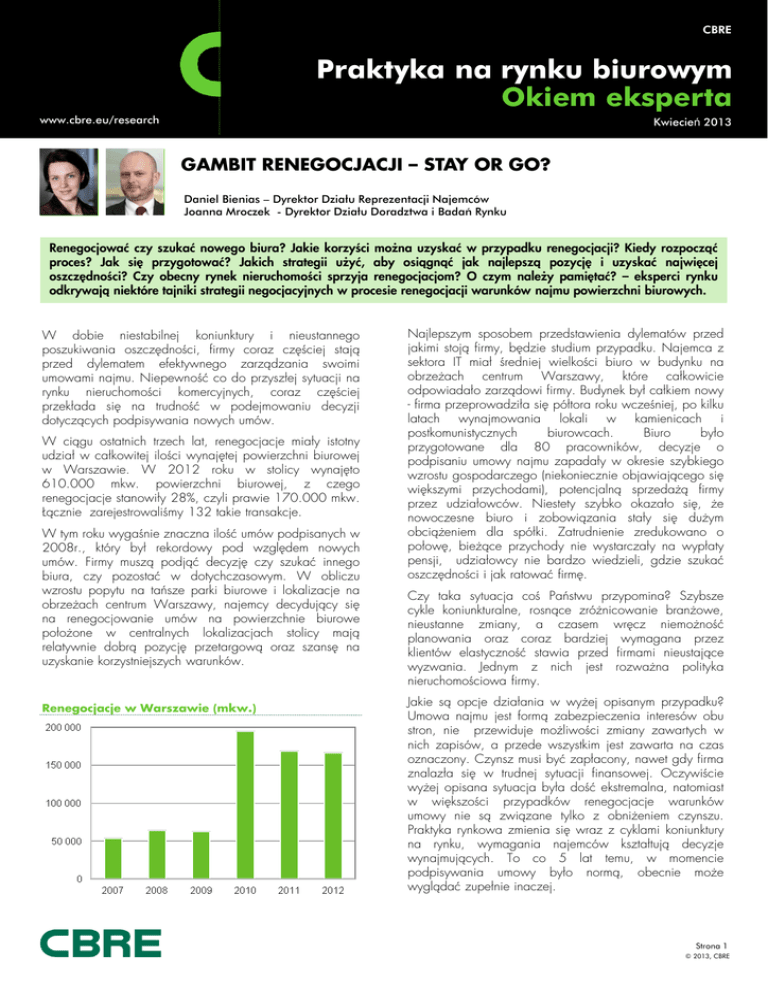 CBRE Praktyka na rynku biurowym Okiem eksperta www.cbre.eu/research Kwiecień 2013 GAMBIT RENEGOCJACJI – STAY OR GO? Daniel Bienias – Dyrektor Działu Reprezentacji Najemców Joanna Mroczek - Dyrektor Działu Doradztwa i Badań Rynku Renegocjować czy szukać nowego biura? Jakie korzyści można uzyskać w przypadku renegocjacji? Kiedy rozpocząć proces? Jak się przygotować? Jakich strategii użyć, aby osiągnąć jak najlepszą pozycję i uzyskać najwięcej oszczędności? Czy obecny rynek nieruchomości sprzyja renegocjacjom? O czym należy pamiętać? – eksperci rynku odkrywają niektóre tajniki strategii negocjacyjnych w procesie renegocjacji warunków najmu powierzchni biurowych. W dobie niestabilnej koniunktury i nieustannego poszukiwania oszczędności, firmy coraz częściej stają przed dylematem efektywnego zarządzania swoimi umowami najmu. Niepewność co do przyszłej sytuacji na rynku nieruchomości komercyjnych, coraz częściej przekłada się na trudność w podejmowaniu decyzji dotyczących podpisywania nowych umów. W ciągu ostatnich trzech lat, renegocjacje miały istotny udział w całkowitej ilości wynajętej powierzchni biurowej w Warszawie. W 2012 roku w stolicy wynajęto 610.000 mkw. powierzchni biurowej, z czego renegocjacje stanowiły 28%, czyli prawie 170.000 mkw. Łącznie zarejestrowaliśmy 132 takie transakcje. W tym roku wygaśnie znaczna ilość umów podpisanych w 2008r., który był rekordowy pod względem nowych umów. Firmy muszą podjąć decyzję czy szukać innego biura, czy pozostać w dotychczasowym. W obliczu wzrostu popytu na tańsze parki biurowe i lokalizacje na obrzeżach centrum Warszawy, najemcy decydujący się na renegocjowanie umów na powierzchnie biurowe położone w centralnych lokalizacjach stolicy mają relatywnie dobrą pozycję przetargową oraz szansę na uzyskanie korzystniejszych warunków. Renegocjacje w Warszawie (mkw.) Najlepszym sposobem przedstawienia dylematów przed jakimi stoją firmy, będzie studium przypadku. Najemca z sektora IT miał średniej wielkości biuro w budynku na obrzeżach centrum Warszawy, które całkowicie odpowiadało zarządowi firmy. Budynek był całkiem nowy - firma przeprowadziła się półtora roku wcześniej, po kilku latach wynajmowania lokali w kamienicach i postkomunistycznych biurowcach. Biuro było przygotowane dla 80 pracowników, decyzje o podpisaniu umowy najmu zapadały w okresie szybkiego wzrostu gospodarczego (niekoniecznie objawiającego się większymi przychodami), potencjalną sprzedażą firmy przez udziałowców. Niestety szybko okazało się, że nowoczesne biuro i zobowiązania stały się dużym obciążeniem dla spółki. Zatrudnienie zredukowano o połowę, bieżące przychody nie wystarczały na wypłaty pensji, udziałowcy nie bardzo wiedzieli, gdzie szukać oszczędności i jak ratować firmę. Czy taka sytuacja coś Państwu przypomina? Szybsze cykle koniunkturalne, rosnące zróżnicowanie branżowe, nieustanne zmiany, a czasem wręcz niemożność planowania oraz coraz bardziej wymagana przez klientów elastyczność stawia przed firmami nieustające wyzwania. Jednym z nich jest rozważna polityka nieruchomościowa firmy. Jakie są opcje działania w wyżej opisanym przypadku? Umowa najmu jest formą zabezpieczenia interesów obu stron, nie przewiduje możliwości zmiany zawartych w nich zapisów, a przede wszystkim jest zawarta na czas oznaczony. Czynsz musi być zapłacony, nawet gdy firma znalazła się w trudnej sytuacji finansowej. Oczywiście wyżej opisana sytuacja była dość ekstremalna, natomiast w większości przypadków renegocjacje warunków umowy nie są związane tylko z obniżeniem czynszu. Praktyka rynkowa zmienia się wraz z cyklami koniunktury na rynku, wymagania najemców kształtują decyzje wynajmujących. To co 5 lat temu, w momencie podpisywania umowy było normą, obecnie może wyglądać zupełnie inaczej. Strona 1 © 2013, CBRE Praktyka na rynku biurowym Okiem eksperta Znajdź doradcę! Najprostszym rozwiązaniem jest zatrudnienie doradcy do spraw nieruchomości. Jest to jedyny dobry sposób, aby profesjonalne przeprowadzić renegocjacje. Wynajmujący robią wszystko, aby wynająć szybko, jak najwięcej powierzchni i uzyskać wysoką cenę najmu, a najemcy mają ograniczone budżety i pragną uzyskać jak najwięcej korzyści i udogodnień od właściciela budynku. Dobry, doświadczony negocjator uzyska dla najemcy najkorzystniejsze warunki, i sprawi, że obie strony po renegocjacjach będą zadowolone. Doradcy, pracując aktywnie na rynku nieruchomości, mają wpływ na jego zmiany. Kształtowanie rynku, polega na umiejętnym wpływaniu na właścicieli nieruchomości, aby byli w stanie (czyli mogli przekonać swoich udziałowców, banki, zarządy) zaakceptować coś co na pierwszy rzut oka nie jest możliwe do zaakceptowania. Trzeba podkreślić również znaczenie słowa nieustannie – doradcy przeprowadzają transakcje codziennie, dobrze znają rynek, mają doświadczenie i potrafią przeanalizować sytuacje w sposób trafny, poparty konkretnymi przykładami. Doradcy potrafią w umiejętny sposób pozycjonować sytuację Najemcy, tak aby podczas rozmów uzyskać jak najwięcej korzyści. Szukaj oszczędności! Wynajmujący, planując swój biznes długoterminowo, starają się unikać ryzyka. Stabilność przychodów jest o wiele ważniejsza niż częste wymiany najemców, które związane są ze znacznymi wydatkami na marketing, prowizje agentów czy utrzymywanie wolnej powierzchni nie przynoszącej przychodu. Jeżeli właściciel budynku będzie przekonany, że kłopoty firmy są przejściowe, firma ma solidne podstawy i w zamian za krótkoterminowe obniżki może wydłużyć umowę najmu, można uzyskać potrzebne oszczędności. Analizuj sytuację! Renegocjacje muszą zostać poparte gruntowną analizą sytuacji najemcy i celów jakie chcemy osiągnąć: obniżka czynszu, zredukowanie ukrytych zobowiązań (nak