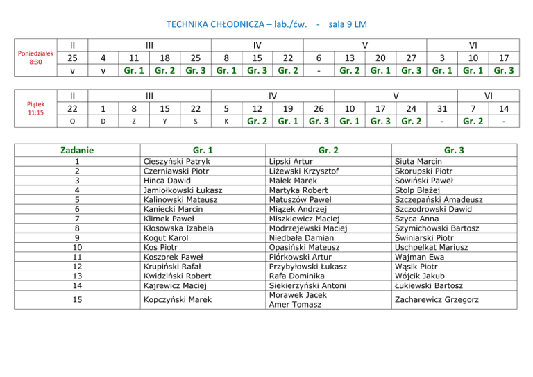 TECHNIKA CHŁODNICZA – lab./ćw. - sala 9 LM Poniedziałek 8:30 Piątek 11:15 II 25 v III 4 v 11 Gr. 1 18 Gr. 2 25 Gr. 3 8 Gr. 1 II 22 1 8 15 22 5 O D Z Y S K Zadanie IV 15 Gr. 3 III V 22 Gr. 2 6 - 13 Gr. 2 20 Gr. 1 IV Gr. 1 1 2 3 4 5 6 7 8 9 10 11 12 13 14 Cieszyński Patryk Czerniawski Piotr Hinca Dawid Jamiołkowski Łukasz Kalinowski Mateusz Kaniecki Marcin Klimek Paweł Kłosowska Izabela Kogut Karol Kos Piotr Koszorek Paweł Krupiński Rafał Kwidziński Robert Kajrewicz Maciej 15 Kopczyński Marek 12 Gr. 2 27 Gr. 3 3 Gr. 1 VI 10 Gr. 1 V 19 Gr. 1 26 Gr. 3 10 Gr. 1 Gr. 2 Lipski Artur Liżewski Krzysztof Małek Marek Martyka Robert Matuszów Paweł Miązek Andrzej Miszkiewicz Maciej Modrzejewski Maciej Niedbała Damian Opasiński Mateusz Piórkowski Artur Przybyłowski Łukasz Rafa Dominika Siekierzyński Antoni Morawek Jacek Amer Tomasz 17 Gr. 3 17 Gr. 3 VI 24 Gr. 2 31 - 7 Gr. 2 Gr. 3 Siuta Marcin Skorupski Piotr Sowiński Paweł Stolp Błażej Szczepański Amadeusz Szczodrowski Dawid Szyca Anna Szymichowski Bartosz Świniarski Piotr Uschpelkat Mariusz Wajman Ewa Wąsik Piotr Wójcik Jakub Łukiewski Bartosz Zacharewicz Grzegorz 14 - Zadanie 1 2 3 4 5 6 7 8 9 10 Obieg Obieg jednostopniowy z regeneracyjnym wymiennikiem ciepła Obieg jednostopniowy z regeneracyjnym wymiennikiem ciepła Obieg jednostopniowy z pompowym zasilaniem parownika Obieg jednostopniowy z pompowym zasilaniem parownika Obieg dwustopniowy z chłodnicą mokrą i dławieniem jednostopniowym Obieg dwustopniowy z chłodnicą mokrą i dławieniem jednostopniowym Obieg dwustopniowy z chłodnicą mokrą, z dławieniem jednostopniowym i z dochłodzeniem w chłodnicy 10 K Obieg dwustopniowy z chłodnicą mokrą, z dławieniem jednostopniowym i z dochłodzeniem w chłodnicy 10 K Obieg dwustopniowy z chłodnicą mokrą, z dławieniem jednostopniowym i z dochłodzeniem w chłodnicy Obieg dwustopniowy z chłodnicą mokrą, z dławieniem jednostopniowym i z dochłodzeniem w chłodnicy 11 Obieg dwustopniowy z dławieniem dwustopniowym 12 Obieg dwustopniowy z dławieniem dwustopniowym 13 14 15 Obiegi dwustopniowe: - z dławieniem jednostopniowym, - z dławieniem jednostopniowym i dochłodzeniem w chłodnicy, - z dławieniem dwustopniowym Obiegi dwustopniowe: - z dławieniem jednostopniowym, - z dławieniem jednostopniowym i dochłodzeniem w chłodnicy, - z dławieniem dwustopniowym Obieg dwustopniowy z międzystopniowym chłodzeniem zewnętrznym (z chłodnicą suchą) Zmienna Czynnik Dochłodzenie w RWC Dochłodzenie w RWC Krotność cyrkulacji Krotność cyrkulacji Ciśnienie międzystopniowe Ciśnienie międzystopniowe Ciśnienie międzystopniowe Ciśnienie międzystopniowe Dochłodzenie w chłodnicy (przy optymalnym pm) Dochłodzenie w chłodnicy (przy optymalnym pm) Ciśnienie międzystopniowe Ciśnienie międzystopniowe R R R R 134a 717 404A 717 Konfiguracja obiegu R 717 Konfiguracja obiegu R 507 Temperatura ssania sprężarki wysokiego stopnia R 134a, R 404A, R 717 R 717 R 507 R 717 R 507 R 717 R 404A R 717 R 404A Na wykresie przedstawić przebieg zmienności następujących wielkości: - współczynnik wydajności chłodniczej, - moce napędowe sprężarek, - wydajność cieplną skraplacza, - strumień masy w parowniku i w skraplaczu, - temperaturę tłoczenia, - jednostkową wydajność chłodniczą, - jednostkową wydajność chłodniczą objętościową. Do obliczeń przyjąć następujące wartości: - wydajność chłodnicza 100 kW, - temperatura skraplania +40C, - temperatura parowania dla obiegów jednostopniowych -10C, - temperatura parowania dla obiegów dwustopniowych -30C, - przegrzanie w parowniku dla zasilania ciśnieniowego 8 K, - brak dochłodzenia w skraplaczu. Zakres zmian wartości wielkości zmiennej uwzględnić w granicach fizycznie możliwych.