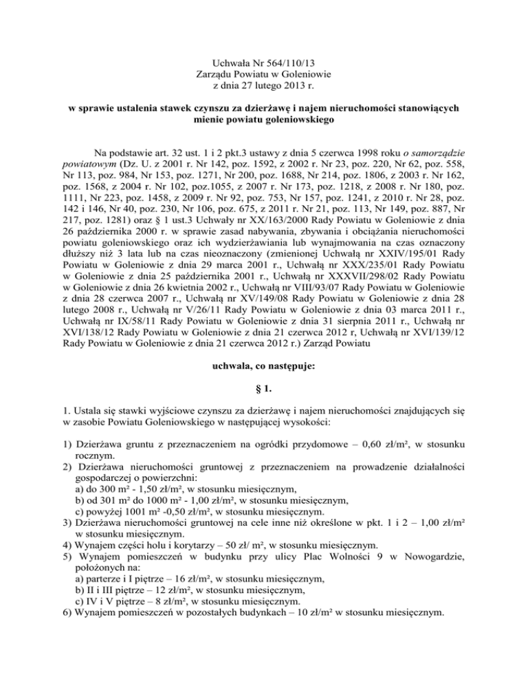 Uchwała Nr 564/110/13 Zarządu Powiatu w Goleniowie z dnia 27 lutego 2013 r. w sprawie ustalenia stawek czynszu za dzierżawę i najem nieruchomości stanowiących mienie powiatu goleniowskiego Na podstawie art. 32 ust. 1 i 2 pkt.3 ustawy z dnia 5 czerwca 1998 roku o samorządzie powiatowym (Dz. U. z 2001 r. Nr 142, poz. 1592, z 2002 r. Nr 23, poz. 220, Nr 62, poz. 558, Nr 113, poz. 984, Nr 153, poz. 1271, Nr 200, poz. 1688, Nr 214, poz. 1806, z 2003 r. Nr 162, poz. 1568, z 2004 r. Nr 102, poz.1055, z 2007 r. Nr 173, poz. 1218, z 2008 r. Nr 180, poz. 1111, Nr 223, poz. 1458, z 2009 r. Nr 92, poz. 753, Nr 157, poz. 1241, z 2010 r. Nr 28, poz. 142 i 146, Nr 40, poz. 230, Nr 106, poz. 675, z 2011 r. Nr 21, poz. 113, Nr 149, poz. 887, Nr 217, poz. 1281) oraz § 1 ust.3 Uchwały nr XX/163/2000 Rady Powiatu w Goleniowie z dnia 26 października 2000 r. w sprawie zasad nabywania, zbywania i obciążania nieruchomości powiatu goleniowskiego oraz ich wydzierżawiania lub wynajmowania na czas oznaczony dłuższy niż 3 lata lub na czas nieoznaczony (zmienionej Uchwałą nr XXIV/195/01 Rady Powiatu w Goleniowie z dnia 29 marca 2001 r., Uchwałą nr XXX/235/01 Rady Powiatu w Goleniowie z dnia 25 października 2001 r., Uchwałą nr XXXVII/298/02 Rady Powiatu w Goleniowie z dnia 26 kwietnia 2002 r., Uchwałą nr VIII/93/07 Rady Powiatu w Goleniowie z dnia 28 czerwca 2007 r., Uchwałą nr XV/149/08 Rady Powiatu w Goleniowie z dnia 28 lutego 2008 r., Uchwałą nr V/26/11 Rady Powiatu w Goleniowie z dnia 03 marca 2011 r., Uchwałą nr IX/58/11 Rady Powiatu w Goleniowie z dnia 31 sierpnia 2011 r., Uchwałą nr XVI/138/12 Rady Powiatu w Goleniowie z dnia 21 czerwca 2012 r, Uchwałą nr XVI/139/12 Rady Powiatu w Goleniowie z dnia 21 czerwca 2012 r.) Zarząd Powiatu uchwala, co następuje: § 1. 1. Ustala się stawki wyjściowe czynszu za dzierżawę i najem nieruchomości znajdujących się w zasobie Powiatu Goleniowskiego w następującej wysokości: 1) Dzierżawa gruntu z przeznaczeniem na ogródki przydomowe – 0,60 zł/m², w stosunku rocznym. 2) Dzierżawa nieruchomości gruntowej z przeznaczeniem na prowadzenie działalności gospodarczej o powierzchni: a) do 300 m² - 1,50 zł/m², w stosunku miesięcznym, b) od 301 m² do 1000 m² - 1,00 zł/m², w stosunku miesięcznym, c) powyżej 1001 m² -0,50 zł/m², w stosunku miesięcznym. 3) Dzierżawa nieruchomości gruntowej na cele inne niż określone w pkt. 1 i 2 – 1,00 zł/m² w stosunku miesięcznym. 4) Wynajem części holu i korytarzy – 50 zł/ m², w stosunku miesięcznym. 5) Wynajem pomieszczeń w budynku przy ulicy Plac Wolności 9 w Nowogardzie, położonych na: a) parterze i I piętrze – 16 zł/m², w stosunku miesięcznym, b) II i III piętrze – 12 zł/m², w stosunku miesięcznym, c) IV i V piętrze – 8 zł/m², w stosunku miesięcznym. 6) Wynajem pomieszczeń w pozostałych budynkach – 10 zł/m² w stosunku miesięcznym. 7) Wynajem sal konferencyjnych w budynku przy ulicy Dworcowej 1 w Goleniowie: a) sala 222- 70 zł/h b) sala 401 – 35 zł/h 8) Wynajem garaży wraz z gruntem niezbędnym do korzystania z garażu – 8 zł/m² w stosunku miesięcznym. 9) Wynajem/dzierżawa powierzchni reklamowych – 40 zł/m² w stosunku miesięcznym. 10) Wynajem połaci dachowej- 70 zł/m² w stosunku miesięcznym. 2. Do stawek czynszu dolicza się podatek VAT zgodnie z obowiązującymi przepisami. § 2. Ustalony czynsz oraz stawki wyjściowe do przetargu określone, będą corocznie waloryzowane w oparciu o średnioroczny wskaźnik wzrostu cen towarów i usług konsumpcyjnych za rok poprzedni ogłoszony przez Prezesa GUS w Monitorze Polskim. § 3. W uzasadnionych przypadkach Zarząd Powiatu może w drodze uchwały ustalić odmienną stawkę niż wynikająca z niniejszej uchwały. § 4. Traci moc uchwała: 1. Uchwały Nr 388/117/09 Zarządu Powiatu w Goleniowie z dnia 25 lutego 2009 r. w sprawie ustalenia stawek czynszu za dzierżawę i najem nieruchomości stanowiących mienie powiatu (zmieniona Uchwałą Nr 400/120/09 Zarządu Powiatu w Goleniowie z dnia 11 marca 2009 r. zmieniającą uchwałę Nr 388/117/09 Zarządu Powiatu w Goleniowie z dnia 25 lutego 2009 r. w sprawie ustalenia stawek czynszu za dzierżawę i najem nieruchomości stanowiących mienie powiatu, Uchwałą Nr 297/64/12 Zarządu Powiatu w Goleniowie z dnia 14 marca 2012 r. zmieniająca uchwałę w sprawie ustalenia stawek czynszu za dzierżawę i najem nieruchomości stanowiących mienie powiatu) § 5. Wykonanie uchwały powierza się Dyrektorowi Wydziału Gospodarki Nieruchomościami. § 6. Uchwała wchodzi w życie z dniem podjęcia. Przewodniczący Zarządu Powiatu Tomasz Stanisławski Uzasadnienie Podjęcie nowej uchwały w sprawie ustalenia stawek za dzierżawę i najem nieruchomości znajdujących się w zasobie Powiatu Goleniowskiego wynika z potrzeby dostosowania uchwały do rzeczywistego stanu nieruchomości jakimi dysponuje Powiat Goleniowski. Zmiana stawek została również wprowadzona w celu dostosowania do aktualnego stanu na rynku nieruchomości. Od dłuższego czasu na rynku nieruchomości występuje tendencja spadkowa, nie tylko co do transakcji kupna – sprzedaży nieruchomości, ale także co do dzierżawy i najmu. W związku z powyższym niezbędne jest podjęcie przedmiotowej uchwały. Opracowała: Iwona Sobczak