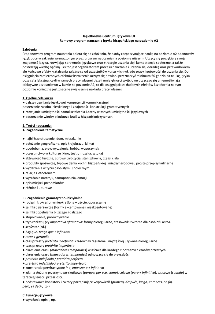 Jagiellońskie Centrum Językowe UJ Ramowy program nauczania języka hiszpańskiego na poziomie A2 Założenia Proponowany program nauczania opiera się na założeniu, że osoby rozpoczynające naukę na poziomie A2 opanowały język obcy w zakresie wyznaczonym przez program nauczania na poziomie niższym. Uczący się pogłębiają swoją znajomość języka, rozwijając sprawności językowe oraz strategie uczenia się i kompetencje społeczne, a także poszerzają wiedzę ogólną. Lektor jest organizatorem procesu nauczania i uczenia się, doradcą oraz przewodnikiem, ale końcowe efekty kształcenia zależne są od uczestników kursu – ich wkładu pracy i gotowości do uczenia się. Do osiągnięcia zamierzonych efektów kształcenia uczący się powinni przeznaczyć minimum 60 godzin na naukę języka poza salą lekcyjną, czyli w ramach pracy własnej. Jeżeli umiejętności wyjściowe uczącego się uniemożliwiają efektywne uczestnictwo w kursie na poziomie A2, to dla osiągnięcia zakładanych efektów kształcenia na tym poziomie konieczne jest znaczne zwiększenie nakładu pracy własnej. 1. Ogólne cele kursu ● dalsze rozwijanie językowej kompetencji komunikacyjnej poszerzanie zasobu leksykalnego i znajomości konstrukcji gramatycznych ● rozwijanie umiejętności samokształcenia i oceny własnych umiejętności językowych ● poszerzenie wiedzy o kulturze krajów hiszpańskojęzycznych 2. Treści nauczania: A. Zagadnienia tematyczne ● najbliższe otoczenie, dom, mieszkanie ● położenie geograficzne, opis krajobrazu, klimat ● upodobania, przyzwyczajenia, hobby, wypoczynek ● uczestnictwo w kulturze (kino, teatr, muzyka, sztuka) ● aktywność fizyczna, zdrowy tryb życia, stan zdrowia, części ciała ● produkty spożywcze, typowe dania kuchni hiszpańskiej i międzynarodowej, proste przepisy kulinarne ● wydarzenia w życiu osobistym i społecznym ● relacje z otoczeniem ● wyrażanie nastroju, samopoczucia, emocji ● opis miejsc i przedmiotów ● różnice kulturowe B. Zagadnienia gramatyczno-leksykalne ● rodzajnik określony/nieokreślony – użycie, opuszczanie ● zaimki dzierżawcze (formy akcentowane i nieakcentowane) ● zaimki dopełnienia bliższego i dalszego ● stopniowanie, porównywanie ● tryb rozkazujący imperativo afirmativo: formy nieregularne, czasowniki zwrotne dla osób tú i usted. ● ser/estar (cd.) ● hay que, tengo que + infinitivo ● estar + gerundio ● czas przeszły pretérito indefinido: czasowniki regularne i najczęściej używane nieregularne ● czas przeszły pretérito imperfecto ● określenia czasu (marcadores temporales) właściwe dla każdego z poznanych czasów przeszłych ● określenia czasu (marcadores temporales) odnoszące się do przyszłości ● pretérito indefinido / pretérito perfecto ● pretérito indefinido / pretérito imperfecto ● konstrukcje peryfrastyczne ir a, empezar a + infinitivo ● zdania złożone przyczynowo-skutkowe (porque, por eso, como), celowe (para + infinitivo), czasowe (cuando) w teraźniejszości i przeszłości. ● podstawowe konektory i zwroty porządkujące wypowiedź (primero, después, luego, entonces, en fin, pero, es decir, itp.) C. Funkcje językowe ● wyrażanie opinii, np. Pienso que…; En mi opinión…; Me parece que… ● dokonywanie wyboru, np. ¿Cuál prefieres: el negro o el rojo?; Es mejor comprar que alquilar; Prefiero comer una ensalada. ● wyrażanie swoich potrzeb, życzeń, oczekiwań, np. Quiero ir al cine. Necesito ayuda. Espero encontrar trabajo. ● wyrażanie prośby, proszenie / udzielanie pozwolenia, przepraszanie, usprawiedliwianie się, np. ¿M puedes dejar/dar…?; ¿Te importa si…?, No, en absoluto; Es que... ● gratulowanie; składanie życzeń powodzenia; wyrażanie zachwytu, zdziwienia, podziwu lub niezadowolenia, np. ¡Felicidades!, ¡Buen viaje!, ¡Suerte! ¡Feliz Navidad!, ¡ Qué bien!, ¡Qué rollo! ¡Qué + nombre + tan + adjetivo! ● opisanie prostych zdarzeń i czynności z przeszłości, np. Ayer leí un artículo interesante. Hace dos años estuvimos en Andalucía. La semana pasada fui a Madrid. ● opowiadanie o codziennych, powtarzających się czynnościach i zdarzeniach z przeszłości, np. De pequeña, cada verano iba con mi hermana al pueblo de mis abuelos. Todos los días nos levantábamos a las 6h. Los fines de semana salía con sus amigos. ● opowiadanie o podstawowych faktach biograficznych, np. Nació en 1989. En 2004 publicó su primer libro. Murieron en 1936. ● wyrażanie potrzeby, możliwości, nakazu i zakazu w formie osobowej i bezosobowej; wyrażanie prośby, polecenia, np. Hay que hacerlo. Es posible tener Internet gratis. ( No) se puede fumar. Se necesita personal. Tengo que comer menos. ¡Salgan de aquí! ● mówienie o samopoczuciu, stanie zdrowia, ogólnym stanie fizycznym, np. Estoy resfriada, me duelen las piernas, estoy nervioso ● wyrażanie pragnień, np. Me gustaría ir de vacaciones. ● składanie propozycji, przyjmowanie i odrzucanie ich, np. ¿Te apetece venir a mi fiesta? Vale, perfecto, lo siento, es que... ● Umawianie się na spotkania z przyjaciółmi, sugerowanie, akceptowanie i odmawianie propozycji ¿Cómo quedamos?, ¿Vienes conmigo? Lo siento, es que no puedo. Vale, de acuerdo 3. Przewidywane efekty kształcenia: Słuchanie Po zakończeniu kursu student potrafi zrozumieć: ● proste wypowiedzi powszechnie używane w sytuacjach życia codziennego, dotyczące pracy/studiów, rodziny, zdrowia, zainteresowań i upodobań, funkcjonowania sklepów, urzędów i innych instytucji, trybu życia, podróży, miejsca pobytu/zamieszkania ● proste informacje i komunikaty (dworzec, lotnisko, poczta, bank, itp.) ● podstawowe dane dotyczące jakiegoś miejsca (miasta, regionu, kraju) ● proste pytania i odpowiedzi oraz prośby/polecenia interlokutorów w sytuacjach publicznych (restauracja, hotel, lekarz, sklepy, środki transportu, punkt informacji turystycznej, sekret