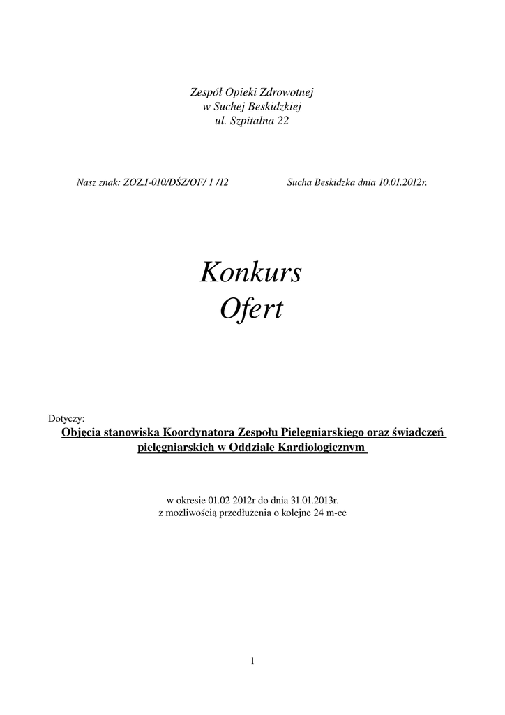 Zespół Opieki Zdrowotnej w Suchej Beskidzkiej ul. Szpitalna 22 Nasz znak: ZOZ.I010/DŚZ/OF/ 1 /12 Sucha Beskidzka dnia 10.01.2012r. Konkurs Ofert Dotyczy: Objęcia stanowiska Koordynatora Zespołu Pielęgniarskiego oraz świadczeń pielęgniarskich w Oddziale Kardiologicznym w okresie 01.02 2012r do dnia 31.01.2013r. z możliwością przedłużenia o kolejne 24 mce 1 I. Przedmiot zamówienia. 1. Przedmiotem zamówienia jest: objęcie stanowiska Koordynatora zespołu pielęgniarskiego i innego średniego medycznego oraz niższego, a także świadczenie usług pielęgniarskich w Oddziale Kardiologicznym na rzecz pacjentów Zespołu Opieki Zdrowotnej w Suchej Beskidzkiej. 2. Za świadczenia będące przedmiotem zamówienia uważa się czynności realizowane przez Pielęgniarkę Koordynującą w Oddziale Kardiologicznym, która jest bezpośrednim zwierzchnikiem pielęgniarek oraz całego personelu średniego i niższego zatrudnionego w oddziale. Swoje zadanie wykonuje zgodnie z aktualną wiedzą medyczną, posiadanymi kwalifikacjami, obowiązującymi standardami, procesami, zarządzeniami ustalonymi w zakładzie oraz zasadami etyki zawodowej w celu zapewnienia wysokiej jakości świadczonych usług. Zadania te realizuje poprzez organizowanie i nadzorowanie pracy podległego personelu, jednocześnie wykonując określone zadania na rzecz pacjentów, a także organizując kompleksową i ciągłą opiekę nad pacjentami, w szczególności: a) do głównych obowiązków Pielęgniarki Koordynującej należy: planowanie kompleksowej i ciągłej opieki pielęgniarskiej zapewnienie warunków organizacyjno technicznych do wykonywania zadań nadzorowanie zadań i ocena wyników utrzymywanie i rozwijanie dobrej atmosfery (życzliwy, taktowny i pełny wyrozumiałości stosunek do pacjenta, jego rodziny i współpracowników) b) do zadań Pielęgniarki Koordynującej w zakresie planowania należy w szczególności: planowanie opieki ustalanie celów i standardów opieki pielęgniarskiej systematyczne określanie rzeczywistego zapotrzebowania na opiekę pielęgniarską i pielęgnacyjną rozwijanie metod i technik pielęgnowania planowanie ilości i rodzaju narzędzi i materiałów niezbędnych do realizacji zadań c) do zadań Pielęgniarki Koordynującej w zakresie organizowania pracy zespołu pielęgniarskiego należy: – przydzielanie zadań do wykonania poszczególnym pielęgniarkom w zakresie opieki nad pacjentem – zaopatrzenie oddziału w potrzebny sprzęt, leki, materiały, odzież ochronną itp. – zorganizowanie prawidłowego żywienia pacjentów – zapewnienie bezpiecznych i higienicznych warunków pracy i pobytu pacjenta w oddziale – zapewnienie prawidłowego obiegu informacji w zespole – planowanie i układanie harmonogramów pracy podległego personelu, wnioskowanie w sprawach zatrudnienia – motywowanie pracowników do doskonalenia i stałego aktualizowania swojej wiedzy zawodowej w różnych formach kształcenia – zaopatrywanie oddziału i pracowników w sprzęt i środki ochrony osobistej niezbędne do bezpiecznego i higienicznego wykonywania pracy – zapewnienie wzorów dokumentów, sposobu rejestracji wykonanych czynności, przechowywanie informacji – zachowanie w tajemnicy informacji związanych z pacjentem w związku z wykonywaniem zawodu – odpowiedzialność za całokształt opieki pielęgniarsko pielęgnacyjnej w oddziale 2 nadzór i prowadzenie czynnego poradnictwa u pacjentów – sprawowanie nadzoru nad zgodnym z regulaminem i stanem sanitarno epidemiologicznym przebiegiem odwiedzin d) do obowiązków Pielęgniarki Koordynującej w zakresie nadzoru i kontroli należy: – rozliczanie pielęgniarek z wykonanych zadań z zakresu opieki pielęgniarskiej nad pacjentami – wykonywanie zleceń lekarskich i ich autoryzacja – ocena wiedzy i umiejętności podległego personelu – kontrola dyscypliny pracy – nadzorowanie prac sanitarno porządkowych – nadzór nad segregacją odpadów i materiału zakaźnego zgodnie z przyjętymi zasadami ścisłe przestrzeganie zasad aseptyki i antyseptyki, zapobieganie zakażeniom wewnątrzszpitalnym e) do prawidłowej realizacji zadań Pielęgniarki Koordynującej należy: – ustalenie treści i sposobu wykonywania świadczeń pielęgniarskich, przydzielenie zadań i uprawnień podwładnym pracownikom – współdecydowanie w sprawach kierowania na szkolenia i staże – współdecydowanie w sprawach organizacji jednostki f) czuwanie i monitorowanie w imieniu Zamawiającego nad przestrzeganiem przez personel pielęgniarski i inny średni medyczny oraz niższy Oddziału Kardiologicznego: – zaleceń Działu Jakości, Komitetów, Komisji i Zespołów z nim współpracujących – prawidłowego prowadzenia dokumentacji medycznej – przestrzegania przepisów oraz zasad bezpieczeństwa i higieny pracy, ochrony przeciwpożarowej i radiologicznej obowiązującej u Zamawiającego – powszechnie obowiązujących przepisów prawa, a także wewnętrznych przepisów obowiązujących u Zamawiającego. – 3. Za świadczenia będące przedmiotem zamówienia w zakresie usług pielęgniarskich realizowanych w Oddziale Kardiologicznym , uważa się w szczególności: a) rozpoznawanie warunków i potrzeb zdrowotnych b) rozpoznawanie problemów pielęgnacyjnych c) sprawowanie opieki pielęgnacyjnej d) wykonywanie czynności związanych z przyjęciem pacjenta e) prowadzenie dokumentacji pielęgniarskiej wg obowiązujących wymagań f) udział w wizycie lekarskiej, realizacja zleceń lekarskich w procesie diagnostyki, leczenia i rehabilitacji g) samodzielne udzielanie w określonym zakresie świadczeń zapobiegawczych, diagnostycznych, leczniczych i rehabilitacyjnych zgodnie z nabytymi uprawnieniami oraz na zasadach określonych w przepisach powszechnie obowiązujących w tym zakresie h) obserwacja i mierzenie parametrów niezbędnych do oceny stanu klinicznego pacjenta i) transport wewnętrzny, zaopatrzenie oddziału, opieka nad pacjentem poza