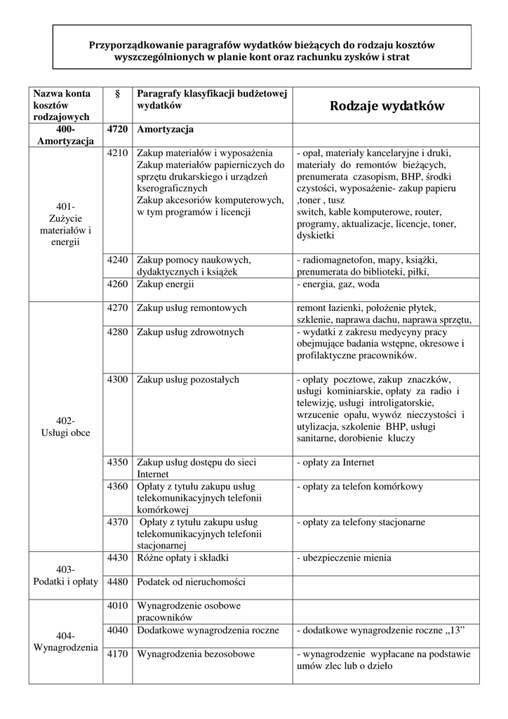Przyporządkowanie paragrafów wydatków bieżących do rodzaju kosztów wyszczególnionych w planie kont oraz rachunku zysków i strat Nazwa konta kosztów rodzajowych 400Amortyzacja 401Zużycie materiałów i energii § Paragrafy klasyfikacji budżetowej wydatków Rodzaje wydatków 4720 Amortyzacja 4210 Zakup materiałów i wyposażenia Zakup materiałów papierniczych do sprzętu drukarskiego i urządzeń kserograficznych Zakup akcesoriów komputerowych, w tym programów i licencji - opał, materiały kancelaryjne i druki, materiały do remontów bieżących, prenumerata czasopism, BHP, środki czystości, wyposażenie- zakup papieru ,toner , tusz switch, kable komputerowe, router, programy, aktualizacje, licencje, toner, dyskietki 4240 Zakup pomocy naukowych, dydaktycznych i książek 4260 Zakup energii - radiomagnetofon, mapy, książki, prenumerata do biblioteki, piłki, - energia, gaz, woda 4270 Zakup usług remontowych remont łazienki, położenie płytek, szklenie, naprawa dachu, naprawa sprzętu, - wydatki z zakresu medycyny pracy obejmujące badania wstępne, okresowe i profilaktyczne pracowników. 4280 Zakup usług zdrowotnych 4300 Zakup usług pozostałych - opłaty pocztowe, zakup znaczków, usługi kominiarskie, opłaty za radio i telewizję, usługi introligatorskie, wrzucenie opału, wywóz nieczystości i utylizacja, szkolenie BHP, usługi sanitarne, dorobienie kluczy 4350 Zakup usług dostępu do sieci Internet 4360 Opłaty z tytułu zakupu usług telekomunikacyjnych telefonii komórkowej 4370 Opłaty z tytułu zakupu usług telekomunikacyjnych telefonii stacjonarnej 4430 Różne opłaty i składki - opłaty za Internet 402Usługi obce - opłaty za telefon komórkowy - opłaty za telefony stacjonarne - ubezpieczenie mienia 403Podatki i opłaty 4480 Podatek od nieruchomości 404Wynagrodzenia 4010 Wynagrodzenie osobowe pracowników 4040 Dodatkowe wynagrodzenia roczne 4170 Wynagrodzenia bezosobowe - dodatkowe wynagrodzenie roczne „13” - wynagrodzenie wypłacane na podstawie umów zlec lub o dzieło 405 Ubezpieczenia społeczna i inne świadczenia 409Pozostałe koszty rodzajowe 3020 Wydatki osobowe niezaliczone do wynagrodzeń 4110 Składki na ubezpieczenie społeczne 4120 Składki na Fundusz Pracy 4440 Odpisy na ZFSŚ 3030 Różne wydatki na rzecz osób fizycznych 4410 Podróże służbowe krajowe 4420 Podróże służbowe zagraniczne 4700 Szkolenie pracowników - składki na ubezpieczenia społeczne - składki na Fundusz Pracy - dofinansowanie msu, studiów podyplomowych, kursów, szkoleń - delegacje - delegacje - dofinansowanie kursów i szkoleń Wykaz kont kosztów wraz z przynależnymi paragrafami oraz kwalifikacją wydatków – Program COMENIUS „Być obcym, być przyjacielem „1939, 2009 i 2050” Konto 401-2 § Nazwa paragrafu 4217 Zakup materiałów i wyposażenia 4307 Zakup usług pozostałych 402-2 403-2 409-2 Wydatki - materiały biurowe, wyposażenie, materiały niezbędne do realizacji projektu - opłaty pocztowe, zakup znaczków, wynajem sal, catering 4437 Różne opłaty i składki - ubezpieczenie 4417 Podróże służbowe krajowe - delegacje krajowe 4427 Podróże służbowe zagraniczne - delegacje zagraniczne Przyporządkowanie paragrafów wydatków bieżących do rodzaju kosztów wyszczególnionych w planie kont oraz rachunku zysków i strat Projekt za okres od 01-04-2011 do 30 listopada 2011 „ Wyposażenie dwóch pracowni komputerowych w Technikum Nr1 „ Konto § Nazwa paragrafu 401-3 4247 Zakup pomocy naukowych , dydaktycznych i książek 401-3 4249 Zakup pomocy naukowych , dydaktycznych i książek 402-3 4307 Zakup usług pozostałych Wydatki - zakup komputerów dla ucznia i nauczyciela , serwera , urządzeń wielofunkcyjnych( drukarka , skaner, kopiarka ) urządzeń sieciowe typu router , projektory , ekrany ścienne , komputery przenośne ,licencjonowane oprogramowanie niezbędne do realizacji projektu - zakup komputerów dla ucznia i nauczyciela , serwera , urządzeń wielofunkcyjnych( drukarka , skaner, kopiarka ) urządzeń sieciowe typu router , projektory , ekrany ścienne , komputery przenośne ,licencjonowane oprogramowanie niezbędne do realizacji projektu - promocja projektu ,opłaty za przeprowadzenie audytu - promocja projektu ,opłaty za przeprowadzenie audytu 402-3 4309 Zakup usług pozostałych Wykaz kont wraz z przynależnymi paragrafami oraz kwalifikacją wydatków z dochodów własnych w jednostce budżetowej –Zespołu Szkół Nr 1 w Działdowie. Konto 401-4 402-4 § Nazwa paragrafu 4210 Zakup materiałów i wyposażenia - materiały biurowe, wyposażenie, materiały niezbędne do realizacji projektu 4240 Zakup pomocy naukowych, dydaktycznych i książek - radiomagnetofon, mapy, książki, prenumerata do biblioteki, piłki, 4260 Zakup energii -energia ,woda - zakup znaczków, wywóz nieczystości i utylizacja, 4300 Zakup usług pozostałych 4480 Podatek od nieruchomości 403-4 Wydatki Opłata za ośrodek wypoczynkowy w Tarczynach