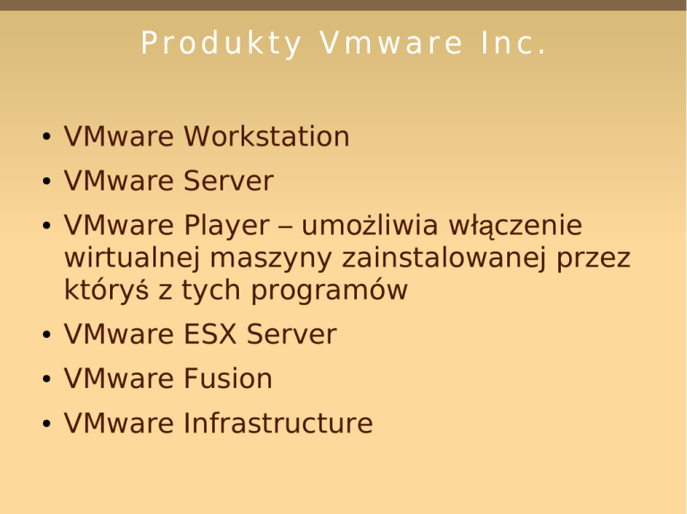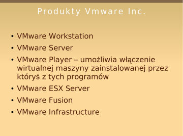 Produkty Vmware Inc. ● VMware Workstation ● VMware Server ● VMware Player – umożliwia włączenie wirtualnej maszyny zainstalowanej przez któryś z tych programów ● VMware ESX Server ● VMware Fusion ● VMware Infrastructure VMwareWorkstation ● Obecna wersja: Workstation 6.0 ● Działa i symuluje: Intel x86, AMD64 ● Host: – ● ● Windows, Linux Guest (prawie wszystkie OS): – Windows, RedHat, Ubuntu, Mandriva, Solaris – Symmetric multiprocessing(SMP) Pełna lista: http://pubs.vmware.com/guestnotes/wwhelp/ Składniki ● Główne komponenty Workstation: – VM Driver - sterowniki urządzeń, przełączanie VMM i OS hosta.Działa jako część systemu operacyjnego hosta – VMM – monitor, działa na fizycznym sprzęcie) – VM Application (VMApp) - działa jako aplikacja, używa sterowników z VM Driver, aby załadować VMM Struktura Cechy ● ● ● Przedstawiciel właściwej wirtualizacji Działa w komputerach o architekturze x86(nie jest to duże ograniczenie) Pozwala na pracę kilku systemów operacyjnych na raz Sprzę t ● ● ● Możliwość symulowania hardware'u, np. zamiast stacji CD pliki iso Adaptowanie urządzeń komputera-hosta Pozwala podłączyć się do sieci internetowej Funkcjonalnoś ć ● ● ● ● Producent deklaruje szybkość działania OS nawet do 80% Dobry do testowania działania aplikacji na różnych OS Można łączyć systemy w teamy Można klonować OS – oszczędnośc czasu, nie trzeba od nowa instalować Plusy ● Możliwość robienia wielu snapshotów (zapamiętywanie stanu OS) ● Prosty, okienkowy interfejs ● Zakładki ● Możliwość przenoszenia OS między innymi produktami Vmware, np. Wstrzymanie systemu i włączenie na innmym komputerze Minusy ● ● Duży narzut czasowy na dostęp do pamięci Używanie tylko takiego procesora jakim dysponuje gospodarz ● Kłopoty z grafiką 3D ● Na laptonie problemy po hibernacji ● Niestety tylko 30-dniowa darmowa wersja Instalacja ● ● Pobrać plik instalacyjny dla Windowsa lub Linuxa ze strony http://www.vmware.com/download/ws/ W Windowsie: – File -> New -> Virtual Mashine – Tworzy się nowa zakładka dla wirtualnej maszyny – Trzeba teraz zainstalować system. Włączamy nasz wirtualny OS i wkładamy płytkę instalacyjną – Dalej jak przy zwykłej instalacji VMware Tools ● ● ● ● po zainstalowaniu maszyny wirtualnej dzielenie plików między hostem i guestem (shared folder, drag and drop) poprawia jakość grafiki synchronizuje czas między guestem a hostem ● przełączanie kursora za ruchem myszy ● umożliwia dodawanie i usuwanie urządzeń ● zmiana rozmiaru dysku wirtualnego (Shrink) VMware Server ● ● ● ● Podobny do Workstation Umożliwia pracę na OS z różnych komputerów Po odłączeniu hosta guest działa Wolniejsze przywracanie systemu po snapshocie niż dla Workstation ● Kompatybilny z Workstation ● Darmowy! ● ● ● ● ● ● Vmware Infrastructure Dla dużych korporacji i firm IT Istniejące serwery łączymy w jedną pulę zasobów Ta pula jest wykorzystywana do udostępniania wirtualnych serwerów Lepsze przydzielania zasobów W razie awarii przeniesienie wirtualnej maszyny na inny serwer Zastosowania ● ● ● ● ● ● Przede wszystkim dla programistów Bezpieczne uruchamianie testowanych aplikacji Testowanie złożonych aplikacji sieciowych na pojedynczej maszynie Testowanie SO - bez ciągłych rebootów. Testowanie software'u na różnych systemach na jednym komputerze Instalacja nowych systemów bez robienia nowych partycji Workstation vs. Virtual PC ● Trochę wolniejszy ● Ale ma zakładki ● Można klonować ● Symuluje architekturę wieloprocesorową ● Sprytnie zarządza pamięcią