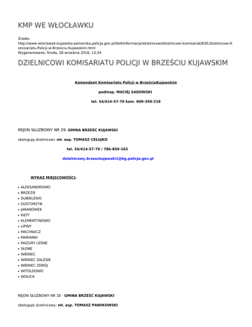 KMP WE WŁOCŁAWKU Źródło: http://www.wloclawek.kujawsko-pomorska.policja.gov.pl/kb4/informacje/dzielnicowi/dzielnicowi-komisariat/630,Dzielnicowi-K omisariatu-Policji-w-Brzesciu-Kujawskim.html Wygenerowano: Środa, 28 września 2016, 13:24 DZIELNICOWI KOMISARIATU POLICJI W BRZEŚCIU KUJAWSKIM Komendant Komisariatu Policji w BrześciuKujawskim podinsp. MACIEJ SADOWSKI tel. 54/414-57-70 kom. 609-350-218 REJON SŁUŻBOWY NR 29- GMINA BRZEŚĆ KUJAWSKI obsługują dzielnicowi: mł. asp. TOMASZ CEŁUJKO tel. 54/414-57-70 / 786-859-163 [email protected] WYKAZ MIEJSCOWOŚCI: ● ALEKSANDROWO ● BRZEZIE ● DUBIELEWO ● GUSTORZYN ● JARANÓWEK ● KĄTY ● KLEMENTYNOWO ● LIPINY ● MACHNACZ ● MARIANKI ● MAZURY LEŚNE ● SŁONE ● WIENIEC ● WIENIEC ZALESIE ● WIENIEC ZDRÓJ ● WITOLDOWO ● WOLICA REJON SŁUŻBOWY NR 30 - GMINA BRZEŚĆ KUJAWSKI obsługuje dzielnicowy: mł. asp. TOMASZ PAWIKOWSKI tel. 54/414-57-70 / 786-859-158 [email protected] WYKAZ MIEJSCOWOŚCI: ● FALBOREK ● FALBORZ ● FALBORZ KOLONIA ● GUŹLIN ● JĄDROWICE ● KĄKOWA WOLA ● KĄKOWA WOLA PARCELE ● KUCZYNA ● MIECHOWICE ● MIECHOWICE DUŻE ● NOWE MIECHOWICE ● PARCELE SOKOŁOWSKIE ● PIKUTKOWO ● REDECZ KRUKOWY ● RZADKA WOLA ● RZADKA WOLA PARCELE ● SOKOŁOW ● STAROBRZESKA KOLONIA ● STARY BRZEŚĆ REJON SŁUŻBOWY NR 31 - MIASTO BRZEŚĆ KUJAWSKI obsługuje dzielnicowy: st. asp. ROBERT WÓJTOWICZ tel. 54/414-57-70 / 786-859-161 [email protected] WYKAZ ULIC: ● B. GŁOWACKIEGO ● HANKI SAWICKIEJ ● CIBOROWSKIEGO ● TARGOWA ● DUBOIS ● JULIUSZA SŁOWACKIEGO ● BOLESŁAWA PRUSA ● 19-STYCZNIA ● FARSKA ● KRZYSZTOFA ŚWIERCZEWSKIEGO ● GŁUCHA ● SZKOLNA ● HOŁÓWKI ● PLAC WŁADYSŁAWA ŁOKIETKA ● KILIŃSKIEGO ● WIDOK ● KOŁŁĄTAJA ● I ARMII WOJSKA POLSKIEGO ● KONARSKIEGO ● ZAUŁEK ● KOŃCOWA ● ZIELNA ● KOPERNIKA ● STEFANA ŻEROMSKIEGO ● KOLEJOWA ● KRASZEWSKIEGO ● TADEUSZA KOŚCIUSZKI ● ROMANA TRAUGUTTA ● KRÓTKA ● OKRZEI ● KRZYŻOWA ● PROFESORA JAŻDŻEWSKIEGO ● KUJAWSKA ● KSIĄŻĄT KUJAWSKICH ● KRAKOWSKA ● DOMINIKANÓW ● ALEJA ŁOKIETKA ● ARCHEOLOGÓW ● ADAMA MICKIEWICZA ● KRÓLEWSKA ● NIECAŁA ● NOWA ● NARUTOWICZA ● LIMANOWSKIEGO ● 11-go LISTOPADA ● OBWODOWA ● OGRODOWA ● ELIZY ORZESZKOWEJ ● PARKOWA ● PIASKOWA ● PIASTOWSKA ● PODMIERNA ● POLNA ● PROSTA ● PRZESMYK ● PUŁAWSKIEGO ● PUSTA ● PRZEMYSŁOWA ● RADZIEJOWSKA ● STANISŁAWA REYMONTA ● RYBAKI REJON SŁUŻBOWY NR 32 i 33 - GMINA LUBANIE obsługują dzielnicowi: sierż. sztab. JAROSŁAW CHLEWICKI tel. 54/414-57-70 / 786-859-162 [email protected] WYKAZ MIEJSCOWOŚCI: ● BODZIA ● JANOWICE ● KAŁĘCZYNEK ● KAŹMIERZEWO ● KOLONIA USTROŃSKA ● PRZYWIECIERZYN ● PRZYWIECIERZYNEK ● SARNÓWKA ● TADZIN ● USTRONIE ● ZAPOMNIANOWO ● ZOSIN ● BARCIKOWO ● DĄBRÓWKA ● GĄBINEK ● KOCIA GÓRKA ● KUCERZ ● LUBANIE ● MIKANOWO ● MIKANOWO B ● MIKORZYN ● PROBOSTWO DOLNE ● PROBOSTWO GÓRNE ● SIUTKÓWEK ● WŁOSZYCA REJON SŁUŻBOWY NR 34 - MIASTO LUBRANIEC obsługuje dzielnicowy: asp. sztab. DANIEL SKRZYPCZYŃSKI tel. 786-859-159 [email protected] WYKAZ ULIC: ● ALEJA LIPOWA ● BISKUPA JANA LUBRAŃSKIEGO ● BRZESKA ● BRZEZINA ● GENERAŁA LUDWIKA MIROSŁAWSKIEGO ● GENERAŁA AUGUSTYNA SŁUBICKIEGO ● GENERAŁA JAKUBA JASIŃSKIEGO ● JANA PAWŁA II ● JÓZEFOWO ● KALISKA ● KASPROWICZA ● KOCHANOWSKIEGO ● KOPERNIKA ● KOŚCIELNA ● KOŚCIUSZKI ● KRÓTKA ● KUJAWSKA ● KWIATOWA ● MICKIEWICZA ● NOWA ● NOWOMIEJSKA ● OGRODOWA ● OSIEDLOWA ● PLAC 3-go MAJA ● PLAC DOKTORA MARIANA SZULCA ● POCZTOWA ● POLNA ● PRYMASA STEFANA WYSZYŃSKIEGO ● RADZIEJOWSKA ● RAJ ● REJA ● SIENKIEWICZA ● SŁOWACKIEGO ● SPORTOWA ● STARY RYNEK ● STASZICA ● STRAŻACKA ● SZKOLNA ● ŚWIĘTEGO JÓZEFA ● ŚWIĘTEJ ANNY ● WOJSKA POLSKIEGO REJON SŁUŻBOWY NR 35 - GMINA LUBRANIEC obsługuje dzielnicowy: mł. asp. ROBERT ŁUKASIK tel. 786-859-164 [email protected] WYKAZ MIEJSCOWOŚCI: ● AGNIESZKOWO ● ANNOWO ● BIELAWY ● BIERNATKI ● BODZANOWO ● BOREK ● CZAJNO ● DĄBIE KUJAWSKIE ● DĄBIE PODUCHOWE ● DĘBY JANISZEWSKIE ● DOBIERZYN ● FLORIANOWO ● GOŁĘBIN ● GOŁĘBIN PARCELE ● GÓRNIAK ● JANISZEWO ● JÓZEFOWO ● KAZANIE ● KŁOBIA ● KŁOBIA NOWA ● KOLONIA ŁÓDŹ ● KOLONIA PIASKI ● KONIEC ● KORZESZYNEK ● KROWICE ● LUBRANIEC PARCELE ● LUBRAŃCZYK ● MARYSIN ● MILŻYN ● OSSOWO ● RABINOWO ● REDECZ KALNY ● REDECZ WIELKI PARCELE ● REDECZ WIELKI WIEŚ ● SARNOWO ● SIARCZYCE ● SIEMNÓWEK ● SKASZYN ● SMOGORZEWO ● STOK ● SUŁKOWO ● ŚWIĄTNIKI ● TUROWO ● WIKTOROWO ● WOLA SOSNOWA ● ZGŁOWIĄCZKA ● ŻYDOWO Autor: Agnieszka Jarzębińska Publikacja: Agnieszka Jarzębińska Ocena: 5/5 (1) Tweetnij