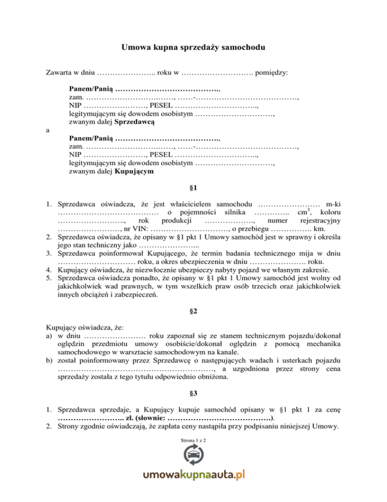 Umowa kupna sprzedaży samochodu Zawarta w dniu ………………….. roku w ………………………. pomiędzy: Panem/Panią …………………………………., zam. ……………………….……, ……-…………………………………, NIP ……………………, PESEL ………………………….., legitymującym się dowodem osobistym …………………………, zwanym dalej Sprzedawcą a Panem/Panią …………………………………., zam. ……………………….……, ……-…………………………………, NIP ……………………, PESEL ………………………….., legitymującym się dowodem osobistym …………………………, zwanym dalej Kupującym §1 1. Sprzedawca oświadcza, że jest właścicielem samochodu …………………… m-ki ………………………………… o pojemności silnika ………….. cm3, koloru …………………….., rok produkcji ………………., numer rejestracyjny ……………………, nr VIN: …………………………, o przebiegu ……………. km. 2. Sprzedawca oświadcza, że opisany w §1 pkt 1 Umowy samochód jest w sprawny i określa jego stan techniczny jako …………………... 3. Sprzedawca poinformował Kupującego, że termin badania technicznego mija w dniu ………………………… roku, a okres ubezpieczenia w dniu …………………. roku. 4. Kupujący oświadcza, że niezwłocznie ubezpieczy nabyty pojazd we własnym zakresie. 5. Sprzedawca oświadcza ponadto, że opisany w §1 pkt 1 Umowy samochód jest wolny od jakichkolwiek wad prawnych, w tym wszelkich praw osób trzecich oraz jakichkolwiek innych obciążeń i zabezpieczeń. §2 Kupujący oświadcza, że: a) w dniu …………………… roku zapoznał się ze stanem technicznym pojazdu/dokonał oględzin przedmiotu umowy osobiście/dokonał oględzin z pomocą mechanika samochodowego w warsztacie samochodowym na kanale. b) został poinformowany przez Sprzedawcę o następujących wadach i usterkach pojazdu ……………………………………………………, a uzgodniona przez strony cena sprzedaży została z tego tytułu odpowiednio obniżona. §3 1. Sprzedawca sprzedaje, a Kupujący kupuje samochód opisany w §1 pkt 1 za cenę …………………….. zł. (słownie: ………………………………….). 2. Strony zgodnie oświadczają, że zapłata ceny nastąpiła przy podpisaniu niniejszej Umowy. Strona 1 z 2 3. Sprzedawca poprzez podpisanie niniejszej Umowy kwituje odbiór całości ceny sprzedaży wskazanej w §3 pkt 1 Umowy. 4. Wydanie przedmiotu Umowy następuje przy podpisaniu niniejszej Umowy. 5. Kupujący niniejszym potwierdza i kwituje wydanie mu przedmiotu Umowy. 6. Wraz z wydaniem przedmiotu Umowy Sprzedawca przekazuje Kupującemu wszelkie posiadane przez niego rzeczy służące do korzystania z samochodu, w tym dwa komplety oryginalnych kluczyków do pojazdu. 7. Sprzedawca wydaje także Kupującemu, co Kupujący niniejszym potwierdza, niezbędne dokumenty związane z samochodem, w tym: dowód rejestracyjny nr …………………..; kartę pojazdu nr ……………………………; dowód ubezpieczenia komunikacyjnego w AXA Direct oraz polisę nr …………………………………….. ; dowody uiszczenia rat ………………… ubezpieczenia ……………………..; kserokopie dokumentów związanych z zakupem pojazdu przez Sprzedawcę. §4 1. 2. 3. Wszelkie zmiany niniejszej Umowy wymagają formy pisemnej pod rygorem nieważności. W sprawach nieuregulowanych Umową zastosowanie mają odpowiednie przepisy kodeksu cywilnego. Umowę sporządzono w dwóch jednobrzmiących egzemplarzach po jednym dla każdej ze stron. Kupujący: Sprzedawca: Strona 2 z 2