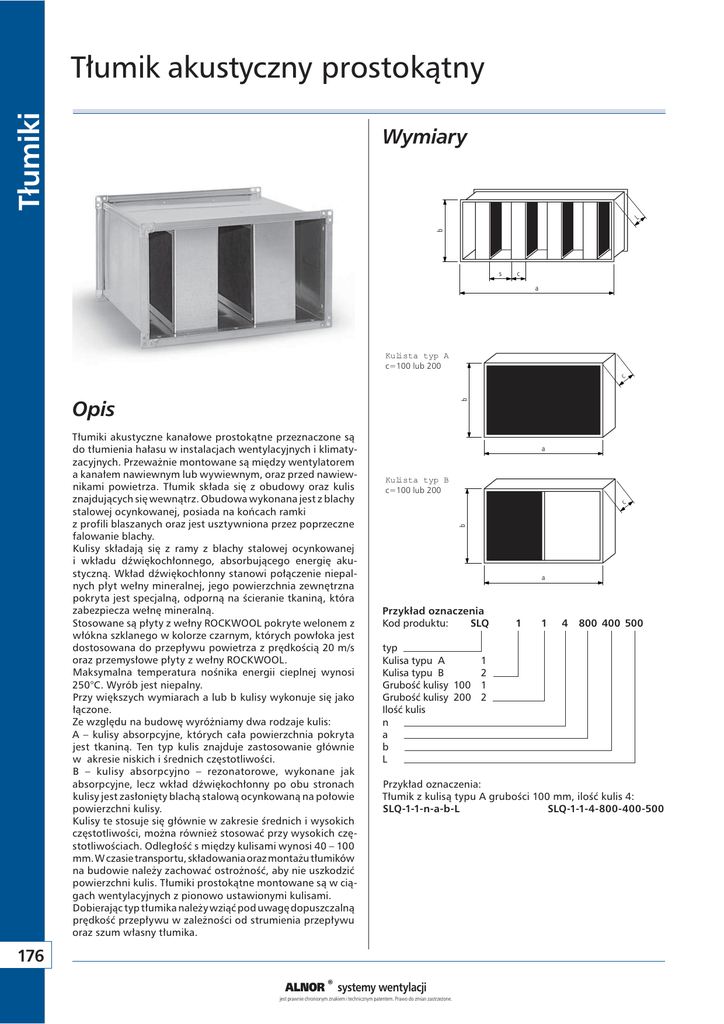 Tłumiki Tłumik akustyczny prostokątny Wymiary b L s c a Kulista typ A c=100 lub 200 b c Opis a Kulista typ B c=100 lub 200 c b Tłumiki akustyczne kanałowe prostokątne przeznaczone są do tłumienia hałasu w instalacjach wentylacyjnych i klimatyzacyjnych. Przeważnie montowane są między wentylatorem a kanałem nawiewnym lub wywiewnym, oraz przed nawiewnikami powietrza. Tłumik składa się z obudowy oraz kulis znajdujących się wewnątrz. Obudowa wykonana jest z blachy stalowej ocynkowanej, posiada na końcach ramki z profili blaszanych oraz jest usztywniona przez poprzeczne falowanie blachy. Kulisy składają się z ramy z blachy stalowej ocynkowanej i wkładu dźwiękochłonnego, absorbującego energię akustyczną. Wkład dźwiękochłonny stanowi połączenie niepalnych płyt wełny mineralnej, jego powierzchnia zewnętrzna pokryta jest specjalną, odporną na ścieranie tkaniną, która zabezpiecza wełnę mineralną. Stosowane są płyty z wełny ROCKWOOL pokryte welonem z włókna szklanego w kolorze czarnym, których powłoka jest dostosowana do przepływu powietrza z prędkością 20 m/s oraz przemysłowe płyty z wełny ROCKWOOL. Maksymalna temperatura nośnika energii cieplnej wynosi 250°C. Wyrób jest niepalny. Przy większych wymiarach a lub b kulisy wykonuje się jako łączone. Ze względu na budowę wyróżniamy dwa rodzaje kulis: A – kulisy absorpcyjne, których cała powierzchnia pokryta jest tkaniną. Ten typ kulis znajduje zastosowanie głównie w akresie niskich i średnich częstotliwości. B – kulisy absorpcyjno – rezonatorowe, wykonane jak absorpcyjne, lecz wkład dźwiękochłonny po obu stronach kulisy jest zasłonięty blachą stalową ocynkowaną na połowie powierzchni kulisy. Kulisy te stosuje się głównie w zakresie średnich i wysokich częstotliwości, można również stosować przy wysokich częstotliwościach. Odległość s między kulisami wynosi 40 – 100 mm. W czasie transportu, składowania oraz montażu tłumików na budowie należy zachować ostrożność, aby nie uszkodzić powierzchni kulis. Tłumiki prostokątne montowane są w ciągach wentylacyjnych z pionowo ustawionymi kulisami. Dobierając typ tłumika należy wziąć pod uwagę dopuszczalną prędkość przepływu w zależności od strumienia przepływu oraz szum własny tłumika. a Przykład oznaczenia Kod produktu: SLQ 1 1 4 800 400 500 typ Kulisa typu A 1 Kulisa typu B 2 Grubość kulisy 100 1 Grubość kulisy 200 2 Ilość kulis n a b L Przykład oznaczenia: Tłumik z kulisą typu A grubości 100 mm, ilość kulis 4: SLQ-1-1-n-a-b-L SLQ-1-1-4-800-400-500 176 ALNOR ® systemy wentylacji jest prawnie chronionym znakiem i technicznym patentem. Prawo do zmian zastrzeżone.