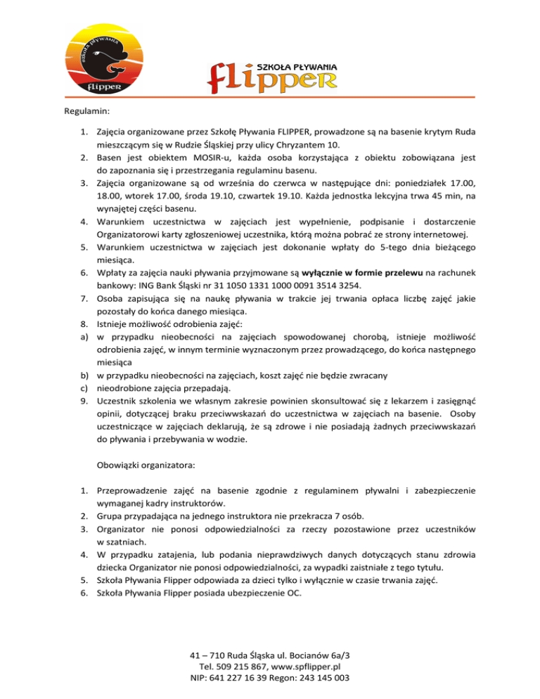Regulamin: 1. Zajęcia organizowane przez Szkołę Pływania FLIPPER, prowadzone są na basenie krytym Ruda mieszczącym się w Rudzie Śląskiej przy ulicy Chryzantem 10. 2. Basen jest obiektem MOSIR-u, każda osoba korzystająca z obiektu zobowiązana jest do zapoznania się i przestrzegania regulaminu basenu. 3. Zajęcia organizowane są od września do czerwca w następujące dni: poniedziałek 17.00, 18.00, wtorek 17.00, środa 19.10, czwartek 19.10. Każda jednostka lekcyjna trwa 45 min, na wynajętej części basenu. 4. Warunkiem uczestnictwa w zajęciach jest wypełnienie, podpisanie i dostarczenie Organizatorowi karty zgłoszeniowej uczestnika, którą można pobrać ze strony internetowej. 5. Warunkiem uczestnictwa w zajęciach jest dokonanie wpłaty do 5-tego dnia bieżącego miesiąca. 6. Wpłaty za zajęcia nauki pływania przyjmowane są wyłącznie w formie przelewu na rachunek bankowy: ING Bank Śląski nr 31 1050 1331 1000 0091 3514 3254. 7. Osoba zapisująca się na naukę pływania w trakcie jej trwania opłaca liczbę zajęć jakie pozostały do końca danego miesiąca. 8. Istnieje możliwość odrobienia zajęć: a) w przypadku nieobecności na zajęciach spowodowanej chorobą, istnieje możliwość odrobienia zajęć, w innym terminie wyznaczonym przez prowadzącego, do końca następnego miesiąca b) w przypadku nieobecności na zajęciach, koszt zajęć nie będzie zwracany c) nieodrobione zajęcia przepadają. 9. Uczestnik szkolenia we własnym zakresie powinien skonsultować się z lekarzem i zasięgnąć opinii, dotyczącej braku przeciwwskazań do uczestnictwa w zajęciach na basenie. Osoby uczestniczące w zajęciach deklarują, że są zdrowe i nie posiadają żadnych przeciwwskazań do pływania i przebywania w wodzie. Obowiązki organizatora: 1. Przeprowadzenie zajęć na basenie zgodnie z regulaminem pływalni i zabezpieczenie wymaganej kadry instruktorów. 2. Grupa przypadająca na jednego instruktora nie przekracza 7 osób. 3. Organizator nie ponosi odpowiedzialności za rzeczy pozostawione przez uczestników w szatniach. 4. W przypadku zatajenia, lub podania nieprawdziwych danych dotyczących stanu zdrowia dziecka Organizator nie ponosi odpowiedzialności, za wypadki zaistniałe z tego tytułu. 5. Szkoła Pływania Flipper odpowiada za dzieci tylko i wyłącznie w czasie trwania zajęć. 6. Szkoła Pływania Flipper posiada ubezpieczenie OC. 41 – 710 Ruda Śląska ul. Bocianów 6a/3 Tel. 509 215 867, www.spflipper.pl NIP: 641 227 16 39 Regon: 243 145 003 Obowiązki uczestników: 1. Uczestnicy muszą posiadać stroje kąpielowe i czepki. 2. Każdy uczestnik przed rozpoczęciem zajęć nauki pływania, ma obowiązek skonsultować się z lekarzem, w sprawie braku przeciwwskazań do uczestnictwa w zajęciach pływania i złożyć na tej podstawie pisemne oświadczenie. 3. Uczestnicy zobowiązani są, do zapoznania się z regulaminem nauki pływania i do jego przestrzegania. 4. Czas wejścia na basen zostaje naliczany od momentu przekroczenia bramki przy kasie, do momentu zwrócenia kluczyka przy wyjściu (5 min przed zajęciami na przygotowanie się do zajęć , 45 min lekcji, 10 min na ubranie się, wysuszenie i wyjście po zajęciach). 5. W przypadku przedłużania pobytu dziecka na basenie po lekcji, klient będzie zmuszony ponieść dodatkowe opłaty według cennika MOSiR-u. 6. Zabronione jest fotografowanie oraz filmowanie zajęć bez zgody prowadzącego. 7. Szkoła Pływania Flipper odpowiada za dzieci tylko i wyłącznie w czasie trwania zajęć. Przed lekcją i po jej zakończeniu za dzieci odpowiadają rodzice (opiekunowie). 8. Obecność rodziców na zajęciach bez zakupu biletu wstępu, tylko i wyłącznie za zgodą pracowników basenu. 41 – 710 Ruda Śląska ul. Bocianów 6a/3 Tel. 509 215 867, www.spflipper.pl NIP: 641 227 16 39 Regon: 243 145 003