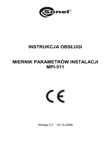 INSTRUKCJA OBSŁUGI MIERNIK PARAMETRÓW INSTALACJI MPI-511 Wersja 2.7 23.10.2009 Cyfrowy miernik MPI-511 przeznaczony jest do pomiarów impedancji pętli zwarcia, rezystancji uziemień, parametrów wyłączników RCD, rezystancji izolacji, niskonapięciowego pomiaru małych rezystancji, a takŜe sprawdzania kolejności faz oraz pomiarów i rejestracji napięć przemiennych i prądu. OSTRZEśENIE: Przyrządu nie wolno stosować do sieci i urządzeń w pomieszczeniach o specjalnych warunkach, np. o atmosferze niebezpiecznej pod względem wybuchowym i poŜarowym. NajwaŜniejsze cechy przyrządu MPI-511: Pomiary parametrów pętli zwarcia: • pomiar impedancji prądem rzędu 23A przy 230V, maksymalnie 44A przy 440V (Rzw = 10Ω) • moŜliwość pomiaru w obwodzie zwarciowym faza-faza, faza-ochronny, faza-neutralny • automatyczne wyliczanie prądu zwarciowego • rozróŜnianie napięcia fazowego i międzyfazowego przy obliczeniach prądu zwarciowego • pomiary w sieciach o napięciach znamionowych: 115V/200V, 127/220V, 220/380V, 230V/400V i 240V/415V o częstotliwościach 45...65Hz (zakres napięć pomiarowych: 100...440V) • wybór napięcia nominalnego 115V/200V, 127/220V, 220/380V, 230V/400V lub 240/415V • pomiar impedancji pętli zwarcia bez wyzwalania wyłącznika RCD z rozdzielczością do 0,01Ω, w instalacjach zabezpieczonych wyłącznikami RCD • pomiar napięć przemiennych • szybkie sprawdzanie poprawności podłączenia przewodu ochronnego PE za pomocą elektrody dotykowej Badanie wyłączników róŜnicowoprądowych typu AC, A i B: • funkcja automatycznego pomiaru zestawu parametrów wyłącznika • kształt przebiegu wymuszanego prądu upływu wybierany przez uŜytkownika: sinusoidalny (start od zbocza narastającego lub opadającego), jednokierunkowy pulsujący (dodatni lub ujemny), jednokierunkowy pulsujący z podkładem prądu stałego (dodatni i ujemny), stały (dodatni i ujemny), • pomiar wyłączników zwykłych i selektywnych o znamionowych prądach róŜnicowych 10, 30, 100, 300, 500 i 1000 mA • pomiar prądu wyzwalania wyłącznika prądem narastającym • pomiar czasu zadziałania wyłącznika, przy prądach 0,5 I∆n, 1I∆n, 2I∆n i 5I∆n • pomiar napięcia dotykowego • pomiar rezystancji uziemienia • moŜliwość pomiaru napięcia dotykowego i rezystancji uziemienia bez wyzwalania wyłącznika • szybkie sprawdzanie poprawności podłączenia przewodu ochronnego PE za pomocą elektrody dotykowej • moŜliwość wyboru progu zadziałania zabezpieczenia przed przekroczeniem napięcia bezpiecznego na poziomach 25 i 50V a dla wyłączników selektywnych dodatkowo 12,5V • moŜliwość jednoczesnego pomiaru IA i tA Pomiar rezystancji izolacji: • trzy napięcia pomiarowe: 250V, 500V i 1000V • pomiar rezystancji izolacji do 3GΩ • samoczynne rozładowywanie pojemności mierzonego obiektu po zakończeniu pomiaru rezystancji izolacji • akustyczne wyznaczanie pięciosekundowych odcinków czasu ułatwiające zdjęcie charakterystyk czasowych przy pomiarze rezystancji izolacji • automatyczny pomiar wszystkich rezystancji w przewodach 3, 4 i 5-Ŝyłowych przy wykorzystaniu specjalnego adaptera 3 Pomiar rezystancji uziemienia: • pomiar z dodatkową elektrodą dołączoną do ziemi odniesienia Niskonapięciowy pomiar rezystancji: • pomiar rezystancji małym prądem z sygnalizacją akustyczną • pomiar ciągłości przewodu ochronnego prądem 200mA w dwóch kierunkach Pomiar i rejestracja napięcia i prądu przemiennego, częstotliwości, mocy czynnej, biernej i pozornej oraz cosφ Sprawdzanie kolejności faz Pozostałe: • automatyczny wybór zakresu pomiarowego • pamięć 10000 pojedynczych wyników pomiaru z moŜliwością ich przesłania do komputera PC przez łącze RS-232C • duŜy, czytelny wyświetlacz graficzny z moŜliwością podświetlenia • monitorowanie stanu naładowania baterii • samoczynne wyłączanie się nieuŜywanego przyrządu (AUTO-OFF) • ergonomiczna obsługa • moŜliwość zasilania z akumulatorów 4 SPIS TREŚCI 1 2 3 4 WSTĘP..........................................................................................................................7 BEZPIECZEŃSTWO ..................................................................................................8 PRZYGOTOWANIE MIERNIKA DO PRACY .......................................................9 KLAWIATURA I WYŚWIETLACZ .......................................................................10 4.1 ROZMIESZCZENIE GNIAZD I KLAWISZY ....................................................................10 4.1.1 Gniazda ..........................................................................................................................10 4.1.2 Klawiatura .....................................................................................................................11 4.2 WYŚWIETLACZ GRAFICZNY (LCD)..........................................................................12 4.2.1 Wyświetlane symbole......................................................................................................12 4.2.2 Organizacja ekranu........................................................................................................13 4.3 BRZĘCZYK ...............................................................................................................15 4.4 PRZEWODY POMIAROWE..........................................................................................16 5 POMIARY ..................................................................................................................17 5.1 WYBÓR NAPIĘCIA NOMINALNEGO SIECI...................................................................17 5.2 ZAPAMIĘTYWANIE WYNIKU OSTATNIEGO POMIARU ................................................17 5.3 POMIAR NAPIĘCIA PRZEMIENNEGO I CZĘSTOTLIWOŚCI ............................................17 5.4 SPRAWDZENIE POPRAWNOŚCI WYKONANIA POŁĄCZEŃ 