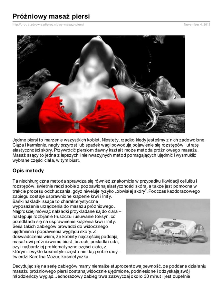 Próżniowy masaż piersi http://urodaiz drowie.pl/proz niowy- masaz - piersi November 4, 2012 Jędrne piersi to marzenie wszystkich kobiet. Niestety, rzadko kiedy jesteśmy z nich zadowolone. Ciąża i karmienie, nagły przyrost lub spadek wagi powodują pojawienie się rozstępów i utratę elastyczności skóry. Przywrócić piersiom dawny kształt może metoda próżniowego masażu. Masaż ssący to jedna z lepszych i nieinwazyjnych metod pomagających ujędrnić i wysmuklić wybrane części ciała, w tym biust. Opis metody Ta niechirurgiczna metoda sprawdza się również znakomicie w przypadku likwidacji cellulitu i rozstępów, świetnie radzi sobie z pozbawioną elastyczności skórą, a także jest pomocna w trakcie procesu odchudzania, gdyż niweluje ryzyko „obwisłej skóry”. Podczas każdorazowego zabiegu zostaje usprawnione krążenie krwi i limfy. Bańki nakładki ssące to charakterystyczne wyposażenie urządzenia do masażu próżniowego. Najprościej mówiąc nakładki przykładane są do ciała – następuje rozbijanie tłuszczu i usuwanie toksyn, co przedkłada się na usprawnienie krążenia krwi i limfy. Seria takich zabiegów prowadzi do widocznego ujędrnienia i poprawienia wyglądu skóry. Z doświadczenia wiem, że kobiety najczęściej poddają masażowi próżniowemu biust, brzuch, pośladki i uda, czyli najbardziej problematyczne części ciała, z którymi zwykłe kosmetyki często nie dają sobie rady – twierdzi Karolina Mazur, kosmetyczka. Decydując się na serię zabiegów mamy niemalże stuprocentową pewność, że poddane działaniu masażu próżniowego piersi zostaną widocznie ujędrnione, podniesione i odzyskają swój młodzieńczy wygląd. Jednorazowy zabieg trwa zazwyczaj około 30 minut i jest zupełnie młodzieńczy wygląd. Jednorazowy zabieg trwa zazwyczaj około 30 minut i jest zupełnie bezbolesny, aczkolwiek dla uzyskania najlepszych efektów należy poddać się całej serii (10-15) zabiegów, a później podtrzymywać ten efekt. Przebieg zabiegu Najlepsze efekty daje seria zabiegów wykonywanych w odstępie 1-2 dni. Długość zabiegu wynosi zazwyczaj około 30-40 minut. Przy zabiegach na biust wykwalifikowana kosmetyczka dobiera odpowiedni rozmiar nakładek i przykłada je do piersi. Urządzenia do masażu próżniowego mają zazwyczaj możliwość regulacji siły ssania, którą także ustala przeszkolona do wykonywania zabiegu osoba (najczęściej kosmetyczka). Jeżeli zabiegowi zostają poddane inne części ciała kosmetyczka przesuwa nakładki zgodnie z przebiegiem mięśni – wówczas otrzymujemy najlepsze rezultaty. Przy „rozbijaniu” cellulitu siła ssąca jest zazwyczaj dosyć wysoka by efektywnie rozbić tłuszcz, wyszczuplić uda i pośladki i pobudzić drenaż limfatyczny. Masaż próżniowy stymuluje głębokie warstwy skóry, przez co pobudza fibroblasty do zwiększonej produkcji elastyny i kolagenu. Proces ten nie tylko powoduje poprawę napięcia skóry, ale także pozwala jej zachować młody wygląd. Z kolei rozbijanie tkanki tłuszczowej powoduje wyrzeźbienie ciała, a w połączeniu z odpowiednią dietą przynosi rewelacyjne efekty odchudzające, które najlepiej widać na brzuchu, pośladkach i udach. Terapia próżniowa pozwala na efektywną walkę z cellulitem, jednakże jej długość uzależniona jest od stopnia zaawansowania „pomarańczowej skórki”. Zalety terapii próżniowej 1. usprawnienie mikrokrążenia, 2. usuwanie nagromadzonych toksyn (detoksykacja), 3. rozbijanie tłuszczu, 4. drenaż limfatyczny (usprawnione krążenie krwi i limfy, eliminacja końcowych produktów przemiany materii), 5. rzeźbienie i modelowanie ciała, 6. przywrócenie jędrności wybranym częściom ciała, 7. podniesienie i poprawa kształtu piersi, 8. pobudzenie fibroblastów do produkcji elastyny i kolagenu. Masaż próżniowy jest uznawany na świecie za jedną z najskuteczniejszych bezinwazyjnych metod likwidacji cellulitu i tkanki tłuszczowej. Masaż jest bardzo przyjemny. Nie trzeba się do niego specjalnie przygotowywać. Należy jednak pamiętać , by przed zabiegiem i po jego zakończeniu wypić ok. 0,5 litra wody, aby pomóc organizmowi za pomocą układu moczowego wydalać złogi niechcianego tłuszczu. W czasie kuracji zalecane jest przestrzeganie zasad zdrowego żywienia, lekka gimnastyka oraz wypijanie dziennie ok. 2 l niegazowanej wody mineralnej dziennie. Przeciwwskazania do zabiegu 1. nadciśnienie, 2. zapalenie żył, 3. nowotwór, 4. ciąża, 5. stany zapalne skóry, 6. mechaniczne uszkodzenia, 7. przepuklina.