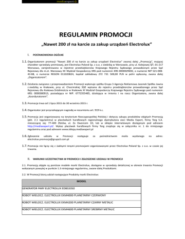 REGULAMIN PROMOCJI „Nawet 200 zł na karcie za zakup urządzeń Electrolux” I. POSTANOWIENIA OGÓLNE 1.1. Organizatorem promocji "Nawet 200 zł na karcie za zakup urządzeń Electrolux" zwanej dalej „Promocją”, mającej charakter sprzedaży premiowej, jest Electrolux Poland Sp. z o.o. z siedzibą w Warszawie, przy ul. Kolejowej 5/7, 01-217 Warszawa, zarejestrowana w rejestrze przedsiębiorców Krajowego Rejestru Sądowego prowadzonym przez Sąd Rejonowy dla m.st. Warszawy XII Wydział Gospodarczy KRS pod numerem KRS 0000029692, o numerze NIP 521-00843-88, o numerze REGON 011020824, kapitał zakładowy 272 731 500,00 PLN w pełni opłacony, zwana dalej „Organizatorem”. 1.2. Działania związane z przeprowadzeniem Promocji wykonuje spółka Grupa 3 Agencja Reklamowa Jasonek Spółka Jawna z siedzibą w Krakowie, przy ul. Chocimskiej 35/2 wpisana do rejestru przedsiębiorców prowadzonego przez Sąd Rejonowy dla Krakowa-Śródmieścia w Krakowie XI Wydział Gospodarczy Krajowego Rejestru Sądowego pod numerem KRS: 0000380913, posiadająca nr NIP: 6772355485, działająca w imieniu i na rzecz Organizatora, zwana dalej „Koordynatorem”. 1.3. Promocja trwa od 1 lipca 2015 do 30 września 2015 r. 1.4. Organizator jest przyrzekającym nagrodę w rozumieniu art. 919 k.c. 1.5. Promocja jest organizowana na terytorium Rzeczypospolitej Polskiej i dotyczy zakupu produktów objętych Promocją (pkt. 2.1 regulaminu) w placówkach handlowych regionalnego dystrybutora sieci Media Expert, firmy Terg S.A. mieszczącej się: 77-400 Złotów, ul. Za Dworcem 1D, lub w sklepie internetowym dostępnym pod adresem http://mediaexpert.pl/. Wykaz placówek handlowych firmy Terg znajduje się w załączniku nr. 1 do niniejszego regulaminu oraz pod adresem www.sklepy.mediaexpert.pl 1.6. Zgłoszenie udziału w Promocji [email protected] następuje za pośrednictwem maila wysłanego na adres: 1.7. Promocja nie łączy się z żadnymi innymi promocjami organizowanymi przez Electrolux Poland Sp. z o.o. w czasie jej trwania. II. WARUNKI UCZESTNICTWA W PROMOCJI I ZGŁOSZENIE UDZIAŁU W PROMOCJI 2.1. Promocją objęte są poniższe modele marki Electrolux, dostępne w sprzedaży detalicznej w okresie trwania Promocji wskazanym powyżej w punkcie 1.3 niniejszego regulaminu, zwane dalej Produktami. 2.2. W Promocji biorą udział następujące Produkty marki Electrolux: MODEL GENERATOR PARY ELECTROLUX EDBS3350 ROBOT WIELOCZ. ELECTROLUX EKM4000 PLANETARNY CZERWONY ROBOT WIELOCZ. ELECTROLUX EKM4200 PLANETARNY CZARNY METALIC ROBOT WIELOCZ. ELECTROLUX EKM4600 PLANETARNY SREBRNY METALIC AKCESORIUM DO ROBOTÓW KITCHEN ASSISTENT™: MASZYNKA DO MIĘSA AKCESORIUM DO ROBOTÓW KITCHEN ASSISTENT™: SZATKOWNICA DO WARZYW AKCESORIUM DO ROBOTÓW KITCHEN ASSISTENT™: PRZYSTAWKA DO SPAGHETTI AKCESORIUM DO ROBOTÓW KITCHEN ASSISTENT™: PRZYSTAWKA DO LASAGNE AKCESORIUM DO ROBOTÓW KITCHEN ASSISTENT™: PRZYSTAWKA DO TAGLIATELLE MIKSER KIELICHOWY ELECTROLUX ESB 2500 GENERATOR PARY ELECTROLUX EDBS7146GR ŻELAZKO EDB6120 ŻELAZKO EDB6146GR 2.3. Promocja jest przeznaczona wyłącznie dla osób fizycznych, które spełniają wszystkie poniższe warunki: a) ukończyły 18 rok życia; b) posiadają miejsce zamieszkania na terytorium Rzeczypospolitej Polskiej; c) posiadają pełną zdolność do czynności prawnych; d) kupią Produkt/Produkty wymieniony w punkcie 2.2 regulaminu, jako konsumenci w rozumieniu art. 221 kodeksu cywilnego (ustawa z dn. 16 kwietnia 1964 r. Kodeks cywilny, Dz.U. Nr 16, poz. 93 z późn. zm.), w terminie trwania promocji, tj. od 6 października 2014 do 30 września 2015 r. e) dokonają zgłoszenia do Promocji Produktu/Produktów zakupionego/zakupionych przez siebie w czasie trwania Promocji, za pośrednictwem wiadomości e-mail wysłanej na adres: [email protected] w ciągu 7 dni od daty zakupu (data z paragonu/faktury) urządzeń objętych promocją, jednak nie później jak do 9 października 2015 roku. Zgłoszenie musi być wysłane w formie wiadomości e-mail do której będzie załączona zeskanowana Faktura VAT lub paragon oraz zeskanowany Formularz Rejestracyjny. Formularz Rejestracyjny, aby być ważnym, musi posiadać odręczny podpis uczestnika promocji, oraz zawierać wypełnione wszystkie obowiązkowe (oznaczone gwiazdką*) dane, czyli: imię, nazwisko, adres zamieszkania lub adres do korespondencji (miejscowość, ulica, numer domu lub lokalu, kod pocztowy), numer telefonu kontaktowego, adres e-mail, numer dowodu zakupu (paragonu/Faktury VAT), symbol (model) zakupionego Produktu/Produktów i numer seryjny urządzenia/urządzeń (umieszczony na tabliczce znamionowej / S. -NO.)*. Z momentem zatwierdzenia formularza rejestracyjnego, osoba spełniająca wszystkie warunki, o których mowa w niniejszym punkcie 2.3., staje się uczestnikiem Promocji (dalej jako: „Uczestnik”). f) Formularz zgłoszeniowy dostępny jest w salonach Media Expert biorących udział w promocji (zał. 1 do regulaminu) oraz pod adresem http://sklep.mediaexpert.pl/. 2.4. Organizator nie ponosi odpowiedzialności za nieprawidłowości przy wysyłaniu zgłoszenia wynikające z przyczyn od niego niezależnych, a zwłaszcza z wadliwego funkcjonowania systemu informatycznego Uczestnika lub dostawcy usługi dostępu do Internetu. 2.5. Zgłoszenia niepełne i nieprawidłowo wypełnione, w świetle regulaminu uznane będą za nieważne. 2.6. Udział w Promocji i podanie związanych z udziałem danych jest całkowicie dobrowolne. Uczestnictwo w Promocji oznacza akceptację postanowień niniejszego Regulaminu. III. NAGRODY W PROMOCJI I ZASADY ICH PRZYZNAWANIA 3.1. Promocja polega na tym, że Uczestnik, który w czasie trwania Promocji kupi Produkt/Produkty marki Electrolux objęty/objęte Promocją (pkt. 2.2.) i dokona prawidłowego zgłoszenia do Promocji, otrzyma nagrodę gwarantowaną: przedpłaconą kartę/karty Media Expert do wykorzystania tylko i wyłącznie w stacjonarnych salonach firmy Terg. S.A. regionalnego dystrybutora si