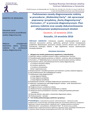 KORZYŚCI ZE SZKOLENIA: Poznanie zasad konstruowania prawidłowej analizy diagnostycznej Podstawowe zasady diagnozowania rodziny w procedurze „Niebieskiej Karty”. Jak opracować poprawną i przydatną „Kartę diagnostyczną”. Formularz „C” w procesie diagnostycznym. Plan pomocy rodzinie oraz zasady dokumentowania efektywności podejmowanych działań Szczecin, 13 września 2016 Koszalin, 14 września 2016 Adresaci szkolenia: Nabycie umiejętności tworzenia planu pomocy rodzinie na podstawie analizy diagnostycznej Członkowie zespołów interdyscyplinarnych i grup roboczych (pracownicy pomocy społecznej, gminnych komisji rozwiązywania problemów alkoholowych, pracownicy oświaty, ochrony zdrowia oraz inni lokalni animatorzy) realizujący zadania z tego zagadnienia; wszyscy zainteresowani tematyką szkolenia. PROGRAM SZKOLENIA: I. Wstępny test wiedzy podstawowej zagadnienia ( indywidualny). 1/ Definicje rodziny w polskim prawie w ujęciu cywilistycznym i karnym. 2/ Charakterystyka zjawiska przemocy w rodzinie – przemoc, jako przestępstwo. 3/ Formularz „C” Niebieskiej Karty w procesie tworzenia planu pomocy rodzinie. 4/ Poznawanie rodziny, jak podstawowa forma analizy diagnostycznej : a/ struktura formalna rodziny; b/ struktura społeczna; c/ struktura emocjonalna; d/styl i organizacja życia. 5/ Rozpoznawanie i charakteryzowanie cech istotnych z punktu widzenia diagnozy. 6/ Pięć podstawowych sfer podlegających analizie. 7/ Podstawowe etapy diagnostyczne : a/ etap diagnozy faktów; b/ etap diagnozy projektów; c/ etap diagnozy weryfikacji; 8/ Podstawowe techniki i narzędzia diagnostyczne stosowane w praktyce. 9/ Zdolności i kompetencje osób diagnozujących rodzinę – wiek, doświadczenie i przygotowanie zawodowe. 10/ Diagnoza kryzysu ( problemu) rodziny. 11/ Wybrane formy rozwiązywania problemów w rodzinie. 12/ Skuteczne formy prowadzenia rozmowy z osobą pokrzywdzoną (dorosłą i dzieckiem ). 13/ Rysunek dziecka, jako jeden z elementów diagnostyki rodziny. 14/ Podsumowanie – wnioski. II. Test wiedzy podsumowujący spotkanie ( grupowy ). Prowadzący: Z wykształcenia prawnik i administratywista – ukończone studia podyplomowe z Prawa Karnego, psychologii społecznej, komunikacji społecznej, zarządzania i organizacji, Członek stowarzyszenia „Niebieska Linia”, współpracował przy tworzeniu „Niebieskiej Karty”, pomysłodawca „Niebieskich Pokoi”. W ramach pracy w policji współpracował z instytucjami pomocy społecznej. Aktualnie trener, posiadający doświadczenie w realizacji szkoleń dla grup interdyscyplinarnych (OPS, PUP, PCPR, NGO). Miejsce: Szczecin, ul. Kolumba 86 Koszalin, Środkowopomorska rada NOT-u ul. Jana z Kolna 38 Czas trwania: godz. 9.00-14.00 Cena: 320 zł netto/os. przy zgłoszeniu do 30 sierpnia 350 zł netto/os przy zgłoszeniu po 30 sierpnia Zwolnione z VAT w przypadku szkoleń podnoszących kwalifikacje pracowników JST oraz ich jednostek organizacyjnych oraz finansowania szkolenia w co najmniej 70% ze środków publicznych. W cenie: materiały szkoleniowe, zaświadczenie o ukończeniu szkolenia, lunch i serwis kawowy. RABAT 10% dla każdej kolejnej osoby zgłoszonej z tej samej instytucji Zgłoszenia: należy dokonywać najpóźniej do dnia 6 września 2016r. drogą elektroniczną poprzez stronę www.frdl.szczecin.pl, faksem 91 4878522