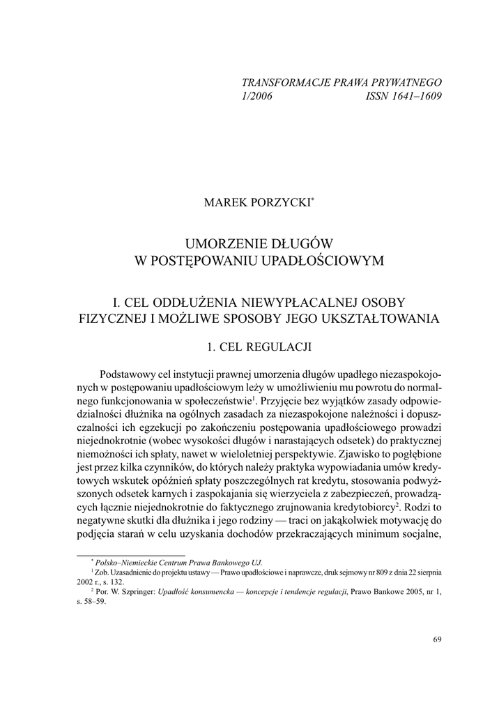 TRANSFORMACJE PRAWA PRYWATNEGO 1/2006 ISSN 16411609 MAREK PORZYCKI* UMORZENIE D£UGÓW W POSTÊPOWANIU UPAD£OCIOWYM I. CEL ODD£U¯ENIA NIEWYP£ACALNEJ OSOBY FIZYCZNEJ I MO¯LIWE SPOSOBY JEGO UKSZTA£TOWANIA 1. CEL REGULACJI Podstawowy cel instytucji prawnej umorzenia d³ugów upad³ego niezaspokojonych w postêpowaniu upad³ociowym le¿y w umo¿liwieniu mu powrotu do normalnego funkcjonowania w spo³eczeñstwie1. Przyjêcie bez wyj¹tków zasady odpowiedzialnoci d³u¿nika na ogólnych zasadach za niezaspokojone nale¿noci i dopuszczalnoci ich egzekucji po zakoñczeniu postêpowania upad³ociowego prowadzi niejednokrotnie (wobec wysokoci d³ugów i narastaj¹cych odsetek) do praktycznej niemo¿noci ich sp³aty, nawet w wieloletniej perspektywie. Zjawisko to pog³êbione jest przez kilka czynników, do których nale¿y praktyka wypowiadania umów kredytowych wskutek opónieñ sp³aty poszczególnych rat kredytu, stosowania podwy¿szonych odsetek karnych i zaspokajania siê wierzyciela z zabezpieczeñ, prowadz¹cych ³¹cznie niejednokrotnie do faktycznego zrujnowania kredytobiorcy2. Rodzi to negatywne skutki dla d³u¿nika i jego rodziny traci on jak¹kolwiek motywacjê do podjêcia starañ w celu uzyskania dochodów przekraczaj¹cych minimum socjalne, * PolskoNiemieckie Centrum Prawa Bankowego UJ. Zob. Uzasadnienie do projektu ustawy Prawo upad³ociowe i naprawcze, druk sejmowy nr 809 z dnia 22 sierpnia 2002 r., s. 132. 2 Por. W. Szpringer: Upad³oæ konsumencka koncepcje i tendencje regulacji, Prawo Bankowe 2005, nr 1, s. 5859. 1 69 Transformacje Prawa Prywatnego 1/2006 skoro i tak ca³y jego maj¹tek przekraczaj¹cy próg zwolnienia od egzekucji przez wiele lat, a mo¿e i przez ca³e ¿ycie bêdzie przeznaczany na zaspokojenie wierzycieli. Jedyn¹ szans¹ akumulacji rodków przekraczaj¹cych to minimum staje siê dla niego ich ukrycie przed wierzycielami, co mo¿liwe jest przy podjêciu pracy na czarno, dzia³alnoci w szarej strefie czy wrêcz dzia³alnoci przestêpczej3. Pozbawienie d³u¿nika realnej perspektywy wyjcia z zad³u¿enia jest wiêc istotnym czynnikiem kryminogennym4. Nie do przecenienia jest tak¿e wp³yw pu³apki zad³u¿enia na sytuacjê rodziny upad³ego, pozbawionej szansy na poprawê warunków ¿ycia i (w zale¿noci od rodowiska) poddawanej niekiedy ostracyzmowi. Szkodliwoæ tej sytuacji pog³êbia okolicznoæ, ¿e w pu³apkê zad³u¿enia wpadaj¹ czêsto m³odzi, niedowiadczeni ludzie, maj¹cy na utrzymaniu ma³e dzieci5. Bezradnoæ, nieumiejêtnoæ funkcjonowania w spo³eczeñstwie mog¹ one w wielu przypadkach odziedziczyæ po rodzicach. Wreszcie, trwa³e wykluczenie niewyp³acalnych d³u¿ników z normalnego obrotu gospodarczego ma negatywne skutki dla ca³oci gospodarki, eliminuj¹c ich chocia¿by z rynku jako potencjalnych konsumentów. Ograniczenie powy¿szych negatywnych (a czasem i tragicznych) zjawisk mo¿e nast¹piæ dziêki umo¿liwieniu d³u¿nikowi rozpoczêcia pracy na nowo, bez ciê¿aru zad³u¿enia (w USA u¿ywa siê w tym kontekcie obrazowego okrelenia fresh start, czyli nowego pocz¹tku 6). Trzeba przy tym podkreliæ, ¿e negatywne skutki zad³u¿enia wystêpuj¹ zarówno w wypadku osób fizycznych bêd¹cych przedsiêbiorcami, jak te¿ osób nieprowadz¹cych dzia³alnoci gospodarczej (które wed³ug prawa polskiego nie maj¹ zdolnoci upad³ociowej). W tej drugiej grupie skalê problemu zwiêkszaj¹ ci¹gle rosn¹ce rozmiary kredytowania przez banki wydatków na konsumpcjê. Dlatego w wiêkszoci porz¹dków prawnych przewiduj¹cych instytucjê odd³u¿enia osób fizycznych wprowadzono tak¹ mo¿liwoæ tak¿e dla osób niebêd¹cych przedsiêbiorcami, przyznaj¹c im zdolnoæ upad³ociow¹, czy te¿ wprowadzaj¹c szczególne postêpowanie odd³u¿eniowe dla konsumentów. Ubocznym skutkiem instytucji odd³u¿enia (zw³aszcza jej zastosowania do konsumentów) jest zmuszenie banków do ostro¿niejszej polityki kredytowej, w szczególnoci staranniejszego badania zdolnoci kredytowej kredytobiorców. 3 Por. F. Zedler (w:) A. Jakubecki, F. Zedler: Prawo upad³ociowe i naprawcze. Komentarz, Zakamycze 2003, s. 941 (teza 1 do art. 369). 4 Por. uzasadnienie nieuchwalonego projektu ustawy o przeciwdzia³aniu niewyp³acalnoci osoby fizycznej oraz upad³oci konsumenckiej z dnia 22 grudnia 2003 r., druk sejmowy nr 2668. 5 Do takiego wniosku doprowadzi³y badania przeprowadzone w Niemczech; por. H. Vallender (w:) W. Uhlenbruck (red.): Insolvenzordnung. Kommentar, München 2003, s. 2767 (nb 11 w uwagach poprzedzaj¹cych § 286). Mo¿na przypuszczaæ, ¿e sytuacja w Polsce nie odbiega znacz¹co od tego obrazu, a z biegiem lat bêdzie siê do niego jeszcze bardziej zbli¿aæ. 6 O zwi¹zanych z tym ogólnych za³o¿eniach amerykañskiego prawa upad³ociowego zob. B.E. Blum: Bankruptcy and Debtor/Creditor, 2 wyd., New York 1999, s. 9798. 70 Marek Porzycki: Umorzenie d³ugów w postêpowaniu upad³ociowym 2. MO¯LIWE SPOSOBY UKSZTA£TOWANIA ZWOLNIENIA Z RESZTY D£UGÓW Przed omówieniem polskiej regulacji umorzenia zobowi¹zañ upad³ego warto pokrótce przyjrzeæ siê podstawowym zasadom analogicznych regulacji w niektórych obcych porz¹dkach prawnych. Podkreliæ nale¿y ró¿norodnoæ stosowanych rozwi¹zañ, co pozostawia szerokie pole dla porównywania zalet i wad ich poszczególnych elementów. W USA odd³u¿enie (discharge) upad³ego i umo¿liwienie mu podjêcia na nowo funkcjonowania w gospodarce sta³o siê w praktyce g³ówn¹ funkcj¹ postêpowania upad³ociowego7. Zwolnienie upad³ego z reszty d³ugów mo¿liwe jest w postêpowaniach przewidzianych w rozdziale 7 (klasyczna upad³oæ likwidacyjna) oraz rozdzia³ach 11, 12 i 13 (ró¿ne formy postêpowañ sanacyjnych) Bankruptcy Code8. Co do zasady mo¿liwe jest odd³u¿enie wy³¹cznie osób fizycznych (wyj¹tkiem jest rozdzia³ 11 dopuszczaj¹cy równie¿ odd³u¿enie osób prawnych w procedurze przypominaj¹cej uk³ad). Szczegó³y procedury ró¿ni¹ siê w zale¿noci od rozdzia³u Bankruptcy Code. Cech