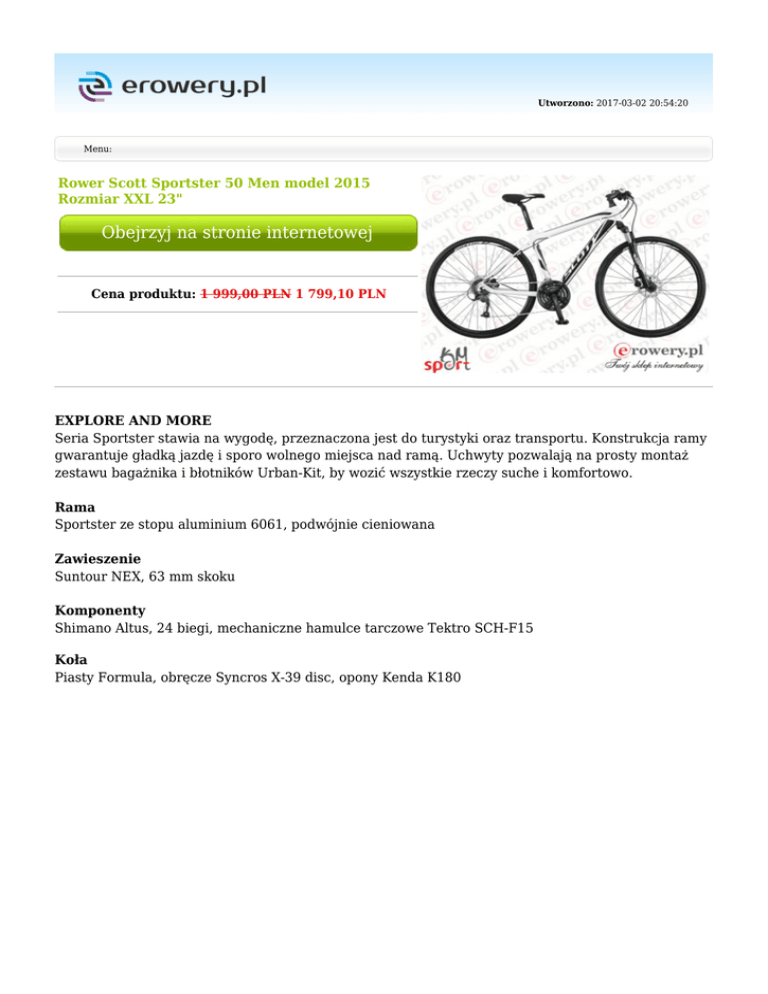 Utworzono: 2017-03-02 20:54:20 Menu: Rower Scott Sportster 50 Men model 2015 Rozmiar XXL 23" Obejrzyj na stronie internetowej Cena produktu: 1 999,00 PLN 1 799,10 PLN EXPLORE AND MORE Seria Sportster stawia na wygodę, przeznaczona jest do turystyki oraz transportu. Konstrukcja ramy gwarantuje gładką jazdę i sporo wolnego miejsca nad ramą. Uchwyty pozwalają na prosty montaż zestawu bagażnika i błotników Urban-Kit, by wozić wszystkie rzeczy suche i komfortowo. Rama Sportster ze stopu aluminium 6061, podwójnie cieniowana Zawieszenie Suntour NEX, 63 mm skoku Komponenty Shimano Altus, 24 biegi, mechaniczne hamulce tarczowe Tektro SCH-F15 Koła Piasty Formula, obręcze Syncros X-39 disc, opony Kenda K180 Rozmiary ram Klamki hamulców Hamulce Mechanizm korbowy Oś korbowodu Prowadzenie łańcucha Kierownica Mostek/ Wspornik kierownicy Tektro SCH-F15 Tektro SCH-F15 Hydr. Disc 160F/160Rmm Rotor Shimano FC-M171 48x38x28 w/CG Chian-Haur CH-52 - B Syncros UC3.0 Tbar 620mm, 9° bend Solution: 620mm, 15° bend Syncros UC3.0 31.8mm Pedały Wellgo M-141SDU Sztyca Syncros UC3.0 31.6mm Siodło Sportster Men EVO / Lady EVO Przeznaczenie Męski Piasta przód Formula DC-19FQR disc Piasta tył Formula DC-25RQR disc Łańcuch KMC X8 Kaseta/ wolnobieg Shimano CS-HG31-8 11-32 T Szprychy Stainless black, 14G / 2mm Obręcze Syncros X-39 Disc 32H, black Opony Wyposażenie dodatkowe Typ roweru Waga Kenda K180 700 × 38C / 30 TPI Crossowy 13,9kg Tylny amortyzator /Damper Rozmiar kół Sezon Rodzina 28" 2015 - Rama Sportster Alloy 6061 / Sportster Men/Lady geometry / External cable routing / SCOTT urban kit ready Widelec/amortyzator Suntour NEX Susp.fork 1 1/8" / 63mm travel Stery Przerzutka przód Ritchey OE Logic Zero, semi integ. Shimano FD-M191 / 34.9mm Przerzutka tył Shimano Altus RD-M370 24 Speed Manetki Shimano SL-M310-8R R-fire plus Mimo dołożenia wszelkich starań nie gwarantujemy, że publikowane opisy i specyfikacje techniczne niezawierają uchybień lub błędów, które nie mogą jednak być podstawą do roszczeń. W przypadku jakichkolwiek wątpliwości, przed podjęciem decyzji prosimy o kontakt. Adres: www.erowery.pl Telefon: 605 515 185, 34 361 16 71 Email: [email protected]