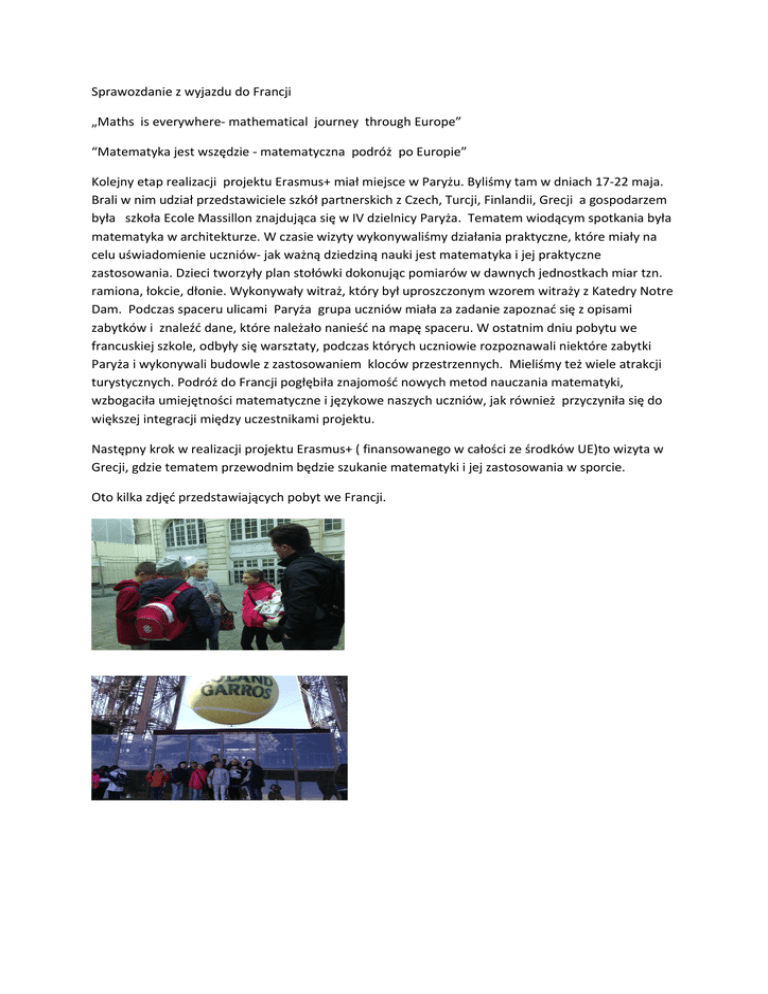 Sprawozdanie z wyjazdu do Francji „Maths is everywhere- mathematical journey through Europe” “Matematyka jest wszędzie - matematyczna podróż po Europie” Kolejny etap realizacji projektu Erasmus+ miał miejsce w Paryżu. Byliśmy tam w dniach 17-22 maja. Brali w nim udział przedstawiciele szkół partnerskich z Czech, Turcji, Finlandii, Grecji a gospodarzem była szkoła Ecole Massillon znajdująca się w IV dzielnicy Paryża. Tematem wiodącym spotkania była matematyka w architekturze. W czasie wizyty wykonywaliśmy działania praktyczne, które miały na celu uświadomienie uczniów- jak ważną dziedziną nauki jest matematyka i jej praktyczne zastosowania. Dzieci tworzyły plan stołówki dokonując pomiarów w dawnych jednostkach miar tzn. ramiona, łokcie, dłonie. Wykonywały witraż, który był uproszczonym wzorem witraży z Katedry Notre Dam. Podczas spaceru ulicami Paryża grupa uczniów miała za zadanie zapoznać się z opisami zabytków i znaleźć dane, które należało nanieść na mapę spaceru. W ostatnim dniu pobytu we francuskiej szkole, odbyły się warsztaty, podczas których uczniowie rozpoznawali niektóre zabytki Paryża i wykonywali budowle z zastosowaniem kloców przestrzennych. Mieliśmy też wiele atrakcji turystycznych. Podróż do Francji pogłębiła znajomość nowych metod nauczania matematyki, wzbogaciła umiejętności matematyczne i językowe naszych uczniów, jak również przyczyniła się do większej integracji między uczestnikami projektu. Następny krok w realizacji projektu Erasmus+ ( finansowanego w całości ze środków UE)to wizyta w Grecji, gdzie tematem przewodnim będzie szukanie matematyki i jej zastosowania w sporcie. Oto kilka zdjęć przedstawiających pobyt we Francji.
