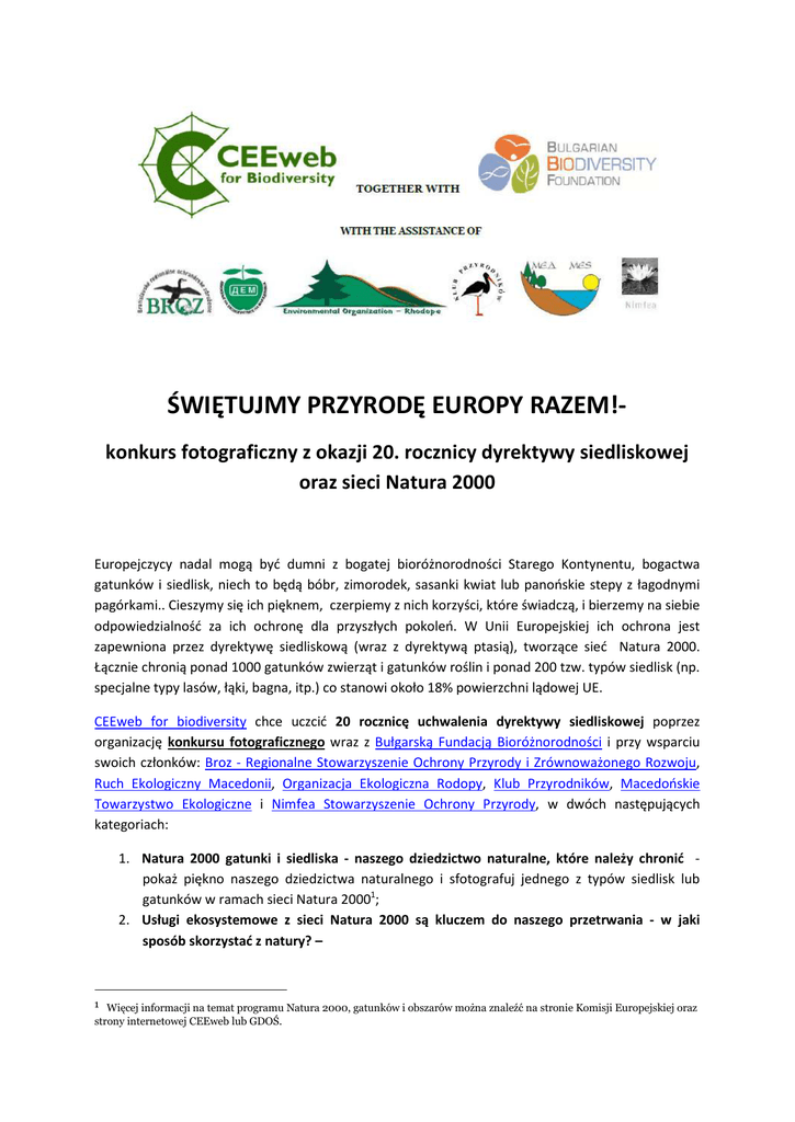 ŚWIĘTUJMY PRZYRODĘ EUROPY RAZEM!konkurs fotograficzny z okazji 20. rocznicy dyrektywy siedliskowej oraz sieci Natura 2000 Europejczycy nadal mogą być dumni z bogatej bioróżnorodności Starego Kontynentu, bogactwa gatunków i siedlisk, niech to będą bóbr, zimorodek, sasanki kwiat lub panońskie stepy z łagodnymi pagórkami.. Cieszymy się ich pięknem, czerpiemy z nich korzyści, które świadczą, i bierzemy na siebie odpowiedzialność za ich ochronę dla przyszłych pokoleń. W Unii Europejskiej ich ochrona jest zapewniona przez dyrektywę siedliskową (wraz z dyrektywą ptasią), tworzące sieć Natura 2000. Łącznie chronią ponad 1000 gatunków zwierząt i gatunków roślin i ponad 200 tzw. typów siedlisk (np. specjalne typy lasów, łąki, bagna, itp.) co stanowi około 18% powierzchni lądowej UE. CEEweb for biodiversity chce uczcić 20 rocznicę uchwalenia dyrektywy siedliskowej poprzez organizację konkursu fotograficznego wraz z Bułgarską Fundacją Bioróżnorodności i przy wsparciu swoich członków: Broz - Regionalne Stowarzyszenie Ochrony Przyrody i Zrównoważonego Rozwoju, Ruch Ekologiczny Macedonii, Organizacja Ekologiczna Rodopy, Klub Przyrodników, Macedońskie Towarzystwo Ekologiczne i Nimfea Stowarzyszenie Ochrony Przyrody, w dwóch następujących kategoriach: 1. Natura 2000 gatunki i siedliska - naszego dziedzictwo naturalne, które należy chronić pokaż piękno naszego dziedzictwa naturalnego i sfotografuj jednego z typów siedlisk lub gatunków w ramach sieci Natura 20001; 2. Usługi ekosystemowe z sieci Natura 2000 są kluczem do naszego przetrwania - w jaki sposób skorzystać z natury? – 1 Więcej informacji na temat programu Natura 2000, gatunków i obszarów można znaleźć na stronie Komisji Europejskiej oraz strony internetowej CEEweb lub GDOŚ. Sieć Natura 2000 zapewnia kilka korzyści dla ludzi z rekreacji poprzez produkty rolnych do ochrony przed katastrofami naturalnymi.2 Jeśli jesteś przyjacielem przyrody, turystą, foto-maniakiem lub po prostu kimś, kto cieszy się z korzyści jakie daje mu dzika przyroda, odkurz aparat, wyjdź zrób kilka ciekawych zdjęć związanych z siecią Natura 20003. Otrzymane i wybrane zdjęcia zostaną pokazane w trakcie II. Międzynarodowego Festiwalu Filmów Krótkometrażowych Green – go w kinie w Budapeszcie i zostaną przesłane do internetowej galerii CEEweb. NAGRODY: Pierwsze miejsce w kategorii: Natura 2000 gatunki i siedliska - naszego dziedzictwo naturalne, które należy chronić Trzy pełne dni pobytu w zapierających dech w piersiach bułgarskich Rodopach Zachodnich (chronione w sieci Natura 2000 Trigrad-Mursalitza i Rodopi-Západní) z lokalnym przewodnikiem - fotografem. Na zboczach malowniczych stoków górskich można znaleźć doskonałe możliwości do robienia zdjęć wielu dzikich zwierząt i gatunków roślin, takich jak kozica bałkańska, niedźwiedź brunatny, głuszec, pomurnik i dzięcioł trójpalczasty, niepylak apollo, orchidee i inne wspaniałe gatunki. Więcej informacji na temat tych obszarów Natura 2000 i możliwości dla turystyki przyrody i fotografii można znaleźć tutaj - http://www.bbf.biodiversity.org4 Pierwsze miejsce w kategorii: Usługi ekosystemowe z sieci Natura 2000 są kluczem do naszego przetrwania - w jaki sposób skorzystać z natury? Jeden dzień w Parku Narodowym Hortobágy i Ptasim Parku (umieszczone na liście Światowego Dziedzictwa UNESCO) z bardzo doświadczonym przewodnikiem lokalnym do odkrywania urokliwych "puszty" i inne wspaniałe cechy które park może zaoferować. Zapewni to niepowtarzalną okazję do fotografii pędów wielu endemicznych i wędrownych gatunków ptaków, w tym żurawie, dropy, ptaki drapieżne, ale także susły i łasice, gronostaje i zwierzęta domowe. Ten dzień będzie niezapomnianym dla każdego fotografa przyrody! 5 2 Więcej na temat usług ekosystemów na stronie http://www.ceeweb.org/wpcontent/uploads/2011/12/N2000_ES_eng. 3 Możesz sprawdzić mapę obszarów Natura 2000 na stronie: http://natura2000.eea.europa.eu/ 4 Proszę pamiętać, że organizatorzy pokrywają zakwaterowanie i wyżywienie (cztery noce) przewodnika i lokalny transport w obrębie kraju. Organizatorzy nie mogą zagwarantować zobaczenia na wszystkich wyżej wymienionych gatunków, w dużej mierze zależy to od pory dnia i pory roku. Podróż do i z Bułgarii z zza granicy oraz dodatkowe koszty (w tym podatki, ubezpieczenia i innych kosztów) są wyłączną odpowiedzialność wnioskodawcy. Organizatorzy nie biorą żadnej odpowiedzialności za szkody osobowe i materialne lub straty. 5 Proszę pamiętać, że organizatorzy pokrywają koszty podróży i zakwaterowania tylko na Węgrzech, dlatego koszty podróży z i do Węgier są wyłączną odpowiedzialność wnioskodawców. Organizatorzy nie mogą zagwarantować zobacznia wszystkich wymienionych powyżej gatunków w dużej mierze zależy to od pory dnia i pory roku. Koszty w Węgrzech, w tym jedna noc na wsi i wyżywienie, jak również krajowe koszty podróży Nagrody publiczności w obu kategoriach: Albumy z fotografią przyrodniczą. ZGŁOSZENIA DO KONKURSU: Termin wysłania zdjęć: 15 listopada 2012 Adres do wysyłki: [email protected] Zdjęcia będą przyjmowane wyłącznie za pośrednictwem poczty elektronicznej w formie elektronicznej (jpg). Jeden wniosek – mail (ze wszystkimi zdjęciami wnioskodawcy) nie może przekroczyć ogólnej wielkości 15 MB. Maksymalna ilość zdjęć możliwych do zgłoszenia w obu kategoriach wynosi 5. Nazwa pliku musi zawierać imię i nazwisko i tytuł obrazu, np.: imie_nazwisko_tytul.jpg email musi również zawierać: • lokalizację (nazwa obszaru Natura 2000), gdzie zdjęcie zostało zrobione lub • nazwę (angielską i / lub łacińską) gatunków naturowych na zdjęciu • jeśli masz historię związaną ze zdjęciem opisz ją w maksymalnie 3 zdaniach. warunki techniczne: Typ pliku: JPG (kompresja nie może przekroczyć Adobe Photoshop J