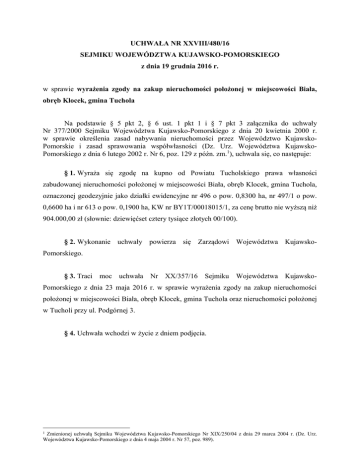 UCHWAŁA NR XXVIII/480/16 SEJMIKU WOJEWÓDZTWA KUJAWSKO-POMORSKIEGO z dnia 19 grudnia 2016 r. w sprawie wyrażenia zgody na zakup nieruchomości położonej w miejscowości Biała, obręb Klocek, gmina Tuchola Na podstawie § 5 pkt 2, § 6 ust. 1 pkt 1 i § 7 pkt 3 załącznika do uchwały Nr 377/2000 Sejmiku Województwa Kujawsko-Pomorskiego z dnia 20 kwietnia 2000 r. w sprawie określenia zasad nabywania nieruchomości przez Województwo KujawskoPomorskie i zasad sprawowania współwłasności (Dz. Urz. Województwa KujawskoPomorskiego z dnia 6 lutego 2002 r. Nr 6, poz. 129 z późn. zm.1), uchwala się, co następuje: § 1. Wyraża się zgodę na kupno od Powiatu Tucholskiego prawa własności zabudowanej nieruchomości położonej w miejscowości Biała, obręb Klocek, gmina Tuchola, oznaczonej geodezyjnie jako działki ewidencyjne nr 496 o pow. 0,8300 ha, nr 497/1 o pow. 0,6600 ha i nr 613 o pow. 0,1900 ha, KW nr BY1T/00018015/1, za cenę brutto nie wyższą niż 904.000,00 zł (słownie: dziewięćset cztery tysiące złotych 00/100). § 2. Wykonanie uchwały powierza się Zarządowi Województwa KujawskoPomorskiego. § 3. Traci moc uchwała Nr XX/357/16 Sejmiku Województwa KujawskoPomorskiego z dnia 23 maja 2016 r. w sprawie wyrażenia zgody na zakup nieruchomości położonej w miejscowości Biała, obręb Klocek, gmina Tuchola oraz nieruchomości położonej w Tucholi przy ul. Podgórnej 3. § 4. Uchwała wchodzi w życie z dniem podjęcia. Zmienionej uchwałą Sejmiku Województwa Kujawsko-Pomorskiego Nr XIX/250/04 z dnia 29 marca 2004 r. (Dz. Urz. Województwa Kujawsko-Pomorskiego z dnia 4 maja 2004 r. Nr 57, poz. 989). 1 UZASADNIENIE 1. Przedmiot regulacji: Projekt uchwały dotyczy wyrażenia zgody na kupno od Powiatu Tucholskiego prawa własności zabudowanej nieruchomości położonej w miejscowości Biała, obręb Klocek, gmina Tuchola, oznaczonej geodezyjnie jako działki ewidencyjne nr 496 o pow. 0,8300 ha, nr 497/1 o pow. 0,6600 ha i nr 613 o pow. 0,1900 ha, KW nr BY1T/00018015/1 za cenę brutto nie wyższą niż 904.000,00 zł. 2. Omówienie podstawy prawnej: Stosownie do postanowień § 5 pkt 2, § 6 ust. 1 pkt 1 i § 7 pkt 3 załącznika do uchwały Nr 377/2000 Sejmiku Województwa Kujawsko-Pomorskiego z dnia 20 kwietnia 2000 r. w sprawie określenia zasad nabywania nieruchomości przez Województwo KujawskoPomorskie i zasad sprawowania współwłasności (Dz. Urz. Województwa KujawskoPomorskiego z dnia 6 lutego 2002 r. Nr 6, poz. 129 z późn. zm.), Zarząd Województwa Kujawsko-Pomorskiego może nabywać do wojewódzkiego zasobu nieruchomości stanowiące własność osób fizycznych i prawnych oraz przysługujące tym osobom prawo użytkowania wieczystego, uwzględniając potrzeby rozwoju regionu kujawsko- pomorskiego oraz obowiązek wykonywania zadań publicznych powierzonych do realizacji samorządowi województwa. Odpłatne nabycie prawa własności lub prawa użytkowania wieczystego nieruchomości, której cena przekracza równowartość 100.000,00 EURO wymaga zgody Sejmiku Województwa. 3. Konsultacje wymagane przepisami prawa (łącznie z przepisami wewnętrznymi): Nie dotyczy. 4. Uzasadnienie merytoryczne: Powiat Tucholski jest właścicielem nieruchomości położonej w miejscowości Biała, obręb Klocek, gmina Tuchola, oznaczonej geodezyjnie jako działki ewidencyjne nr 496 o pow. 0,8300 ha, nr 497/1 o pow. 0,6600 ha i nr 613 o pow. 0,1900 ha, KW nr BY1T/00018015/1. Na nieruchomości posadowione są: dwukondygnacyjny podpiwniczony budynek starej szkoły (rok budowy 1899) o powierzchni całkowitej 170,00 m2, jednokondygnacyjny niepodpiwniczony budynek kuchni ze stołówką (rok budowy 1980) o powierzchni całkowitej 297,03 m2, jednokondygnacyjny niepodpiwniczony budynek główny świetlica (rok budowy 1980) o powierzchni całkowitej 277,34 m2 oraz 28 domków letniskowych o łącznej powierzchni całkowitej 1825,00 m2. Nieruchomość zlokalizowana jest na terenie Tucholskiego Parku Krajobrazowego. Obecnie jest użytkowana przez Kujawsko-Pomorską Chorągiew Związku Harcerstwa Polskiego Hufiec Tuchola na podstawie umowy użyczenia obowiązującej do końca 2022 roku i wykorzystywana na potrzeby prowadzenia harcerskiego Województwa ośrodka prawa szkoleniowo-wychowawczego. własności do niniejszej Uzyskanie nieruchomości przez Samorząd umożliwi jej zagospodarowanie na cele związane z wykonywaniem zadań własnych województwa w zakresie edukacji ekologicznej. W wyniku prowadzonych uzgodnień zarysowała się możliwość nabycia wyżej wymienionej nieruchomości za cenę brutto 904.000,00 zł płatną w trzech ratach, z czego pierwsza w wysokości 304.000,00 zł płatna w 2016 roku, druga wynosząca 300.000,00 zł płatna w 2017 roku oraz trzecia w kwocie 300.000,00 zł płatna w 2018 roku. Zważając na to, że stosownie do obowiązujących przepisów prawa Zarząd Województwa może nabyć nieruchomość, której cena przekracza równowartość 100.000,00 EURO wyłącznie za zgodą Sejmiku Województwa skierowano pod obrady projekt niniejszej uchwały. W związku podjęciem przez Radę Powiatu Tucholskiego uchwały Nr XXII/134/2016 z dnia 26 lipca 2016 r. wyrażającej zgodę na sprzedaż w drodze bezprzetargowej na rzecz Województwa Kujawsko-Pomorskiego tylko nieruchomości położonej w miejscowości Biała, uchwała Nr XX/357/16 Sejmiku Województwa Kujawsko-Pomorskiego z dnia 23 maja 2016 r. o łącznym nabyciu dwóch nieruchomości stała się bezprzedmiotowa. 5. Ocena skutków regulacji: Skutkiem podjęcia uchwały będzie umożliwienie Zarządowi Województwa KujawskoPomorskiego przystąpienia do kolejnych czynności formalno-prawnych mających na celu zakup zabudowanej nieruchomości położonej w miejscowości Biała, obręb Klocek, gmina Tuchola, za cenę brutto nie wyższą niż 904.000,00 zł.