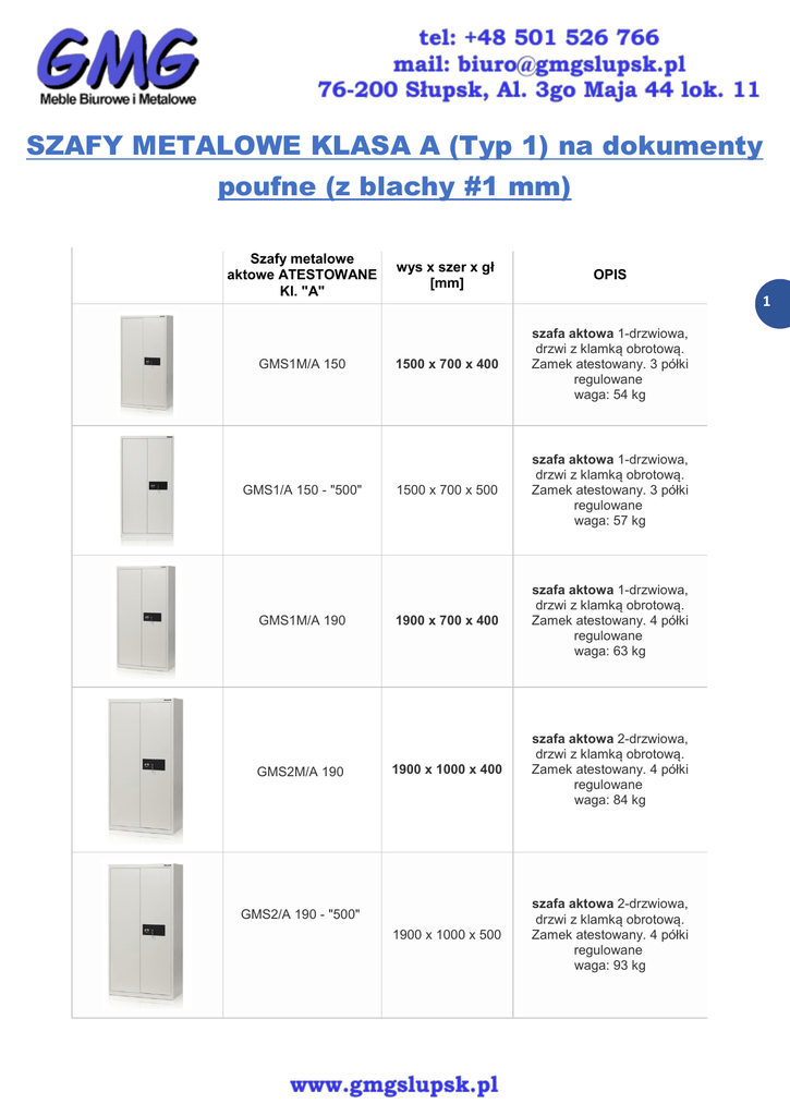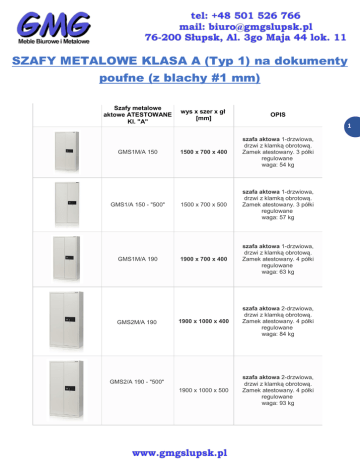 SZAFY METALOWE KLASA A (Typ 1) na dokumenty poufne (z blachy #1 mm) Szafy metalowe aktowe ATESTOWANE Kl. "A" GMS1M/A 150 GMS1/A 150 - "500" GMS1M/A 190 GMS2M/A 190 wys x szer x gł [mm] OPIS 1 1500 x 700 x 400 szafa aktowa 1-drzwiowa, drzwi z klamką obrotową. Zamek atestowany. 3 półki regulowane waga: 54 kg 1500 x 700 x 500 szafa aktowa 1-drzwiowa, drzwi z klamką obrotową. Zamek atestowany. 3 półki regulowane waga: 57 kg 1900 x 700 x 400 szafa aktowa 1-drzwiowa, drzwi z klamką obrotową. Zamek atestowany. 4 półki regulowane waga: 63 kg 1900 x 1000 x 400 szafa aktowa 2-drzwiowa, drzwi z klamką obrotową. Zamek atestowany. 4 półki regulowane waga: 84 kg 1900 x 1000 x 500 szafa aktowa 2-drzwiowa, drzwi z klamką obrotową. Zamek atestowany. 4 półki regulowane waga: 93 kg GMS2/A 190 - "500" Szafy metalowe aktowe ATESTOWANE Kl. "A" GMS2D/A 190 - "500" GMS 2-4/2 wys x szer x gł [mm] OPIS 1900 x 1200 x 500 szafa aktowa 2-drzwiowa, drzwi z klamką obrotową. Zamek atestowany. 4 półki regulowane waga: 118 kg 1900 x 1000 x 400 szafa aktowa 2drzwiowaWZMOCNIONA. Klamka metalowa "wystająca". Zamek atestowany. 4 półki regulowane waga: 88kg WYPOSAŻENIE DODATKOWE (szafy klasy A Typ 1 na dokumenty poufne) Skrytka z zamkiem Euro-Lock (na wysokość segregatora) do GMS1/A (1 drzwiowa) Skrytka z zamkiem kluczowym w klasie A (na wysokość segregatora) do GMS1/A (1 drzwiowa) Skrytka z zamkiem Euro-Lock (na wysokość segregatora) do GMS2/A (2 drzwiowa) Skrytka z zamkiem kluczowym w klasie A (na wysokość segregatora) do GMS2/A (2 drzwiowa) Zamiana zamka kluczowego K w klasie A na zamek szyfrowy mechaniczny w klasie A (atestowany) Zamiana zamka kluczowego K w klasie A na zamek elektroniczny E (m Lock) (atestowany) Dodatkowy zamek kluczowy K w klasie A Dodatkowy zamek szyfrowy mechaniczny S w klasie A Dodatkowy zamek elektroniczny E (m Lock) w klasie B Plombowanie 2