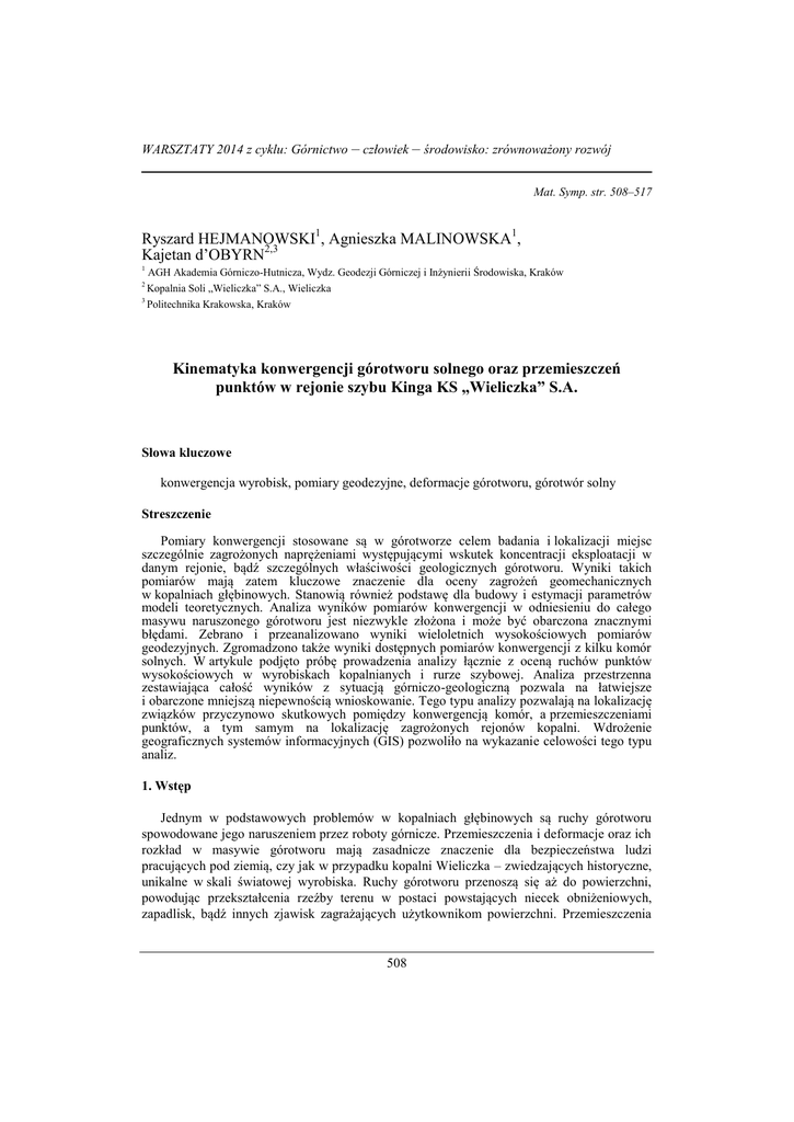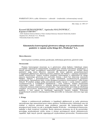 WARSZTATY 2014 z cyklu: Górnictwo – człowiek – środowisko: zrównoważony rozwój Mat. Symp. str. 508–517 Ryszard HEJMANOWSKI1, Agnieszka MALINOWSKA1, Kajetan d’OBYRN2,3 AGH Akademia Górniczo-Hutnicza, Wydz. Geodezji Górniczej i Inżynierii Środowiska, Kraków Kopalnia Soli „Wieliczka” S.A., Wieliczka 3 Politechnika Krakowska, Kraków 1 2 Kinematyka konwergencji górotworu solnego oraz przemieszczeń punktów w rejonie szybu Kinga KS „Wieliczka” S.A. Słowa kluczowe konwergencja wyrobisk, pomiary geodezyjne, deformacje górotworu, górotwór solny Streszczenie Pomiary konwergencji stosowane są w górotworze celem badania i lokalizacji miejsc szczególnie zagrożonych naprężeniami występującymi wskutek koncentracji eksploatacji w danym rejonie, bądź szczególnych właściwości geologicznych górotworu. Wyniki takich pomiarów mają zatem kluczowe znaczenie dla oceny zagrożeń geomechanicznych w kopalniach głębinowych. Stanowią również podstawę dla budowy i estymacji parametrów modeli teoretycznych. Analiza wyników pomiarów konwergencji w odniesieniu do całego masywu naruszonego górotworu jest niezwykle złożona i może być obarczona znacznymi błędami. Zebrano i przeanalizowano wyniki wieloletnich wysokościowych pomiarów geodezyjnych. Zgromadzono także wyniki dostępnych pomiarów konwergencji z kilku komór solnych. W artykule podjęto próbę prowadzenia analizy łącznie z oceną ruchów punktów wysokościowych w wyrobiskach kopalnianych i rurze szybowej. Analiza przestrzenna zestawiająca całość wyników z sytuacją górniczo-geologiczną pozwala na łatwiejsze i obarczone mniejszą niepewnością wnioskowanie. Tego typu analizy pozwalają na lokalizację związków przyczynowo skutkowych pomiędzy konwergencją komór, a przemieszczeniami punktów, a tym samym na lokalizację zagrożonych rejonów kopalni. Wdrożenie geograficznych systemów informacyjnych (GIS) pozwoliło na wykazanie celowości tego typu analiz. 1. Wstęp Jednym w podstawowych problemów w kopalniach głębinowych są ruchy górotworu spowodowane jego naruszeniem przez roboty górnicze. Przemieszczenia i deformacje oraz ich rozkład w masywie górotworu mają zasadnicze znaczenie dla bezpieczeństwa ludzi pracujących pod ziemią, czy jak w przypadku kopalni Wieliczka – zwiedzających historyczne, unikalne w skali światowej wyrobiska. Ruchy górotworu przenoszą się aż do powierzchni, powodując przekształcenia rzeźby terenu w postaci powstających niecek obniżeniowych, zapadlisk, bądź innych zjawisk zagrażających użytkownikom powierzchni. Przemieszczenia 508 R.HEJMANOWSKI, A.MALINOWSKA, K. d’OBYRN – Kinematyka konwergencji górotworu … i deformacje górotworu są efektem naprężeń i mogą być mierzone poprzez pomiar konwergencji, czyli zmiany odległości bazy pomiarowej np. między ociosami wyrobiska. Analiza tych ruchów jest niezwykle złożona i często mało wiarygodna ze względu na brak, lub zbyt małą ilość danych pomiarowych pozyskanych bezpośrednio w górotworze i co za tym idzie trudność opisu zjawisk zachodzących w górotworze [2].Wiedza na temat faktycznego przebiegu ruchów górotworu powinna być budowana w oparciu o monitoring in situ. Wyniki takiego monitoringu mogą stanowić następnie podstawę do budowy modeli matematycznych służących do predykcji przemieszczeń i deformacji górotworu [1]. W kopalniach, w których występują znaczne zagrożenia zjawiskami dynamicznymi, pomiary konwergencji wyrobisk i chodników wykonywane są rutynowo, nawet w interwale dobowym [3]. W kopalniach soli, ze względu na znacznie mniejszą prędkość konwergencji, pomiary wykonywane są w odstępach kilkuletnich [4, 5, 9]. Do monitoringu górotworu należą również inne pomiary wykonywane przez kopalnianą służbę mierniczą. Są to głównie pomiary wysokościowe reperów zlokalizowanych w poszczególnych wyrobiskach kopalni oraz pomiary sytuacyjnowysokościowe wykonywane celem inwentaryzacji wyrobisk. Obraz pola przemieszczeń w rejonie kopalni dopełniają powierzchniowe pomiary wysokościowe i sytuacyjnowysokościowe prowadzone zazwyczaj w osnowach geodezyjnych również zakładanych i mierzonych przez kopalniane służby miernicze [6]. Interpretacja wyników pomiarów prowadzonych w podziemnych wyrobiskach górniczych wymaga dużego doświadczenia oraz umiejętności analitycznych. Celem jest poszukiwanie związków przyczynowo-skutkowych zachodzących między aktywnością górniczą (wykonywaniem nowych wyrobisk, przebudową starych, kotwieniem, podsadzaniem i likwidacją wyrobisk zagrożonych), a ruchem górotworu. Umiejętność uogólnienia wyników interpretacji pozwala na eliminację zagrożeń, a także na właściwe projektowanie przyszłych robót górniczych i profilaktycznych [8]. W tym sensie zadania wykonywane przez służbę mierniczą należy zaliczać do podstawowych działań z zakresu bezpieczeństwa kopalni. W niniejszym artykule podjęto próbę pokazania, w jaki sposób możliwe jest budowanie uogólnionej wiedzy o ruchach górotworu w oparciu o wyniki pomiarów poprzez równoczesną analizę konwergencji i przemieszczeń rejestrowanych w górotworze, w rejonie jednego z szybów kopalni soli „Wieliczka” S.A. Analiza dotyczyła szczególnie bezpieczeństwa samego szybu. 2. Charakterystyka warunków geologiczno-górniczych w rejonie szybu św. Kingi Szyb św. Kingi zlokalizowany jest w centralnej części dawnego obszaru górniczego kopalni soli „Wieliczka” S.A. Został wydrążony w połowie XIX w. 2.1. Warunki geologiczne W rejonie szybu miąższość czwartorzędu waha się od 5,5 m do 6,6 m. W samym szybie utwory te występują do głębokości 13,5 m. Nad złożem bryłowym występuje praktycznie nieprzepuszczalna czapa gipsowa z iłami marglistymi. Mioceńskie złoże soli posiada dwudzielną budowę. Górna, bryłowa część złoża zbudowana jest z skał płonnych występujących w po