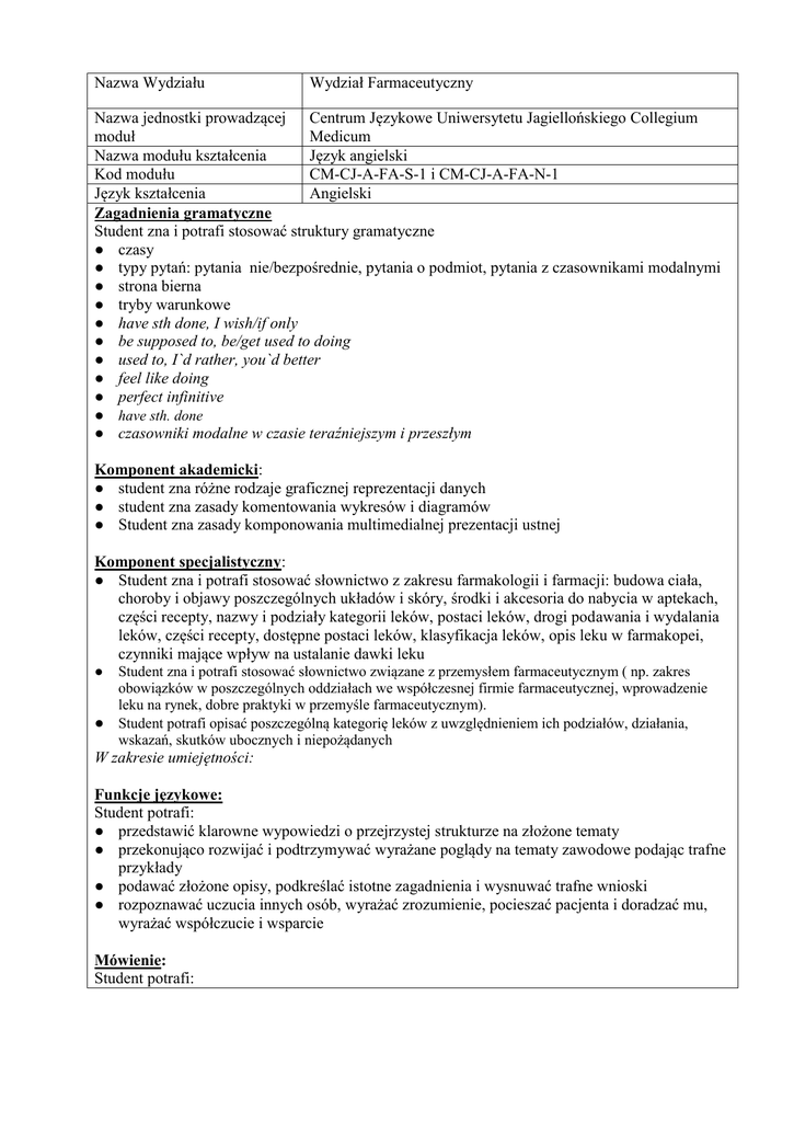 Nazwa Wydziału Wydział Farmaceutyczny Nazwa jednostki prowadzącej Centrum Językowe Uniwersytetu Jagiellońskiego Collegium moduł Medicum Nazwa modułu kształcenia Język angielski Kod modułu CM-CJ-A-FA-S-1 i CM-CJ-A-FA-N-1 Język kształcenia Angielski Zagadnienia gramatyczne Student zna i potrafi stosować struktury gramatyczne ● czasy ● typy pytań: pytania nie/bezpośrednie, pytania o podmiot, pytania z czasownikami modalnymi ● strona bierna ● tryby warunkowe ● have sth done, I wish/if only ● be supposed to, be/get used to doing ● used to, I`d rather, you`d better ● feel like doing ● perfect infinitive ● have sth. done ● czasowniki modalne w czasie teraźniejszym i przeszłym Komponent akademicki: ● student zna różne rodzaje graficznej reprezentacji danych ● student zna zasady komentowania wykresów i diagramów ● Student zna zasady komponowania multimedialnej prezentacji ustnej Komponent specjalistyczny: ● Student zna i potrafi stosować słownictwo z zakresu farmakologii i farmacji: budowa ciała, choroby i objawy poszczególnych układów i skóry, środki i akcesoria do nabycia w aptekach, części recepty, nazwy i podziały kategorii leków, postaci leków, drogi podawania i wydalania leków, części recepty, dostępne postaci leków, klasyfikacja leków, opis leku w farmakopei, czynniki mające wpływ na ustalanie dawki leku ● Student zna i potrafi stosować słownictwo związane z przemysłem farmaceutycznym ( np. zakres obowiązków w poszczególnych oddziałach we współczesnej firmie farmaceutycznej, wprowadzenie leku na rynek, dobre praktyki w przemyśle farmaceutycznym). ● Student potrafi opisać poszczególną kategorię leków z uwzględnieniem ich podziałów, działania, wskazań, skutków ubocznych i niepożądanych W zakresie umiejętności: Funkcje językowe: Student potrafi: ● przedstawić klarowne wypowiedzi o przejrzystej strukturze na złożone tematy ● przekonująco rozwijać i podtrzymywać wyrażane poglądy na tematy zawodowe podając trafne przykłady ● podawać złożone opisy, podkreślać istotne zagadnienia i wysnuwać trafne wnioski ● rozpoznawać uczucia innych osób, wyrażać zrozumienie, pocieszać pacjenta i doradzać mu, wyrażać współczucie i wsparcie Mówienie: Student potrafi: W zakresie życia codziennego: ● zaprezentować interesujące go wiadomości oraz skomentować je ustosunkowując się do nich ● rozpocząć i kontynuować i podtrzymywać rozmowę ● ustosunkować się do usłyszanych treści, wyrażając opinię i podejmując dyskusję ● umówić się na spotkanie i zmienić termin spotkania ● umówić się na spotkanie nie/formalne ● dyskutować na trudne i kontrowersyjne tematy ● prowadzić rozmowy telefoniczne ● uzyskać informacje dotyczące usług medycznych i ● zarejestrować się w jednostce medycznej, zrozumieć diagnozę lekarza ● porozumieć się w trudnych sytuacjach życiowych ● udzielać porad w trudnych sytuacjach życiowych ● opisać problemy życia codziennego i zastanowić się nad ich przyczyną ● wyrazić opinię lub wstrzymywanie się od przedstawiania własnego zdania ● wyrazić zdecydowaną opinię i zapytać się o opinię ● sugerować właściwe działania ● prosić o udzielenie informacji i reagować na nią ● uzyskiwać informacji, proponować i reagować na propozycje W zakresie języka specjalistycznego: ● definiować podstawową terminologię specjalistyczną ● opisać podstawowe choroby i objawy ● opisać odpowiednią kategorie leków ● opisać drogi podawania i wydalania leków ● przetłumaczyć tekst specjalistyczny z języka angielskiego i odwrotnie ● prowadzić rozmowę z pacjentem/klientem apteki na tematy jego stanu zdrowia w zakresie koniecznym do realizacji recepty lub zakupu leku bez recepty ● udzielić klientowi szczegółowej porady, także w sytuacjach delikatnych wymagających wrażliwości oraz jasnych i precyzyjnych informacji dotyczących zakupu leków bez recepty ● płynnie opisać zakres obowiązków farmaceuty w aptece ● poprawnie wymawiać objęte programem nauczania terminy medyczne i farmaceutyczne ● prowadzić rozmowę z pacjentem/klientem apteki na tematy jego stanu zdrowia w zakresie koniecznym do realizacji recepty lub zakupu leku bez recepty ● udzielić klientowi szczegółowej porady, także w sytuacjach delikatnych, wymagających wrażliwości oraz jasnych i precyzyjnych informacji dotyczących zakupu leków bez recepty ● wyjaśnić pacjentowi/klientowi apteki skomplikowane dla niego informacje zawarte w ulotkach lub na opakowaniach produktów sprzedawanych w aptece ● płynnie przedstawić się i opisać swój zakres obowiązków w firmie farmaceutycznej na wybranym stanowisku ● zgłaszać i wymieniać skomplikowane informacje dotyczące kwestii zawodowych i dyskutować ze współpracownikami w firmie farmaceutycznej na tematy związane z zakresem wykonywanych obowiązków (w czasie spotkań służbowych i mniej formalnych) np. zgłaszanie skutków ubocznych odpowiednim władzom ● podsumować decyzje podjętych podczas spotkania zespołu - poprawnie wymawiać objęte programem nauczania terminy medyczne, farmaceutyczne i te związane z przemysłem farmaceutycznym W zakresie języka akademickiego: ● rozmawiać o studiach i organizacji życia akademickiego ● ● ● ● ● ● ● ● ● ustosunkować się do przeczytanych treści wyrażając opinię podjąć ustalenia na temat wymagań, terminów prac itp. interpretować różne rodzaje graficznej reprezentacji danych klarownie przedstawić na forum publicznym ustną interpretację wykresu lub diagramu płynnie i bez wysiłku odpowiadać na pytania po wystąpieniu dotyczącym interpretacji danych, oraz podjąć dyskusję stosownie reagując na kontrargumenty i formułując własne wnioski zadać pytania do wystąpienia na podstawie notatek podjąć ustalenia na temat wymagań, terminów prac itp. przedstaw
