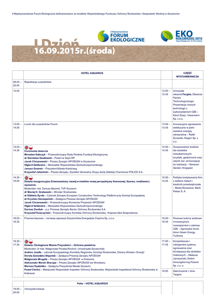 II Międzynarodowe Forum Ekologiczne dofinansowano ze środków Wojewódzkiego Funduszu Ochrony Środowiska i Gospodarki Wodnej w Szczecinie HOTEL AQUARIUS 08.00 – 20.00 Rejestracja uczestników 12.00 13.00 – 14.00 14.00 – 14.30 14.30 – 16.00 16.00 – 16.30 16.30 – 17.30 Lunch dla uczestników Forum Ceremonia otwarcia Mirosław Sobczyk – Przewodniczący Rady Polskiej Fundacji Ekologicznej dr Stanisław Gawłowski – Poseł na Sejm RP Jacek Chrzanowski – Prezes Zarządu WFOŚiGW w Szczecinie Olgierd Geblewicz – Marszałek Województwa Zachodniopomorskiego Janusz Gromek – Prezydent Miasta Kołobrzeg Krzysztof Jałosiński – Prezes Zarządu, Dyrektor Generalny Grupy Azoty Zakłady Chemiczne POLICE S.A. Debata Inauguracyjna Zrównoważony rozwój w świetlne nowej perspektywy finansowej. Szanse, możliwości, wyzwania. Moderator: red. Dariusz Baranik, TVP Szczecin dr Maciej H. Grabowski – Minister Środowiska dr Elżbieta Syrda – Członek Zarządu European Construction Technology Platform przy Komisji Europejskiej dr Krystian Szczepański – Zastępca Prezesa Zarządu NFOŚiGW Jacek Chrzanowski – Przewodniczący Konwentu Prezesów WFOŚiGW Olgierd Geblewicz – Marszałek Województwa Zachodniopomorskiego Dariusz Daniluk – p.o. Prezesa Zarządu Banku Ochrony Środowiska S.A. Krzysztof Kawczyński – Przewodniczący Komitetu Ochrony Środowiska, Krajowa Izba Gospodarcza Przerwa kawowa – na kawę zaprasza Szczecińska Energetyka Cieplna Sp. z o.o. Debata: Ekologiczne Miasta Przyszłości – Ochrona powietrza Moderator: dr hab. Małgorzata PoradaRochoń, Uniwersytet Szczeciński Andres Jaadla – członek Europejskiego Komitetu Regionów, Komisja Środowiska, Zmiany Klimatu i Energii Dorota ZawadzkaStępniak – Zastępca Prezesa Zarządu NFOŚiGW Małgorzata Mrugała – Prezes Zarządu WFOŚiGW w Krakowie Aleksander Marek Skorupa – Prezes Zarządu WFOŚiGW we Wrocławiu Mariusz Kądziołka – Zastępca Prezydenta Miasta Szczecin Paweł Ciećko – Małopolski Wojewódzki Inspektor Ochrony Środowiska, Wojewódzki Inspektorat Ochrony Środowiska w Krakowie Patio – HOTEL AQUARIUS 19.00 – 20.00 CZĘŚĆ WYSTAWIENNICZA Uroczysta kolacja 12.00 – 12.45 Uroczyste otwarcieTargów, Otwarcia Panelu Technologicznego. Prezentacja nowych technologii z wykorzystaniem OZE – Karol Szejn, Viessmann Sp. z o.o. 13.00 – 13.45 Innowacyjne ogrzewanie elektryczne w pełni zasilane energią odnawialną – Rafał Żurawski, Nogen Sp. z o.o. 14.00 – 14.45 Oczyszczalnie ścieków dla obiektów mieszkaniowych, turystyki, gastronomii oraz całych wsi: od koncepcji do realizacji – Seweryn Geisler, Kingspan 15.00 – 15.45 Polityka kredytowania firm z sektora małych i średnich przedsiębiorstw – Beata Muraszow, Bank Pekao S. A. 16.00 – 16.45 Pionowe turbiny wiatrowe innowacyjnym rozwiązaniem z zakresu OZE – Agnieszka Anioł, Airon Green Energy Turbines 17.00 – 17.45 Kompleksowe i inteligentne systemy ogrzewania oraz klimatyzacji dla obiektów hotelowych – Mateusz Jaroszyński, Daikin Aircongitioning Poland Sp. z o. o. 18.00 Zakończenie I. dnia Targów 20.00 Rozpoczęcie Gali Wieczornej Prowadzenie: red. Dariusz Baranik, TVP Szczecin 20.00 – 21.00 Wręczenie wyróżnień dla Partnerów i Sponsorów Forum 21.00 – 22.30 Występ Gwiazdy Wieczoru – zespół De Mono HOTEL AQUARIUS 12.00 – 13.30 OZE i Energetyka Gospodarka Wodna Gospodarka Odpadami CZĘŚĆ WYSTAWIENNICZA Nowoczesna Edukacja Ekologiczna 10.00 Parada Rowerowa 11.00 – 11.45 Proekologiczne środowisko biurowe w aspekcie technologii stało atramentowej i platformy ConnectKey – Leszek Bareja, XEROX POLSKA SP. Z O.O. 12.00 – 12.30 Możliwości uzyskania wsparcia w ramach RPO WZ 20142020 kto może ubiegać się o dofinansowanie – Urząd Marszałkowski Województwa Zachodniopomorskiego Finansowanie projektów w ramach POIŚ – Urząd Marszałkowski Województwa Zachodniopomorskiego 12.30 – 13.00 Legislacyjne warunki rozwoju OZE Moderator: Urszula Wojciechowska, redaktor naczelna miesięcznika CZYSTA ENERGIA 1. Perspektywy rozwoju OZE w Polsce w świetle zapisów ustawy – Grzegorz Wiśniewski, Prezes Zarządu Instytutu Energetyki Odnawialnej 2. Najważniejsze zapisy ustawy o OZE – Norbert Obrycki, Senator RP, Przewodniczący Senackiego Zespołu Energii Odnawialnej 3. Komentarz do zapisów ustawy o OZE – Maciej Kapalski, Departament Energii Odnawialnej w Ministerstwie Gospodarki 4. Czy branża energetyki wiatrowej w Polsce jest zadowolona z ustawy o OZE? – Arkadiusz Sekściński, Wiceprezes Zarządu Polskiego Stowarzyszenia Energetyki Wiatrowej 13.30 – 15.00 Lunch Debata: Planowanie strategiczne w gospodarce wodnej. Moderator: Kamil Wnuk, Rzecznik Prasowy Krajowego Zarządu Gospodarki Wodnej 1. Witold Sumisławski, Prezes Krajowego Zarządu Gospodarki Wodnej 2. Klara Ramm Szatkiewicz, Dyrektor Departamentu Planowania i Zasobów Wodnych KZGW 3. Przemysław Gruszecki, Dyrektor Departamentu Planowania i Zasobów Wodnych KZGW Debata: Recykling i Waste toEnergy w dobie wdrażania gospodarki odpadami o obiegu zamkniętym Moderator: dr hab. inż. Tadeusz Pająk, Katedra Systemów Energetycznych i Urządzeń Ochrony Środowiska, Akademia Górniczo – Hutnicza 1.Janusz Ostapiuk, Podsekretarz Stanu w Ministerstwie Środowiska 2. dr Krystian Szczepański, Zastępca Prezesa Zarządu NFOŚiGW 3. Krzysztof Kawczyński, Przewodniczący Komitetu Ochrony Środowiska, Krajowa Izba Gospodarcza 4. Piotr Barczak, Koordynator polityki ds. odpadów w Europejskim Biurze Ochrony Środowiska, Belgia 5. dr Arthur ten Wolde, Organizacja De Groene Zaak, Holandia 6. Enzo Favoino, Przewodniczący Komitetu Naukowego Stowarzyszenia Zero Waste Europe, Scoula Agraria del Parco di Monza, Włochy 7. Bogdan Ślęk, Government Affairs Lead, Philips Lighting Poland S.A. Przyszłość edukacji, czyli jak efektywnie finansować edukację i jak planować działania (strategia)? Moderator: Przedstawiciel Ministerstwa Śr